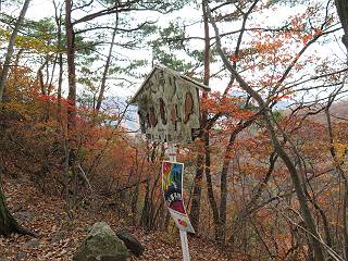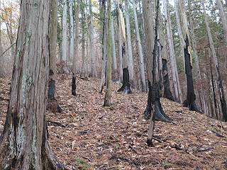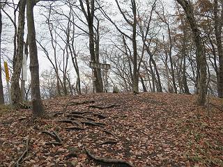 | 8080221の雑記帳TOPへ 山行日 2014年11月28日 曇り一時晴れ 単独 コース 概略図はこちら 叶花不動尊→白葉バス停→白葉峠→高萩山→小友沢ノ頭→鷹ノ巣沢→荒倉山→仙人ケ岳→熊ノ分岐→知の岳 →宗の岳→維の岳→猪子岳→猪子峠→深高山→石尊山→叶花不動尊 本山行の紅葉編はこちらです。 上越の山でも歩こうかと準備していたら、昨日になり曇天の予報、駄目か仕方ない、急遽、今春大きな山火事のあった仙人ケ岳を一回り歩くことにした、7:10不動尊前出発、7:21白葉バス停、7:42白葉峠。 叶花不動尊、前に数台の駐車スペースあり 県道218を北方向に、白葉バス停で左折、峠へ向かう 白葉峠へ向かう道 道端の石仏、祠あり 白葉峠、左手に祠 右手の法面、トラロープを伝って尾根に取り付く 標識、テープが存在するが、ブッシュの中を一直線に上がって行くようなもの、山頂直下の勾配はキツイ、おまけに山火事の跡とあって、木はよく見ないとつかまれない、8:03高萩山。 西側(群馬県)は伐採され晴れていれば眺望が良い 尾根の所々に手製の道標あり 山火事の跡も色濃く 高萩山山頂 下って県境尾根を進む、桧林をかすめ、桧と雑木の間をしばらく進む。この春の大きな山火事の跡に出る。尾根道は小さなアップダウンを繰り返すが、徐々に焼跡は色濃くなっていく、無残な光景に言葉なし、8:59一色展望台分岐、9:13鷹ノ巣沢、9:27荒倉山。 高萩山山頂から湯殿山方向を望む 県境に沿った尾根道 桧林に入り 雑木林の間を進む P399を通り 北東方向に進む この春の山火事跡が生々しく 桧はちょっと焼かれた程度でも枯れていた 一色展望台分岐を過ぎると 右手下は大きく伐採中、どんな木を植えるのかな この辺の稜線はほとんど消失 荒倉山から北方向に細い尾根を辿る、ここもひどい、高温にさらされたのか、岩まで変色してガレている。こうなると、なかなか再生が難しいのではないだろうか、9:38前仙人ケ岳分岐。ここから東方向に向きが変わり、途中の岩場に良く写真を撮ったマンサクの木があったが、一帯は黒焦げて判別がつかない。小ピークを巻いたり越えたりして、仙人ケ岳着、9:55-10:06。 表土の流出が心配 北方向に進み 前仙人ケ岳分岐点 連続する岩場を越えたり巻いたりして 仙人ケ岳山頂着 山頂部一帯の紅葉は終わり冬枯れ、春の山火事で、山頂の標識は消失しなかったが、数mの処まで火の手が及んだ形跡があった、東南の谷側は黒焦げていた。この辺が予定コースの半分かな、まだ誰にも会ってない、ウイークデー、曇天、山火事の跡とあっては、歩く人もいないか。山頂を後に、北方向に進み、赤雪山へのルートを分ける、と一人、また一人・・・出会う。この先も山火事の跡で、まだ黒焦げの木々が林立している、一部朽ちて倒れた形跡があり、強風時は注意を要す。焼け跡の向こうに見える晩期の紅葉、これもまた、不思議な光景、赤松の幼木は順調に育っている、立ち枯れの木と入れ替わる日を期待しよう、10:30熊の分岐、10:43知の岳。 北方向に進み赤雪山方面の分岐点 尾根筋は紅葉真っ盛り アブラツツジの紅葉 黄、赤、ブチと色々 ここも山火事跡、赤松の幼木は順調に育っている、奥は紅葉 一帯は強風の時は通行注意 熊の分岐、尾根伝いに進む 知の岳付近から松田湖 進む猪子岳方向 ここまで来ると、山火事の跡は目立たなくなる、登り返して知の岳を振り返ると、東側に大きく露出した岩が見える。こうなってしまうと、再生は難しいだろう、10:55宗の岳。ここからしばらく、尾根筋のアブラツツジが美しい、色とりどり、薄日の洩れる天気に回復しつつあった。11:12犬帰り巻道分岐、鎖場を降りて、11:20巻道に合流、11:23維の岳、11:40猪子岳。 宗の岳付近から知の岳東斜面、一帯は山火事跡、岩が露出した場所は草木生えず 登り返して 宗の岳 この辺からアブラツツジの真っ赤な紅葉が岩場を飾る 犬帰りの巻道分岐 奥が向かう深高山、石尊山の尾根 鎖場の前後 上がって維の岳 維の岳付近から猪子岳方向を望む 猪子岳 猪子岳の眼下に松田湖 高度も下がり、ちょっと奥にミズナラの紅葉が目に入る、猪子峠に曲がる角で小休止、11:55-12:07。枝間から眺める次のピーク深高山、山頂部は紅葉が終わり櫛のようだが、下の方はきれいだ。下って、12:23猪子峠、少々登り返して、12:35粟谷町からのコースと合流、緩やかに桧林を進む。急な義木の階段を上がり、露岩の点々尾根を進み、トラロープの張られた急斜面を直登する、間もなく深高山到着、12:56。薄日のもれるゆったりした尾根、小さいアップダウンが4,5つ連続する、13:15湯殿山分岐点、13:21石尊山。 小さなアップダウンをして東の角 枝間に深高山 南方向に下って、猪子峠 いよいよ深高山に向かう 鉄塔付近で青空が・・・ 深高山も下の方はまだまだ紅葉が・・・ アブラツツジも残ってました 急な階段を上がり 露岩の尾根へ 露岩の尾根の紅葉は終盤 トラロープを伝って 深高山山頂着 山頂から石尊山方向 紅葉のほとんど終わったゆったりした尾根道
