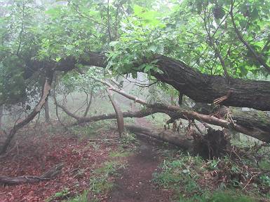 | 山行日 2017年6月9日 小雨のち曇り 単独 コース 吾妻公園駐車場→吾妻山→肩の広場→鳴神山→肩の広場→鳴神山登山口(木品)→梅田橋→天神町二丁目→ 宮本町二丁目→吾妻公園駐車場 足慣らしに足利の山を歩こうかと、織姫神社の駐車場へ、準備ができるやポツポツからザーッと強い降りに変わり、諦めて引き返す。が、しかし、雨雲の動きをみて、鳴神山なら大丈夫そうだと判断、市内に入るとポツポツとやってきたが、引き返すのを覚悟して、吾妻公園駐車場を7:38出発する、7:52登山口。下ってくる人が二人、三人・・・、8:18吾妻山に着いた時にはもう誰もいなかった、小雨は降り続いていた。汗と雨でビッショリ、時々首のタオルを絞りながら、霧煙る森の中を北進する、8:30女山、8:42村松峠、8:55標高480m地点通過、9:02鳳仙寺沢の頭、9:07自然観察の森への道を分け、9:12西方寺沢の頭、9:22岡平、9:44大形山着。 吾妻公園の駐車場を出発 竹林の横、遊歩道を道なりに上がって行くと 案内板に沿って橋を渡って進むと 登山口に出る、岩石の間を急登すると トンビ岩に出る 桐生の街が霞んでいた 緩やかな道と急坂を繰り返して 稜線に出ると山頂はすぐそこ 吾妻山山頂、ガスって何も見えなかった 北東方向に少し下って 登り返すと女山、電波反射鏡あり 同方向に下って村松峠 登り返して標高480mの道標で直角に曲がる 緩いアップダウンがあり 鳳仙寺沢の頭 緩やかな上りがあって 自然観察の森へに道を分ける 少々上って西方寺沢の頭、鳴神山まで6.3km、2時間50分の道標 左手が開け(晴れていれば眺望良好岡平) また、樹林帯に入り、倒木をくぐって 岩場の横を通り 上がって、大形山、681.5m 誰に会うでなし、眺望を楽しむ状況になく、ただ霧の中を鳴神山を目指して足を運ぶ、10:00金沢方面分岐、10:23三峰山山頂、10:43三角点、11:25やっとのこと肩の小屋、ここで小屋が目に入る。雷神(なるかみ)山を愛する会の皆さんが、汗して造ったとか、有難うございます。鳥居をくぐって濡れた岩場を進んで、11:34〜11:50鳴神山山頂。 少々下って金沢峠、 桧林を通り祠に出る その先の祠が三峰山、697m、鳴神山まで2.8kmとある ちょっと進むとピークとは感じにくい場所に三角点 その先に、鳴神山まで1.4kmの低い道標 緩い起伏の進むと 皮をむかれたリョウブ、鹿がかじったのでしょう 霧に包まれた森はまだまだ続く やっと、大きな岩に突き当たり左を回って 肩の広場に出る キツネの左に 何だ! なるかみ小舎 小さいが素晴らしい雷神(なるかみ)山を愛する会の手造りとか 鳥居をくづって鳴神山山頂に立つ、ガスって眺望なし 雨は上がっていたが眺望なし、人の気配もなし、11:56肩の広場に戻って、薄暗い杉林の木段を進む、12:14水場を過ぎる。顔に何か虫の這うのを感じ手で2,3度払う、しかし、とれない。立ち止まって爪で剥がすように捕ったら、何とマダニだった。両手にも小さいのが3匹、多分葉に触ったのかなあ、首、背中までムズムズしてきた、これは下ってからしよう、12:26中間点、12:39大滝、12:45登山口着。ダニの点検をして、ここから吾妻公園駐車場まで8.2kmの道路歩き、13:39梅田橋、14:33天神町二丁目、山手通りを西進、14:51宮本町二丁目で右折、14:59駐車場でゴールする。 肩の小屋に戻って木品(東方向)に下る 沢山降ったようだ、道が川となっていた 水場付近 岩が滑りやすいので注意 水量が豊富だと小さな滝でも迫力あり 中間点まで下山 ちょっと先に大滝 緑と岩と大滝、今日の大滝は素晴らしい 沢沿いに下って、鳴神山登山口へ ここから梅田町三丁目(梅田橋)まで県道343号線を歩く この滝も一味ありますね、滝名不詳 ここから県道66号線を天神町2丁目まで 天神町2丁目を右折 山手通りをしばらく進むと右手奥が出発点である 総所要時間は、7時間21分、総距離は約21km、暑い一日だった。ちなみに、山間が5時間07分、路上が2時間14分だった。 日付順記録へ 8080221の雑記帳へ |