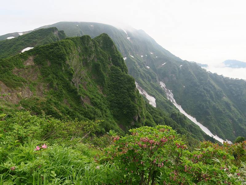 | 山行日 2017年6月27日 曇りのち晴れ 2名 コース 地図はこちら(奥武蔵のTさん提供) 六十里越登山口→鬼ケ面山→浅草岳→鬼ケ面眺め→浅草岳登山口(田子倉湖側) <ルートと実績>(奥武蔵のTさん提供) 浅草岳六十里登山口駐車場(4:49)⇒浅草岳六十里登山口(4:51)⇒マイクロ反射塔(5:42-46)⇒南岳(6:56) ⇒鬼ヶ面山(7:32-39)⇒ムジナ沢カッチ(8:36-37)⇒前岳直下・分岐点(9:26)⇒浅草岳(9:50-52)⇒ 天狗ノ庭方面散策・休憩(9:56-10:47)⇒鬼ヶ面眺メ(11:41-45)⇒田子倉只見沢登山口(12:50)⇒田子倉只見沢登山口駐車場(12:53) 1)歩行時間:8時間04分(休憩含む) 2)歩行距離:約15.0Km(AMBIT3 PEAKより) 3)累積プラス高度:約1460m(AMBIT3 PEAKより) 【六十里越登山口〜南岳】 南岳-浅草岳 浅草岳-田子倉登山口 相互リンクしている“横手の休日”の奥武蔵のTさんと浅草岳のヒメサユリの鑑賞に出かける。天気が気になるところだが、雨だけは避けたい。しかし、歩きだすとガスってしまい、日暮れの気分。でも、雲が徐々に払われ、雲海に浮かぶ山並を眺望しながら、上へ上へと。稜線に出たときは、それは、雲海と残雪の山並、綺麗な光景が広がっていた。 浅草岳登山口(田子倉湖側)、無料休憩所&駐車場 、Tさんの車を駐車して 戻って、六十里越出発 道路を斜めに挟んで登山口 いきなり、V字の道を急登 しばらくトラバースぎみに上がって行く 小さな沢を2,3越える 1つ目の鉄塔、ガスってしまった ナルコユリ タニウツギ ミズキ コケイラン ギンリョウソウ コウガイヒル、ミミズを捕食、人には無害 近くの山並と雲 前毛猛山 手前が横山、右奥が猿倉山 雲間から弱い陽が差す 電波反射板着 ここから北西方向に守門岳 西方向に裸山(手前) 南西方向には左から、毛猛山、中岳、百字ケ岳、六郎助山、この山塊の左に兎岳、小兎岳 南東方向に会津朝日岳、横山、猿倉山 タニウツギの大株 ホウチャクソウ ユキザサ また見つけちゃった、コケイラン タムシバ ウワミズザクラ 2つ目の鉄塔を通過 間もなく右折、花を探しながら高度を稼ぐ イワウチワ、点々と残っていた アカバナエンレイソウ タムシバ、花は晩期 これから咲くタムシバ マイヅルソウ クロモジの花 イワナシ カタクリ、花は晩期 サンカヨウ、雪の解けた所から開花したようだ サンカヨウ、透き通るような白さ ツバメオモト ショウジョウバカマ 灌木のトンネルを進む 間もなく稜線に出る 出るや、正面に浅草岳 辿って行く稜線 画像クリック拡大 南岳〜浅草岳 ![]() 稜線を振り返る 南岳山頂到着 【南岳〜浅草岳】 この間で出逢った花はこちら 浅草岳-田子倉登山口 ページTOP 南岳を一歩下ると、ヒメサユリのお出迎え、ミツバオウレン、イワカガミ、アカモノ、ゴゼンタチバナ、ウラジロヨウラク、サラサドウダンの共演、遠望する景色はクリヤーではないが、梅雨時の花見山行、我慢どころでしょう。難点も無いわけではない、狭い尾根道を上がったり下がったり、泥濘みあり、根っこは出ているは、視線が花にロックオンされているので、時々足をとられる。もう一つ、虫よけのネットを忘れてしまった。兎に角、虫の多い山だ、ガリガリかきながら、血をにじませながらの花見だ。でも、ヒメサユリは綺麗だ、一緒に連れて帰りたいと不埒な考え。 南岳を下ると 直にヒメサユリが迎えてくれた、一番に逢った花 ヒメサユリを観賞しながら狭い尾根道をアップダウン 時々目をやる浅草岳は雄大 南岳を振り返る 鬼ケ面山到着 鬼ケ面山前後はすでに見頃を迎えている、貉沢カッチを過ぎ、ニッコウキスゲとのコラボの見られるところで高嶺の花は消える。前岳の雪田を過ぎても浅草岳の山頂付近でも、数えるほどしか咲いてない。 浅草岳に雲がかかるが 直に通り過ぎたようだ 北岳への上り 浅草岳には薄いベール 岩場の横を通り、北岳をかすめて 急坂を下る 鞍部から北岳を振り返る 画像クリック拡大 ![]() 鞍部から北岳 同、浅草岳方面 小ピークを超え、また北岳を振り返る 画像クリック拡大 ![]() 登り返して、貉沢カッチ 貉沢カッチから辿ってきた峰々 画像クリック拡大 ![]() しばらく灌木の間を緩やかに進む 時々岩間から下方を眺める 田子倉湖 ヒメサユリとニッコウキスゲの共演 振り向いて一枚 登り返して、大きなイチイを抜け、 前岳直下ネズモチコースと合流 残雪を下って合流点へ この先で、大きな雪渓を上がる 雪渓を渡る風は心地よい 雪渓上部から浅草岳山頂 直下の湿原から守門岳をバックにワタスゲ 浅草岳山頂到着 【浅草岳〜田子倉登山口】 南岳-浅草岳 ページTOP 山頂には10人-20人ほど、平日であり、ネットの天気・開花情報等で手控えたのか意外に少ない。花々&眺望を十分楽しみ、同行した奥武蔵のTさんも念願かなったようで、満足顔だった、1時間ほどの散策&休憩、時間的にはちょっと早いが、山頂を後にする。 山頂から南〜東方向の展望 画像クリック拡大 ![]() 越後駒ケ岳周辺 越後駒ケ岳周辺 山頂のちょっと下で休憩 田子倉湖方面 山頂から北東方向に湿原まで標高差で100mほど下りながら、花探し キ