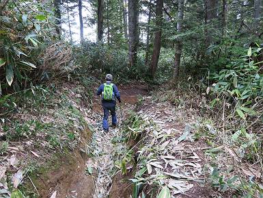 | 山行日 2017年9月15日 曇りのち時々薄日 単独 コース 概略図はこちら(図中の赤線が歩行、緑線がシャトルバス利用) 大清水休憩所→一ノ瀬休憩所→三平峠→三平下(尾瀬沼山荘)→長蔵小屋→長英新道登山口→俎(マナイタ)ー→熊沢田代→ 広沢田代→御池⇒(シャトルバス)⇒沼山休憩所→沼山峠→長蔵小屋→尾瀬沼山荘→三平峠→一ノ瀬休憩所⇒(シャトルバス)⇒ 大清水休憩所 九月も半ば、そろそろ尾瀬も紅葉が始まっているのでは、到着が早かったので一寝入り、夜行バスの音に起こされて、大清水休憩所を4:06出発する。後を追うように若い男性がついてくる、4:50一ノ瀬休憩所着。シャトルバスの発着場になっているようだ、時刻表を撮って歩きだすと、ベンチで休んでいた男性がまた後からついてくる、橋を渡って、4:53登山口。山間に入って、ヘッドライトの下、5:04冬路沢の小橋を渡り、5:14岩清水で給水、ヘッドランプをザックへ、この辺から勾配を増し木段、石段を上りシラビソの森に入って緩やかに進めば、5:40三平峠、峠から高低差100m、木段を下ると、5:53三平下で尾瀬沼に出る。 出発&ゴールとなる大清水休憩所、標高1180m その奥にゲート、一般車通行止め、脇から林道へ シャトルバスが走っているせいかダートながら歩きやすい、一ノ瀬休憩所は発着場となっているようだ 橋の上で、ヘッドランプに光るものが? 雨だ、大したことないだろう、 登山口へ、ここから山道 壊れた木道を気にしつつ進む、冬路沢を渡って、 ジグザグしながら進むと岩清水(水場) この辺まで過去に林道工事が進行し平坦になっている、ここから木段、石段を上がって シラビソの樹林帯に入って緩やかになると 1762mの三平峠 下って三平下、誰もいない、燧ケ岳は全く見えない 沼尻からナデッ窪コースを長英新道に変更 燧ケ岳は深い雲の中、天空も陽のさす気配なし、沼尻からナデッ窪コースで燧ケ岳を目指す予定を変更して、左回りで長英新道を上る。沼田街道を歩いて、6:11長蔵小屋、6:17沼山街道と分かれて、大江川にかかる橋を渡る。紅葉の進んだ大江湿原を眺め、左手に三本カラマツを見て、シラビソの森に入る、ほぼ沼に沿って進み工事中の防護柵を抜ければ、6:30長英新道の分岐点、ついでに浅湖湿原を見るが燧ケ岳は相変わらず。長英新道は緩やかに、じめじめした道を進み、木段が現れると徐々に勾配を増していく。 木道沿いに花々が残っていた、トリカブト ミヤマアキノキリンソウ ウメバチソウ こんな道あったっけ? 長蔵小屋方面に入る、一部陽がさしてきた 長蔵小屋の前で工事中 デッカイ重機、どこから持ち込んだのかなあ、空から? 尾瀬沼周辺の浅い草紅葉 長英新道方面と沼山街道の分岐点 ワレモコウ イワショウブ 大江湿原方向 尾瀬沼方向 大江川にかかる橋と三本カラマツ 大江川 周辺の紅葉初期 オオカメノキの実 鹿防護柵工事中 長英新道分岐点 浅湖湿原、燧ケ岳寄り 浅湖湿原、尾瀬沼側 長英新道に入る ゴゼンタチバナの実 早いなあ、下山者一人 シラビソの数を減らし、樹間から眼下に尾瀬沼を望む、ここで小休止して遅い朝飯。南の方は明るいが、天空は重い雲、森はこの辺からシラビソからダケカンバに変わってきた。薄日が時々さすようになり、多少期待できるかな、って気分。U字の道の法面にはオヤマリンドウが残っていた。梯子状の階段を4,5ヶ所越えると、肩のような場所に出る、この辺は紅葉の輝く場所なのだ。再び連続する木段を上がれば、9:31ミノブチ岳山頂に出る、しかし、ガスって何も見えない。風冷たく、ハイマツ帯を進むと、ナデッ窪コースを合せ、燧ケ岳の岩場へ進む。 登山道は勾配を増す 樹林帯の隙間? から尾瀬沼 シラビソの森から抜け ガケカンバに こんな木段が点々と オヤマリンドウ 肩のような場所へ出る、この辺は紅葉の綺麗なところ この先が ミノブチ岳、ガスって何も見えず右方向へ 緩やかにハイマツ帯を進む ナデッ窪コースを合せる 赤ナグレ岳の北側のピークと爼ーの鞍部に出て、真っすぐ南から岩場を登り上げれば山頂であるが、変化する景色を堪能しながら歩くなら楽しいが、ガスっていては、岩場に記されたマークを必死に追いながらの足の運びとなる、8:56燧ケ岳爼ー到着。居合わせた先客が5名ほど、たちまち10名を超えた。1〜2時間待てば晴れるのなら柴安ーを往復するが、そんな感じはしない、9:06柴安ーをパスして御池に下る。 マルバダケブキ、ナンブアザミの変種トネアザミ(タイアザミ) この辺から岩、岩 だんだん大きな岩に 俎(マナイタ)ーの山頂が見えた 俎(マナイタ)ーの山頂 、ガスって何も見えず、柴安俎ーをパスして下山 ペイントマークに従って、岩場からハイマツ帯、ガレ場を下る。御池から上ってくる人は多く熊沢田代が見える位置までに20-25人会ったが、挨拶代わりに「山頂がガス?」、「やっぱり・・・」の会話、下方は薄日が時々さして草紅葉が輝いて見える。熊沢田代は本日一番の眺めだ、9:57熊沢田代1950m着。東の山並は薄っすらと、南