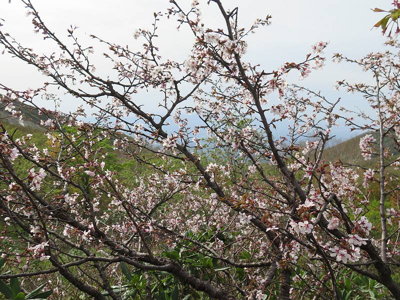 | 山行日 2018年5月26日 晴れ 単独 コース 概略図はこちら 大丸温泉駐車場スキー場入口→殺生石牛ケ首コース合流点→牛ケ首→日の出平→牛ケ首→峰の茶屋跡避難小屋→ 朝日の肩→朝日岳→朝日の肩→清水平→北温泉分岐→三本槍岳→北温泉分岐→(中の大倉尾根)→北温泉→大丸温泉駐車場 【前編:大丸温泉駐車場〜三本槍岳】 【後編:三本槍岳〜北温泉→大丸温泉駐車場】へ やっと山行機会到来、でも情報だとミネザクラが終わってしまった感じ、標高差もあることだし、寝坊もいることだし、どこかで逢えるだろう。状況によりエスケープしやすいように大丸温泉からのスタートとする、4:23大丸温泉駐車場スキー場入口出発。ネマガリダケをかぶりながら早朝の道を行く、4:30スキー場、4:50殺生石からの道に合流、ここからは大勢歩いているようだ。真っ赤なヤマツツジが点々と、つられて高度を上げていく、隣の山のシロヤシオが目に入る、広大な斜面全体に咲いているようだ、スゴイ、間もなく、5:43飯盛温泉跡。一帯で、イワカガミ、ムラサキヤシオ、オオカメノキは点々と、サンカヨウを探したが見当たらず。新緑の灌木を抜けると茶臼岳がドンと現れる、6:28牛ケ首。ここは風の通り道だ、サムーイ&寒い、着込んで前進。 Pから道路を挟んで大丸温泉駐車場スキー場入口 スキー場と茶臼岳 スキー場の南端に牛ケ首への道標 鮮やかなヤマツツジに足を止める 晴れ清水の湧き口と流れ 殺生石からの道に合流 これも素晴らしいヤマツツジ フキノトウの種も熟して ベニサラサドウダン マイヅルソウ ムラサキヤシオ 南月山北面のシロヤシオ ガレた道を通り 飯盛温泉跡 ヒメイワカガミ ムラサキヤシオ スミレ 新緑の間を抜ける オオカメノキの花が一際目立つ 茶臼岳、すっかり新緑の季節、ミネザクラは? 牛ケ首 一面緑に包まれた山肌、これではミネザクラどころではない、でも日の出平まで行けば残りものに逢えるだろう。景色を楽しみながら、足元の花を探しながら進むと、パッとミネザクラの大株が目に入った、素晴らしい株立ちだ。多くを期待して、岩場を越え、平坦になった所で見渡すも、葉桜の群落、6:47日の出平着。南月山方面、沼原方面の道を行ったり来たりしたけれど、楽しめる花はなく、7:11牛ケ首に戻る。 牛ケ首から流石山方面 茶臼岳を背にミネザクラ、この大株を残して他は葉桜 足元に、シロバナエンレイソウ ちょっと登り返して岩の上から望む 画像クリック拡大 平坦になって日の出平 点々と咲き残りが見られましたが・・・ アンテナ付近からの展望 画像クリック拡大 日の出平から戻り道、 ムラサキヤシオと茶臼岳 茶臼岳の西側を巻いて進む、避難小屋経由で上がってくる人が増える、何処へ行くのだろう? 南を回って茶臼岳山頂かな? でも、ミネザクラの花を問う人はいない、こちらからも話さない、7:28避難小屋。この時間になると、駐車場から真っすぐ上がって来る人で30-40人、大半が朝日岳方面に散って行く。私も先へ進めば何かに逢えるだろう、期待して前進、7:49朝日の肩、8:00朝日岳、8:09朝日の肩に戻る、8:16熊見曽根、風も静かになったので、ここで小休止。眺望を楽しんでいると藪の中に真っ赤なシャクナゲの蕾が目に入る。そうだ、シャクナゲも楽しめそうだ。 牛ケ首に戻る 茶臼岳の西側を巻く、南月山と日の出平 茶臼岳の噴煙 巻き道 会津駒ケ岳遠望 画像クリック拡大 峰の茶屋跡避難小屋と剣が峰&朝日岳 避難小屋から茶臼岳 避難小屋を振り返りながら剣が峰の東側を巻く 稜線から剣が峰と茶臼岳 ここから朝日岳の西側を巻く、クサリ場が連続する 稜線目指して礫を踏む 朝日の肩、稜線に出る 朝日岳山頂を往復する 朝日岳山頂から茶臼岳 朝日岳山頂から三本槍岳、旭岳 会津駒ケ岳方面遠望 一段下って茶臼岳 朝日の肩に戻る 朝日岳を振り返る 少々登り返して熊見曽根 ここから隠居倉、山斗小屋方面分岐 熊見曽根から茶臼岳&日の出平 同、朝日岳 同、三本槍岳 隣の1900m峰は近い、8:32ピーク、三本槍岳、清水平を眺めながら下る、咲き始めたシャクナゲ、まだ咲いているミネザクラに快調に進む、8:51清水平、9:00北温泉分岐、朝日岳1.5km、三本槍岳0.9km、北温泉5.1kmと道標にある。花を楽しみ、山並を眺めながら汗をかく、9:29三本槍岳着。 小休止して次のピークへ 1900m峰 1900m峰から茶臼岳 朝日岳 同、三本槍岳 同、朝日岳&茶臼岳 1900m峰を後に清水平へ下る、シャクナゲの開き始め 清水平を一望する 窪地の残雪 窪地の残雪、こちらは大きい 清水平を一望する、ちょっと早いシャクナゲの群落、その奥にミネザクラ 清水平からミネザクラと1900m峰 清水平道標から1900m峰、左は朝日岳 U字の道を少し進むと 北温泉分岐 分岐から振り返る、朝日岳、茶臼岳、1900m峰 しばらくハイマツの間を抜ける、ミネザクラ、シャクナゲが点々と シャクナゲの群落と三本槍岳 U&Vの道を抜けると 急峻な旭岳が現れる ミネザクラと旭岳 ミネザクラと三本槍岳、ここまで来れば山頂は目と鼻の先 ところが、