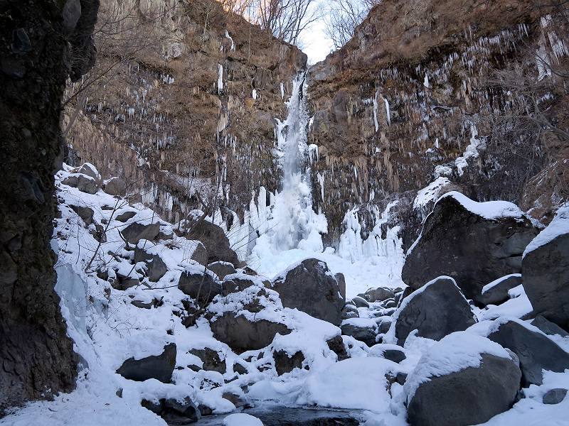 | 山行日 2018年2月7日 晴れ 単独 コース 林道駐車スペース→不動大橋→不動大滝→不動大橋→林道駐車点 何年ぶりになろうか、ここ数日冷え込んだので、滝つぼが凍って絶景が見えるだろう。工事中の看板を気にしつつ登山道を探しながら進む。アイゼンを装着し、しっかりついたトレースを頼りに進むと、あっけなく大きな岩陰から不動大滝が現れた。上空は風が鳴っているが、滝周辺は静かだった,、景色は素晴らしかった。 林道脇の駐車スペース、工事中の林道を進み、不動大橋を渡り右折、 粕川を上流方向に右岸を進む 振り向くと不動大橋 古い道標が生きている 岩壁を回り込むと、落差50mの不動大滝が現れる この辺で左岸にわたる 左岸から不動大滝 ちょっと進んで、また一枚 瀧の直下で、また右岸にわたる、見上げるとつららだらけ、崩落したつららの残骸が沢山転がっている、日中は要注意 右岸から不動大滝 ![]() 滝の上部 滝つぼ周辺 同類が一人やってきました 直下から見上げて撮りました 東側に回って横から撮りました 陽が差してきました、大きな木が見事でした 粕川の流れを・・・・・ 往路を戻り 不動大橋に出ました、10分ほどで駐車点です。 総所要時間は、1時間27分、山道が極端に短くなってしまい、楽しみが半減した感じ。 日付順記録へ 8080221の雑記帳へ |