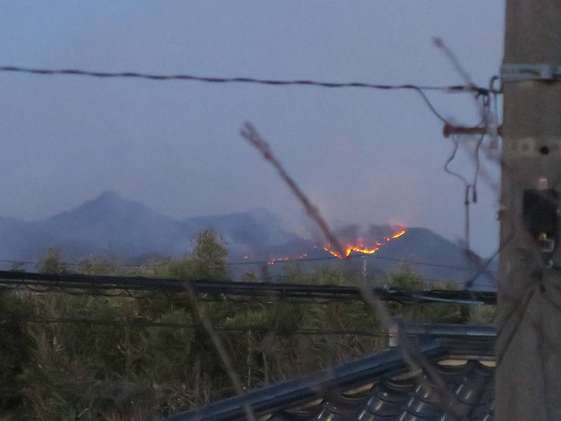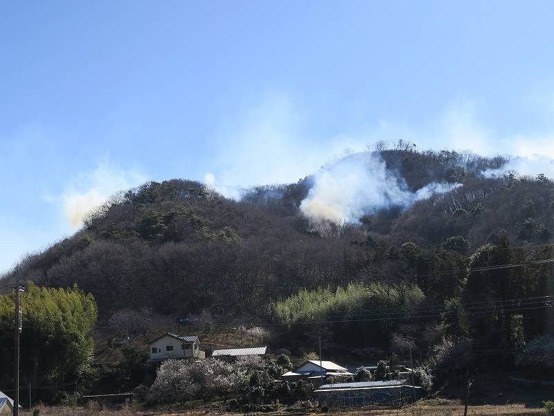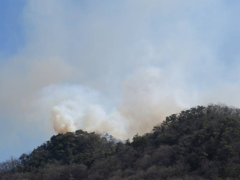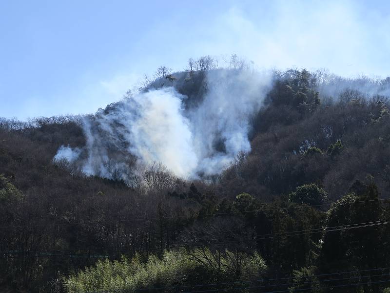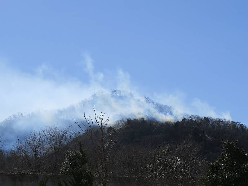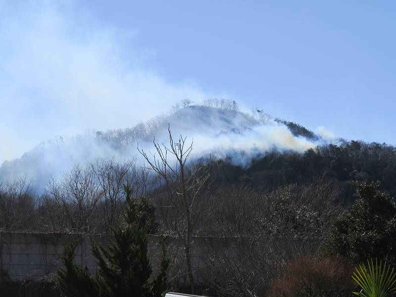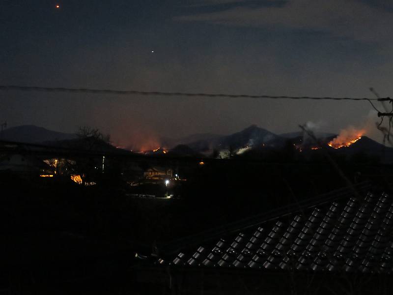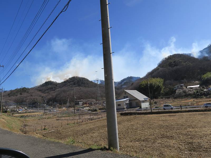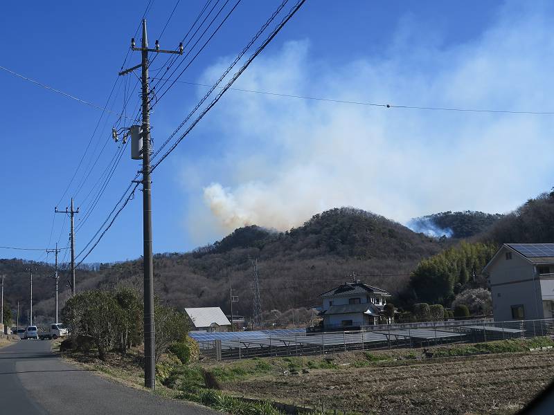 栃木県足利市両崖山休憩所付近から発生したらしい山火事は、発生から5日目、本日に至っても鎮火の見通しがたたないようです。この写真は2/24の10時頃足利市大岩町、及び同日18時頃我が家の2階から撮ったものです。
