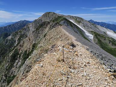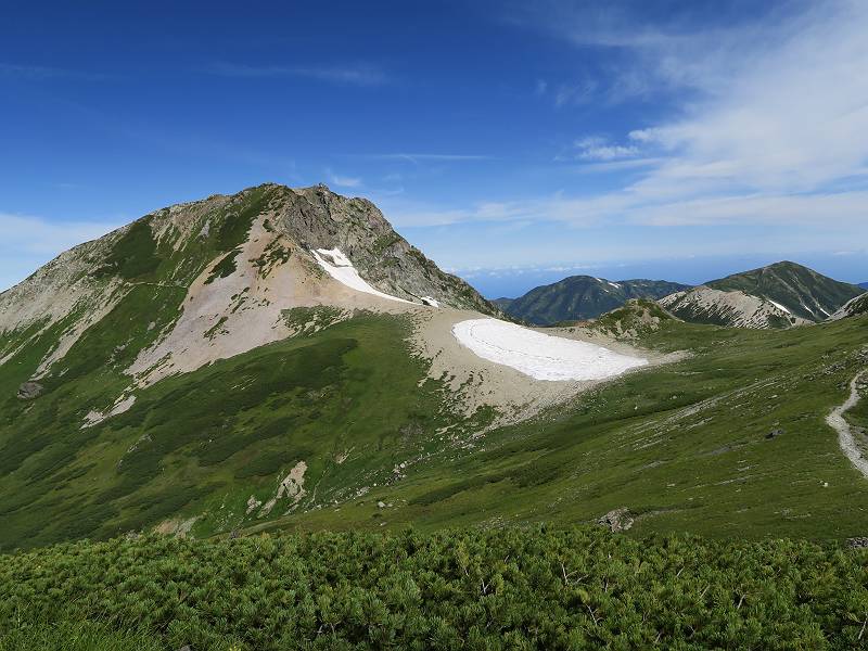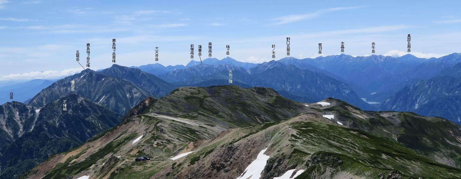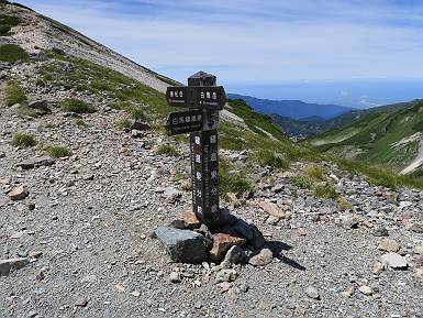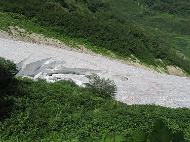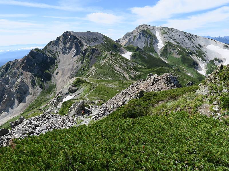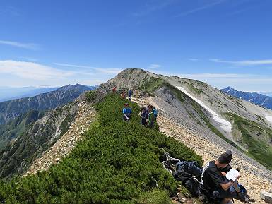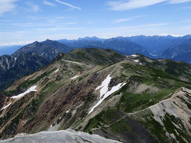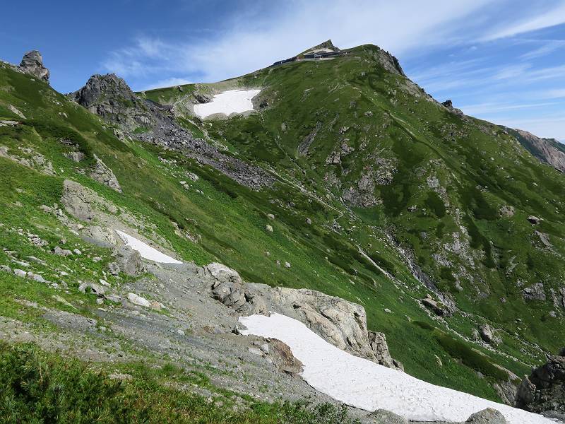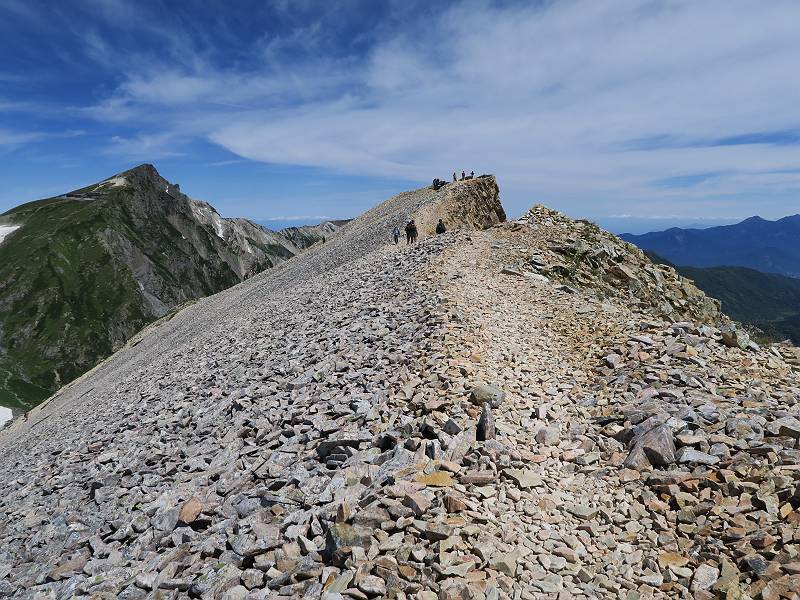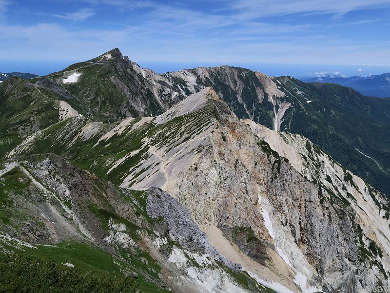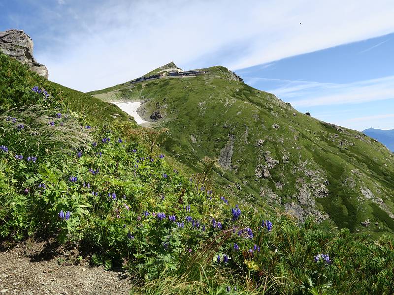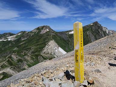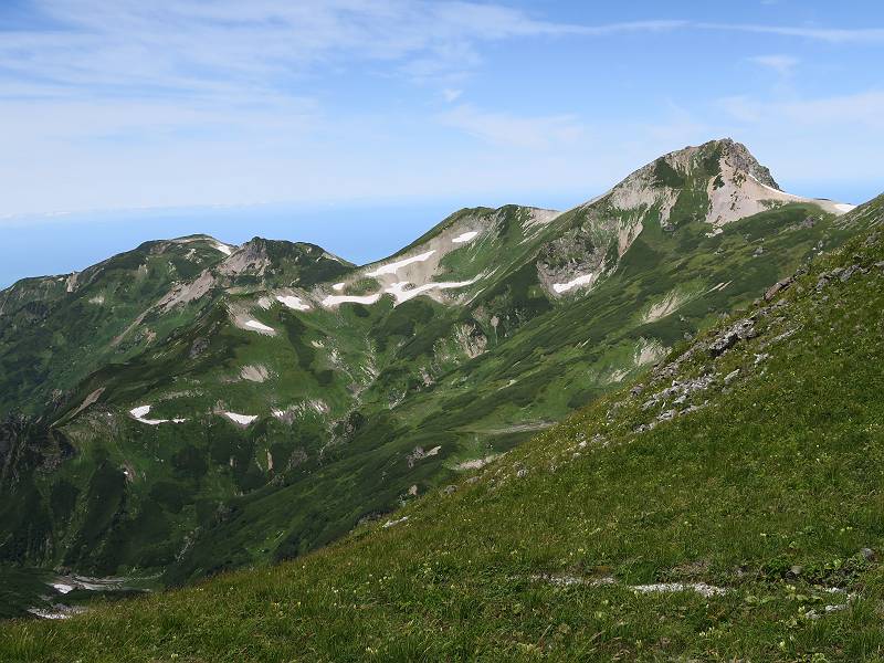 【後編:白馬岳〜鑓温泉〜猿倉】 【前編:猿倉〜白馬岳】へ ミヤマアケボノソウが咲き残っているかな、と思い迂回してみたが、終わっていた、9:03-9:07白馬山荘、9:16旭岳分岐、9:28丸山、9:50杓子岳との鞍部、10:12-10:21巻道分岐点で小休止、若いペアーが抜いていった。立ち上がって二人を追う、10:37-10:41杓子、追いついたが、あとが続かない。南方向に緩やかに下る、10:52巻道と合流、その先で登り返し、11:15-11:23標柱(?)の脇で、景色に見とれて小休止、次は山頂までノンストップで、11:44-11:53鑓ケ岳、キツーイ。 賑わう白馬岳の山頂を後に、ちょっと下り、一帯の開発の祖のレリーフの前から縁に沿って下る 山頂の南側の顔を眺める 画像クリック拡大 ![]() 山荘の南側を回って往路に出る 山荘の前から一望する 画像クリック拡大 ![]() これから向かう杓子岳と鑓ケ岳 西に旭岳 剱岳と毛勝三山の間、遥か遠くに白山を展望する 登山道に戻って、右手に清水岳への道を分け 左下方にテン場を ずっしりした感じの旭岳、右奥に雪倉岳 ちょっと拡大して、右に雪倉岳、左奥に朝日岳 一帯に多い黄色の強いトウヤクリンドウ 丸山山頂、山座同定中?、こりゃ、失礼しました 丸山山頂から杓子岳&鑓ケ岳、直に取り付けそうですが鞍部まで150m下り、200m登り返す 同、旭岳 同、白馬岳 丸山を下って鞍部付近から杓子岳&鑓ケ岳 同、立山&剱岳 この辺まで離れると、バカデカイ山荘も山本体に飲み込まれ、景観への影響も緩和される この辺が鞍部かな? 大雪渓を覘き込む いる、いる、いる・・・、ざっと50-60人見えますね 杓子岳巻道分岐点、ここで小休止 富山湾&能登半島、直線距離では30km、60kmほどかな グズグズの小石の道を登り返して杓子岳山頂着 山頂北側突端から白馬岳、小蓮華山 突端から北側一望 画像クリック拡大 ![]() 南方向へ、ヤセオネ下る、ガスがかかると危なそうな道 山頂からちょっと下って振り返る、杓子岳と左奥の白馬岳 巻道と合流して 鑓ケ岳へ登り返す 杓子岳を振り返る 左に清水岳〜旭岳 清水岳〜杓子岳 画像クリック拡大 一見、緑豊かに見えるが、厳しい条件下にあり ちょっと頑張って、標柱(?)の脇で小休止 真下に白馬村の中心部 東方向を一望 画像クリック拡大 雨飾山〜浅間山 同、杓子岳、白馬岳 清水岳〜旭岳 回り込むように進んで、鑓ケ岳山頂分岐点 槍ヶ岳方向一望 画像クリック部分拡大 立山方向一望 画像クリック部分拡大 鑓ケ岳山頂到着 白馬岳方向一望 画像クリック拡大 ![]() 杓子岳、白馬岳、小蓮華山 南〜西方向展望 画像クリック拡大 ![]() 白馬岳から鑓ケ岳まで、休憩を入れても結果的には2時間30分ほど、決してペースは遅くはない、縦走路を下り小ピークを巻いて、12:12主稜線からの降下点を左に折れる。ジグザグ下って、あっという間、12:31大出原、残り花を観ながら灌木帯の入り口まで、ここでストックをザックに、クサリ場の通過に備える。危険度からしたら、ここが一番いやらしい場所、まだ安心できる段階ではない、13:43-13:59鑓温泉で足湯につかる。 南下途中から鑓ケ岳を振り返る 鑓温泉分岐点 鑓ケ岳を見上げながら大出原へ下る 画像クリック拡大 ![]() 花はほとんど終わり、クルマユリ、ミヤマキンポウゲは真っ盛りだった エゾシオガマ ミヤマアキノキリンソウとチングルマの綿毛 鑓ケ岳を見上げながら クルマユリとミヤマキンポウゲの群落 一休みして、鑓温泉への急坂に備える クサリ場が連続、ツルツルの岩 鑓温泉が見えても、まだしばらく危険地帯 足湯に入って、猿倉までの長い道程に・・・ 温泉は、今の時間、もう混雑している様子、皆若い、テン泊も沢山いるようだ、一人ジジイが足湯につかっていると、「歳いくつ?」、「尾畠春夫さんより2つ若いんだ」、分かったかな? さあ、出発だ、あとコースタイムで3時間、ダラダラ道の下り、17時前後に着けるだろう。鑓沢、杓子沢を渡るのを心配したが、雪上は通らず、橋がかけてあった。上ってくる若い団体、台湾からだそうだ。この時間、下る人は少ない、ヒーヒー言いながら下る人にも会う、14:46杓子沢、15:03三白沢、15:33小日向のコル、辿った三山を眺め、あと残りの行程1時間半、ガンバルぞー。 鑓沢を越え 灌木の林を抜け 杓子沢を渡って 少々登り返した所から杓子沢を眺める まだまだ続く湿地帯の中、花を眺めながら・・・ ウメバチソウ オオバギボウシ シモツケソウ サラシナショウマ 少々上って、小日向のコル イワショウブが点々と 白馬三山を並べて一望 画像クリック拡大 ![]() 悪路が延々と続く 小さな沼が点々と道沿いに ガクアジサイはきれいだった やっと林道へ 大疲れさま、猿倉の駐車場着 16:51鑓温泉分岐、17:01猿倉荘、17:05駐車場、大へんお疲れの人にも会った、私は、やっとこかな、でも明るいうちに帰れた、総所要時間は、13時間18分、山地図の設定は甘いようだ。 【前編:猿倉〜白馬岳】へ 日付順記録へ 8080221の雑記帳へ |