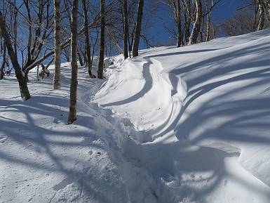 | 山行日 2019年1月30日 晴れ 単独 コース 小沼駐車場→小沼→長七郎山→小地蔵岳→鳥居峠→覚満淵→大沼→地蔵岳登山口→地蔵岳→八丁峠→小沼駐車場 降りましたね、天気も穏やかだとか。スノーシュー、10本爪アイゼン、チエーン式アイゼンを持って、思い切り着込んで暖房不調の車で出かける。昨日一昨日と吹雪いたようで、山中には大きな吹き溜まりが見えた。陽が上がり風弱く、−10℃も寒さを感じない、7:06スノーシューを付けてダブルストック、小沼駐車場を出発する。氷上を横断して沼尻寸前、例年大きな吹き溜まりのできる場所、まだシャーペット状の薄い氷、ペチャ、ペチャ、ペジャ、水は入らなかったようだ。林道を回り込んで、7:23長七郎山登山口。 小沼P、−10℃、黄色い車が1台あり、支度をしていたらお帰りの様子 朝焼けの地蔵岳、小沼氷上から 氷上を横断して、沼尻へ スノーシューでシャーペット状の氷を踏み抜いてしまった、振り向けば黒檜山 山間に入るや、それでもあちらこちらに吹き溜まり、まだ容易に乗り越えられる大きさだ。でも、時々林間に入り、ザックを引っかけてオットットを繰り返す、雑木林を抜け緩やかな斜面に出ると眺望が開け、振り向けば荒山、浅間山、谷川岳、富士山を遠望する、7:57長七郎山着。駐車場に居た男性は北回りで日の出の写真でも、と思ったが踏み跡はなかった。 長七郎山登山口 登山道は所々に吹き溜まり 林間から広々した山頂直下へ 荒山、右遠方に浅間山、四阿山、草津白根山 直下の低木の間抜ける 地蔵岳の東側、右遠方に谷川岳 谷川岳 富士山遠望 長七郎山着 山頂北側から黒檜山を眺める、林間には大量の雪、登山道には雪庇が出来、風紋と交差する大枝小枝の陰、上越の山のそれとは比較にならないが、風物詩を探勝するにはまあまあだ、危険はないし。雑木林をかすめながら出たり入ったり、何とも言えない自然の造形美を一人で楽しんだ。鞍部から日光白根山、一部しか見えないのだが、折り重なる山々に支えられ、これまた、高さがあるだけに雄大だ。 長七郎山頂から黒檜山&駒ケ岳、右遠方に日光白根山、皇海山、袈裟丸山 日光白根山、皇海山 北側斜面にできた雪庇を眺めながら小地蔵岳へ 雪庇を抜け鞍部から日光白根山 鞍部付近は風の通り道、地肌が露出し凍てついていた、8:31小地蔵岳分岐点、登り返して雪深い雑木の中を進む。スノーシューで楽しむには絶好の地形だ、汗を拭きながら前進、平坦な山頂部に出ると小地蔵岳、8:45着。ここから地図には道がないのだが、尾根筋をジグザグ下って鳥居峠に出る。中間付近までは順調に下ったが、まだ雪が少なく表面が凍っていて、スノーシューが横滑りする。危険を回避し、10本爪のアイゼンに交換、9:30鳥居峠着。 小地蔵岳分岐点から 笹の隠れた雑木林を進む 所々でスノーシューが40−50cn沈む 小地蔵岳山頂 北側の雑木林を正面に黒檜山、鳥居峠目指して急降下 黒檜山、手前に駒ケ岳が重なる、右方に日光白根山、皇海山、袈裟丸山 日光白根山 半分ほど下った所で、凍った斜面に危険を感じ、アイゼンに替えて鳥居峠着 覚満淵の今は静かだ、雪のせいかな、トレースはない。老体の踏み跡を残し、先日楽しんだ大沼に入る。一面真っ白、クリヤーな青い氷はもうない。ウイークデーなので釣り人も少ない。中ほどでUターン、地蔵岳の登山口に進む、10:29-10:39休憩。 鳥居峠から大沼&覚満淵 覚満淵へ出るまでが・・・・ 覚満淵の氷上を横断 登山道は深い雪の下、道路に出るまで 駒ケ岳登山口を横に見て 大沼氷上へ 大沼氷上は雪に被われていた トレースを頼りに、急坂を上がる、さぞ往生したことでしょう、お陰様で・・・。しばらく奮闘し、中間の緩やかな斜面へ、ここで旧赤城青少年の家からのルートを合せ、100mほど上がると山頂から北西に見える1620mの小ピーク、周辺の景色を楽しみながら山頂に向かう。暖かい日差しの影響でしょうか、時々深みにはまって、往生する。最後の雑木林を抜け、やっと礫の散乱する山頂直下へ、ここはロープウェイ駅のあった付近だ。東側へ回り込んで、山頂へ、12:05-12:41休憩。南側は少々ガスっているが、北〜西の眺望は素晴らしい。何名かの踏み跡はあるが、男性が一人だけ。 戻って、旧赤城神社付近から地蔵岳登山口へ、 ここで休憩して急斜面のトレースのついた登山道へ この上は開けた緩やかな斜面 黒檜山、駒ケ岳を振り返る また、少々雑木林の中を 抜けると、岩のゴロゴロした山頂直下に出る 黒檜山の左に燧ケ岳 山頂直下からの眺望 画像クリック拡大 万太郎山〜駒ケ岳 ![]() 燧ケ岳 笠ケ岳、至仏山 武尊山 朝日岳、巻機山方面 谷川岳方面 仙ノ倉山、万太郎山、谷川岳方面 仙ノ倉山、万太郎山、谷川岳、朝日岳、巻機山方面がクッキリ 礫を越え地蔵岳山頂へ 地蔵岳山頂 山頂のアンテナ群 地蔵岳山頂からの眺望 画像クリック拡大 大源太山〜巻機山 ![]() 武尊山、至仏山、燧ケ岳 地蔵岳山頂からの眺望 画像クリック拡大 苗場山〜至仏山 ![