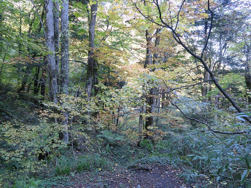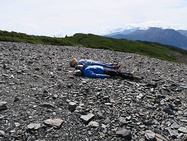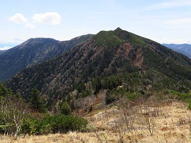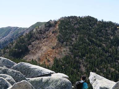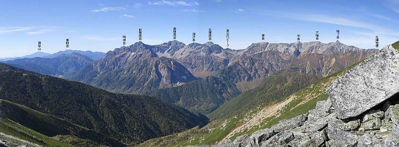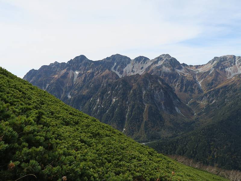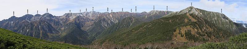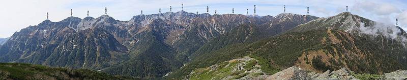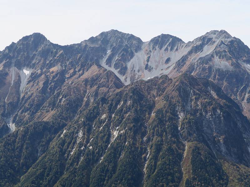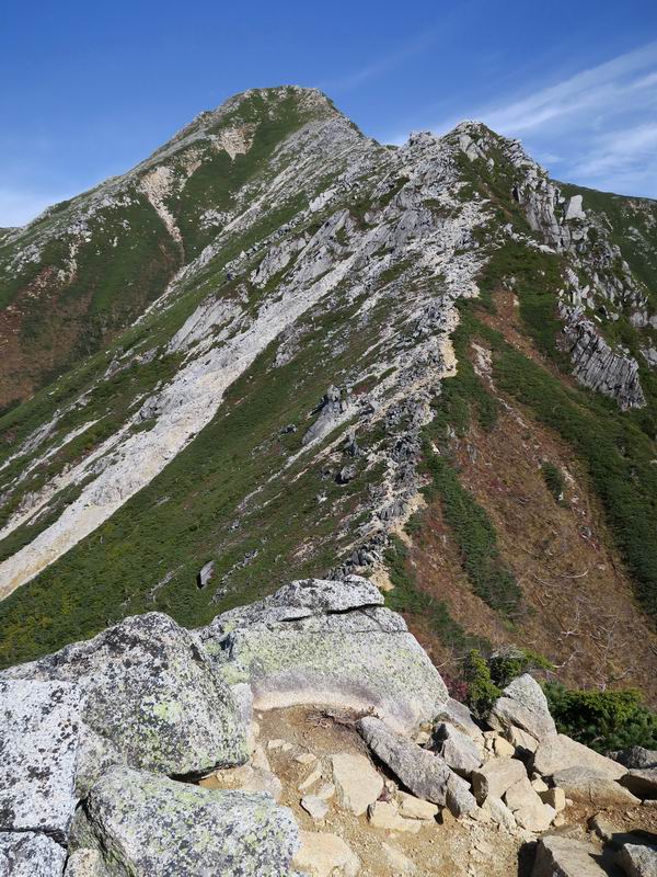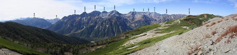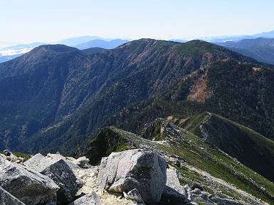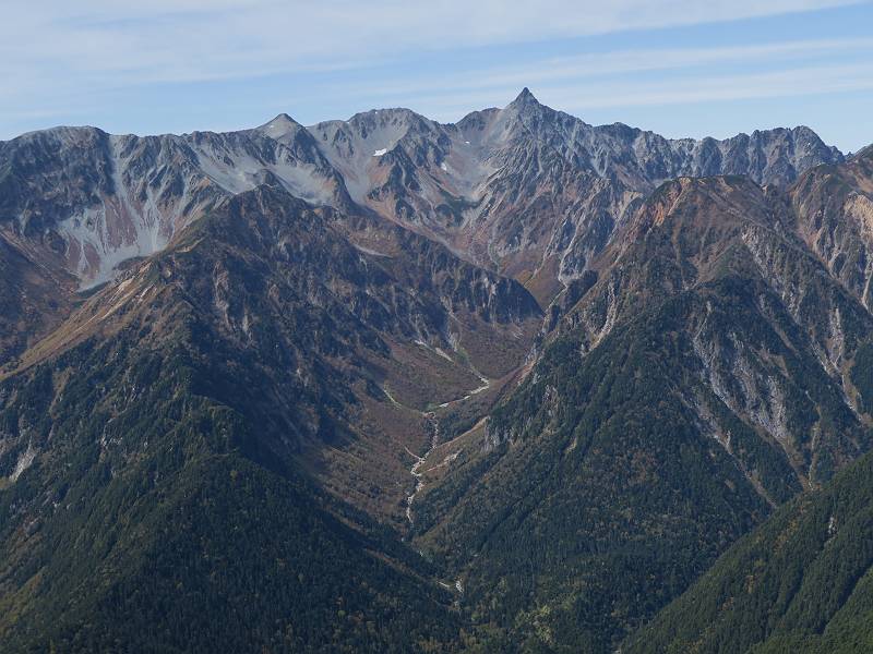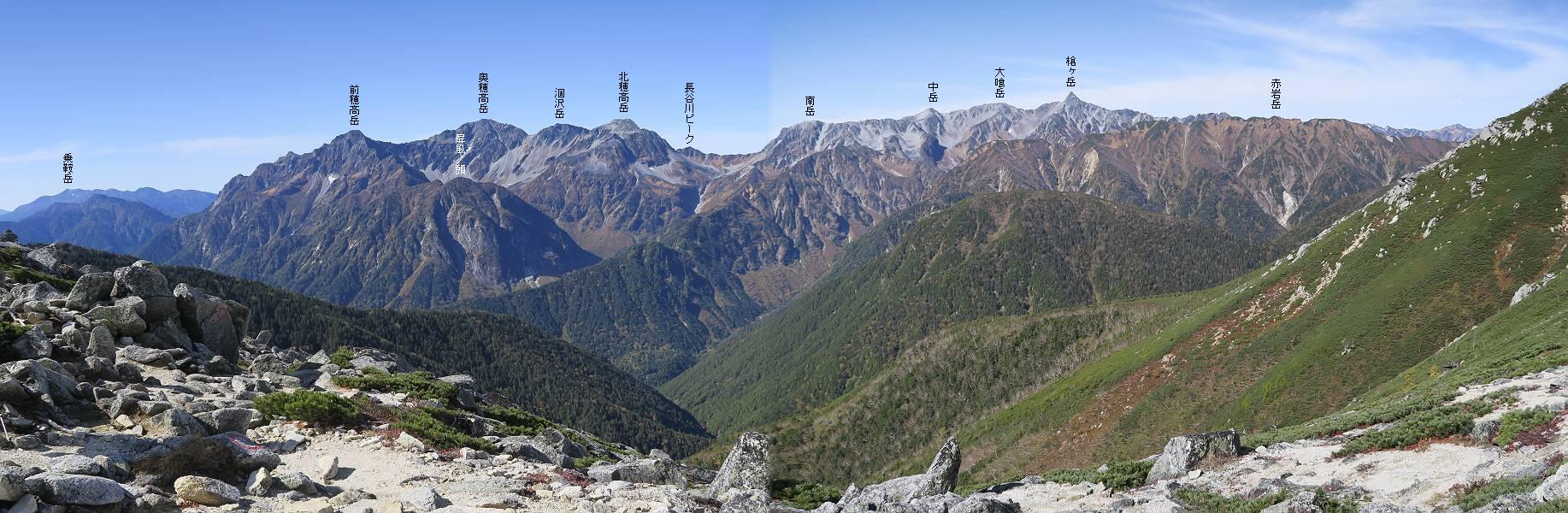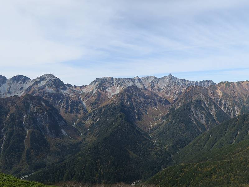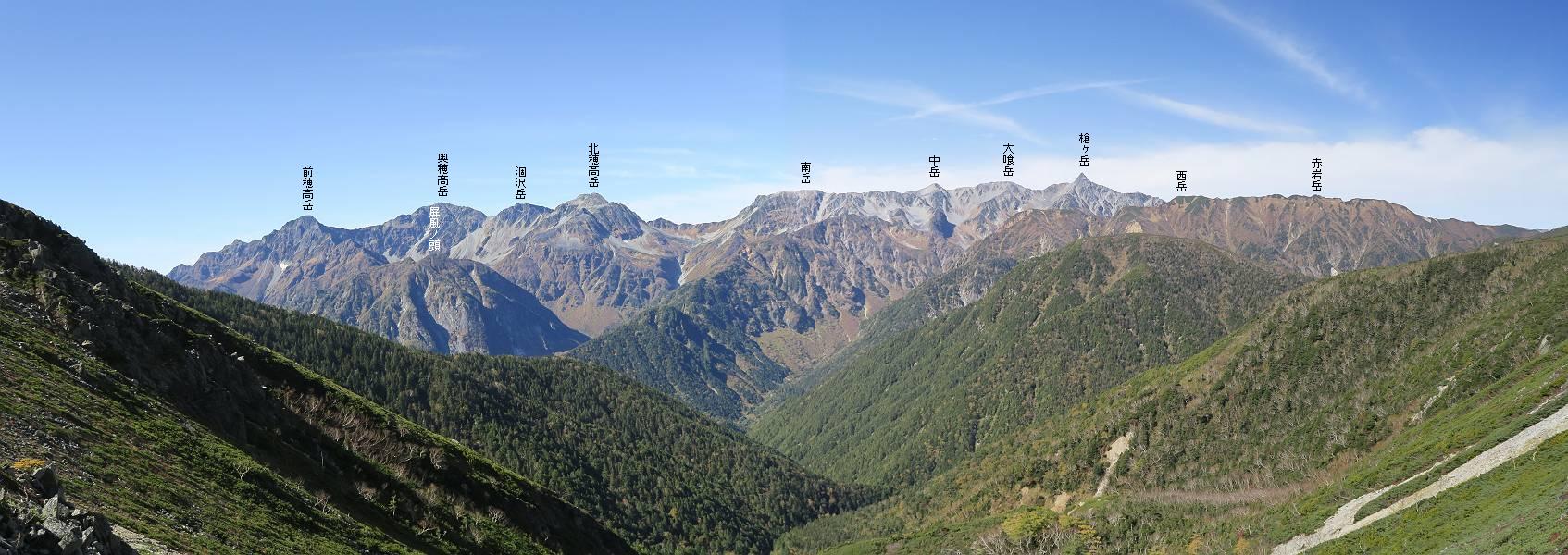【後編:常念岳-蝶ケ岳-三股駐車場】 【前編:三股駐車場-常念岳】 常念岳から蝶ケ岳まで、西側の槍ヶ岳から前穂高岳と山脈がほぼ平行している。前者は常念山脈、後者は飛騨山脈である。こんな地形的な条件で平地(松本市の市街地)からは奥まった3000級の山並はほとんど見えない。そこに本コースを歩く価値がある。最近は机上でも楽しめるが、汗して一歩一歩、歩き眺めることに醍醐味がある。連続する岩峰のアップダウン、通り抜ける樹間、広々した蝶ケ岳から様々な様相で楽しませてくれる、11:00標高点(2592)、11:21標高点(2462)、11:57-12:11蝶槍、12:17三角点(2664.5)、12:53蝶ケ岳山頂。 飛騨山脈と常念山脈はほとんど平行している(カシミール使用) ![]() 松本城付近から見た常念山脈(カシミール使用) ![]() 100mほど下ったところから槍穂展望 画像クリック 拡大 御嶽山〜北鎌独標 ![]() 同、蝶ケ岳方面 常念岳を振り返る 立ち止まっては展望 画像クリック 拡大 乗鞍岳〜水晶岳(黒岳) ![]() 最初の鞍部から 画像クリック 拡大 前穂高岳〜赤岩岳 ![]() 鞍部 常念岳を振り返る 登り返して 常念岳 下って、この先樹林帯 前方、枯野 蝶ケ岳 常念岳を振り返る 再び樹林帯 標高点2592 蝶に近づいた 下って、小さい沼 もう少し下って 鞍部、標高点2462 登り返し 常念岳を振り返る 間もなくハイマツ帯へ 北斜面から槍穂展望 画像クリック 拡大 前穂高岳〜前常念岳 ![]() 蝶槍直下 蝶槍到着 蝶槍の展望 画像クリック 拡大 前穂高岳〜前常念岳 ![]() 蝶ケ岳、この先に三角点、その先にヒュッテ&蝶ケ岳山頂 下ります 蝶槍を南側直下から 三角点のあるピークへ ゆったりした起伏の小さい展望コースをアッチコッチ 画像クリック 拡大 霞沢岳〜野口五郎岳 ![]() 画像クリック 拡大 焼岳〜前常念岳 ![]() 蝶ケ岳ヒュッテ到着 少々上って蝶ケ岳山頂 蝶ケ岳山頂の槍穂展望 画像クリック 拡大 焼岳〜有明山 ![]() 蝶ケ岳を枕に、なんとも贅沢な昼寝 山頂を後に槍の見納め ハイマツの間から 三股への下山路に入ります 13:01去りがたき蝶ケ岳山頂部を後にする、沢山の三股からの登山者と「こんにちは、お先にどうぞ」、を交しながら悪路を下る。13:16最終ベンチ(2500m)、13:39第二ベンチ(2350m)、13:57蝶沢(2140m)、14:12(2000m)付近通過、14:27まめうち平(1916m)、15:04力水(水場)、15:19三股登山口、15:29三股駐車場着。 悪路が続きます、所々にホットな場所が・・・ その先は、木段が整備されてました 蝶沢 水場 樹林帯に入りました 勾配が緩やかになって、 まめうち平、1900m 樹間から雲のかかった常念岳 黄葉も進んで 下山者も点々と、 力水、美味しいですよ 清流 つり橋を渡って、 今朝通った分岐点 小橋を渡れば三股登山口 ダートをテクテク、三股駐車場着 総所要時間は、11時間35分、前回よりちょっとかかったが、誤差の範囲。天気に恵まれて眺望は楽しめたが、花はなし、紅葉は晩々期、槍穂が雪化粧でもしていたら、また楽しめたが、真夏のような陽気の中の山歩き、日焼けの土産をもって帰路についた。 【前編:三股駐車場-常念岳】 |