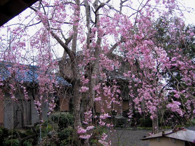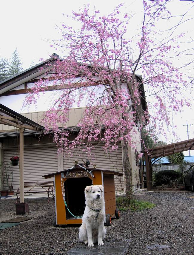 平成十八年四月五日 Before 写真集目次へ Next ぼくの家のしだれ桜が満開になりました。お父さんに桜をバックに雨の中で一枚撮ってもらいました。後ろは物置で、夕方になるとお家を移動してもらって、この中で寝るんだよ。朝になるとまた動かしてもらうんですよ。今日は小雨が降っているから、隣の車庫からお花見しよう。 物置の前から撮った写真です。右下がぼくの家で、ここからお父さんとお母さんをいつも見ているんですよ。 Before 写真集目次へ Next