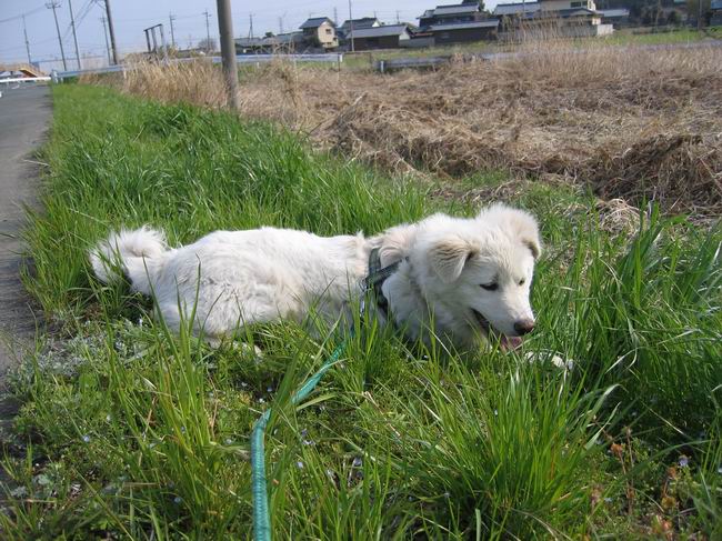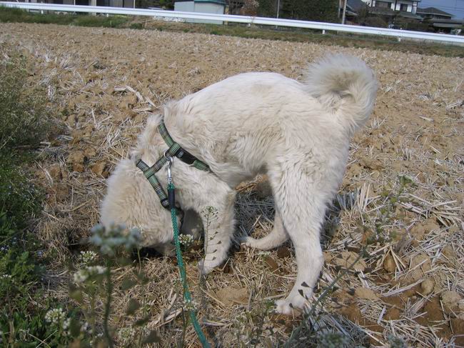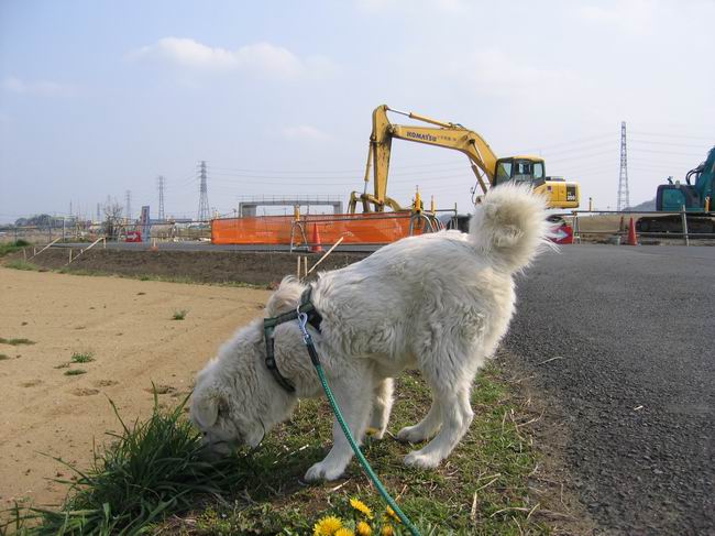 平成十八年四月七日 Before 写真集目次へ Next 午後の散歩の時に撮られてしまいました。 用水のフェンスの脇で匂いがするので、首を突っ込んで嗅いでいたら・・・・。 北関東道のIC工事現場付近で、草を食べ始めたら、撮られちゃった。 田圃のそばで穴掘りを始めたら叱られちゃった、でもね、ぼく、土の感触好きなんですよ。 この草、美味しいんですよ。野菜とは一味ちがいます。 Before 写真集目次へ Next