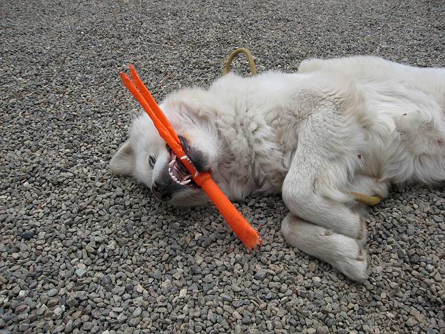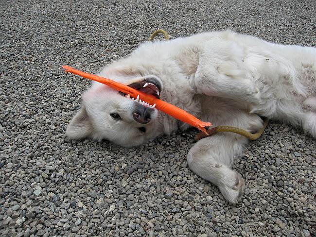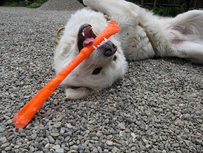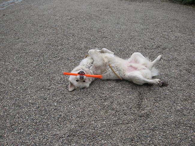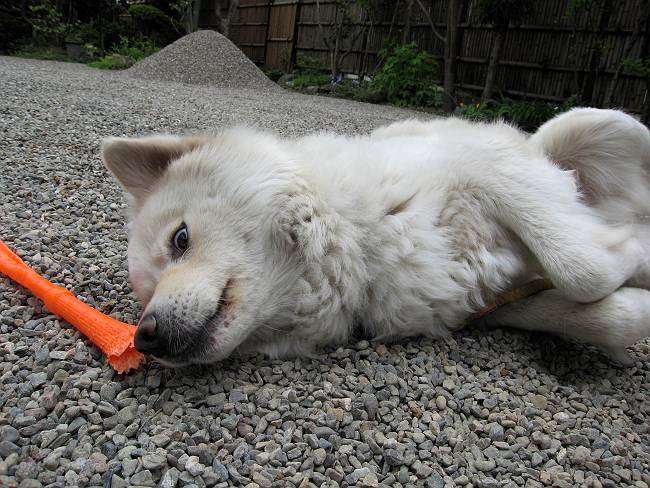 「お父さん、何してるの」、「もう少しで終わるから待ってな」、「ハーィ」 「まだかな、早く遊んでくれないかな」 「もう少しって、長いなあ」 「あーぁ、まだ降りてこないなあ」 「ぼく、こんなのくわえてあきちゃったよ」