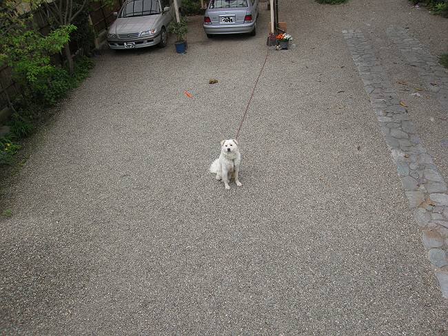 平成十九年四月二十三日 Before 写真集目次へ Next お父さんは、ぼくを長いロープで車庫の柱に縛り付けて、高い所に上って何かしています。「お父さん、何してるの」、「ヤエザクラの写真を撮っているから、ひとりで遊んでいな」、「ハーィ」