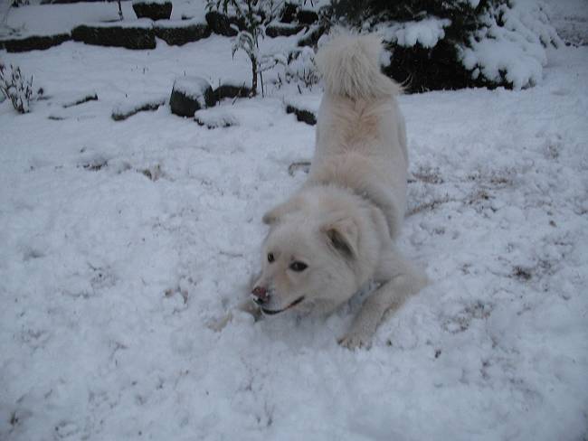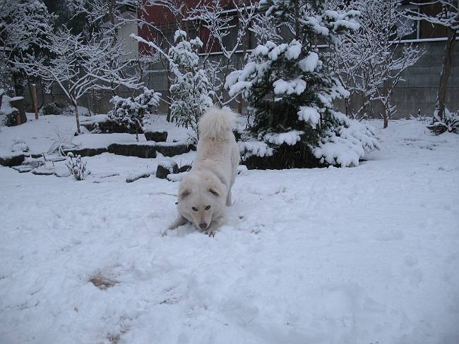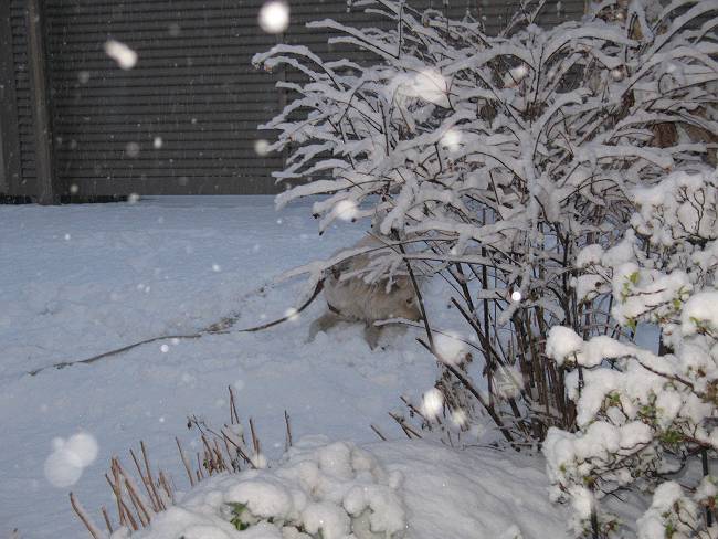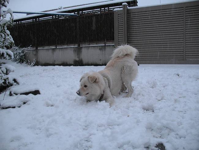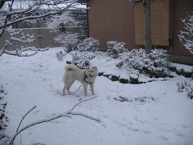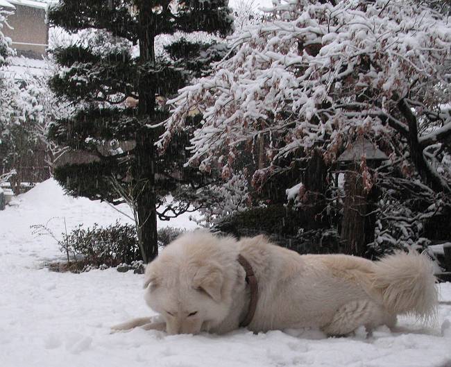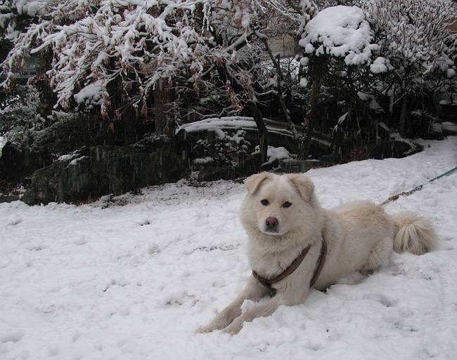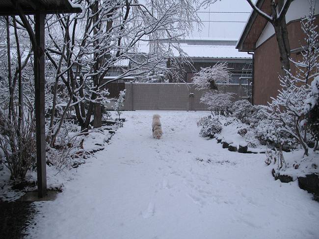| 平成二十年二月三日 Before 写真集目次へ Next 目が覚めたら、二度目の雪で真っ白でした。朝の散歩をしたいのですが、「この雪では行けないよ、明るくなるまで待とう、忠治」、「ぼく、平気だよ、行きたいなあ」、しばらく様子をみてましたが、散歩はやめにして、庭で遊びました。お父さんは、ぼくを追いかけて、走ってましたよ。 ♪♪、ぼくは、喜び庭かけまわり、♪♪ ああ、ぼくの足跡だらけになっちゃった。 あっちが、まだ残ってる、でも入ると叱られちゃうなあ。 雪の感触を確かめて 「美味しいですよ、食べてみませんか」、「お父さんは、朝食を食べるからな」、「・・・・・・・」 Before 写真集目次へ Next |