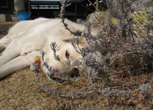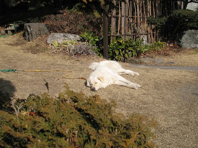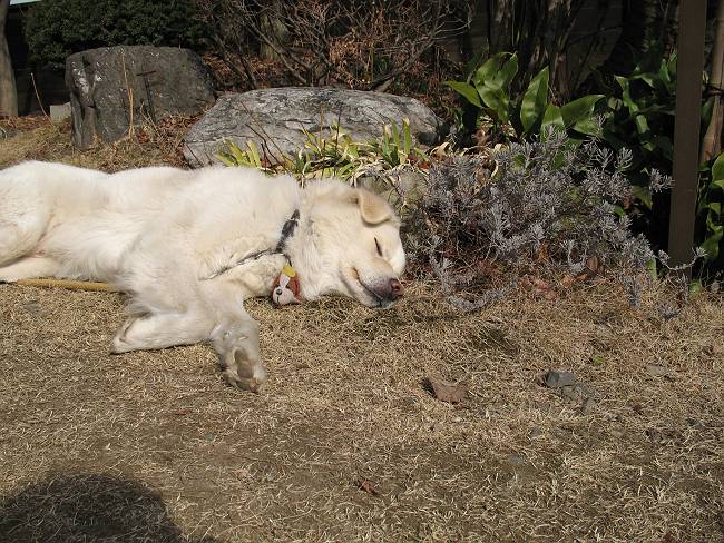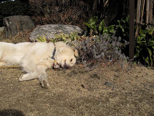 | 平成二十年二月二十六日 Before 写真集目次へ Next 午後の散歩のあと、芝生の上で休んでいたら、眠くなってしまいました。 日差しはもうすっかり春、いい気持ち。 ラベンダーの根元で、寝てしまいました。 お父さんが、こっそりやってきて、写真を撮ったようです。 寝たと思ったら、すぐに、起こされてしまいました。 お水を飲んで、 横になっていると、 また、寝てしまいました。 「あれっ、前を車が通って行ったなあ」 「誰かな?」 「お母さんが、買い物から帰ってきたぞ!」 Before 写真集目次へ Next |