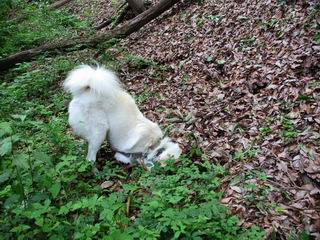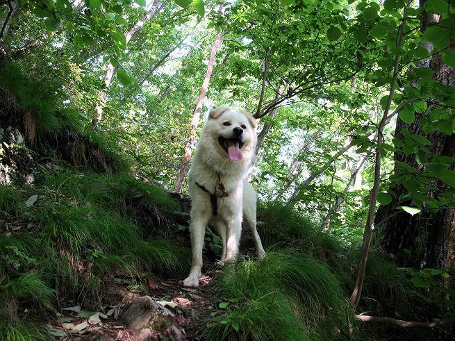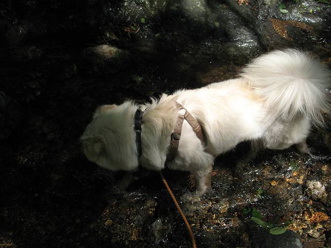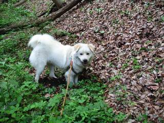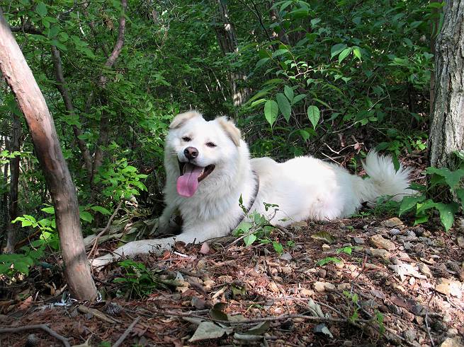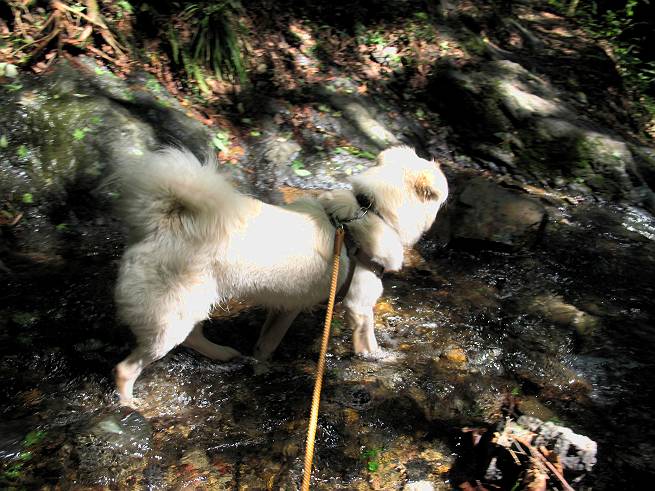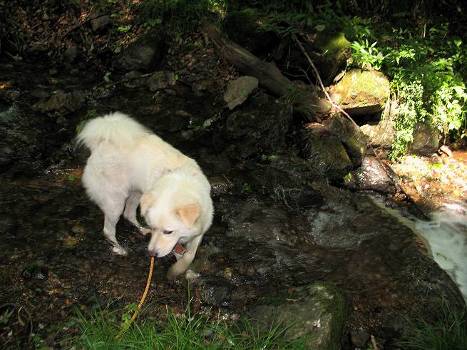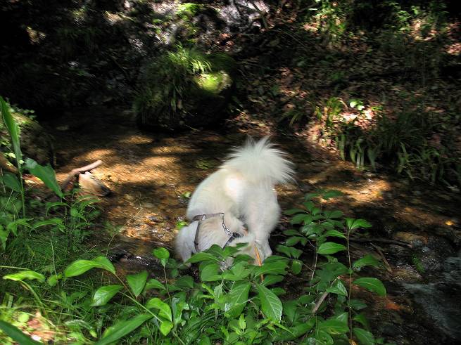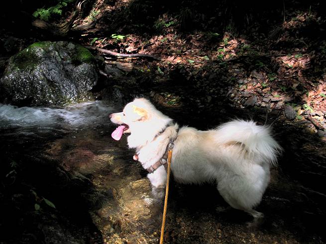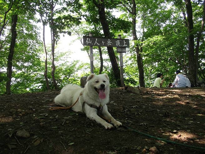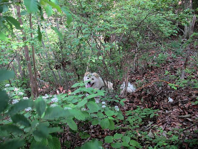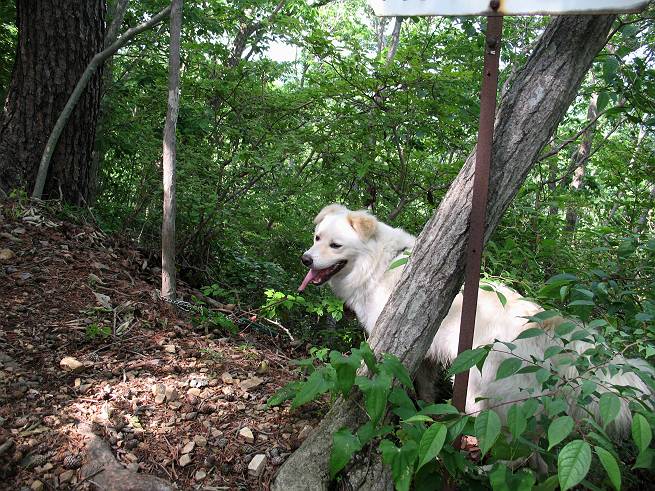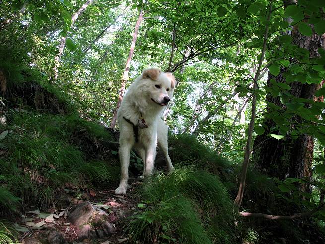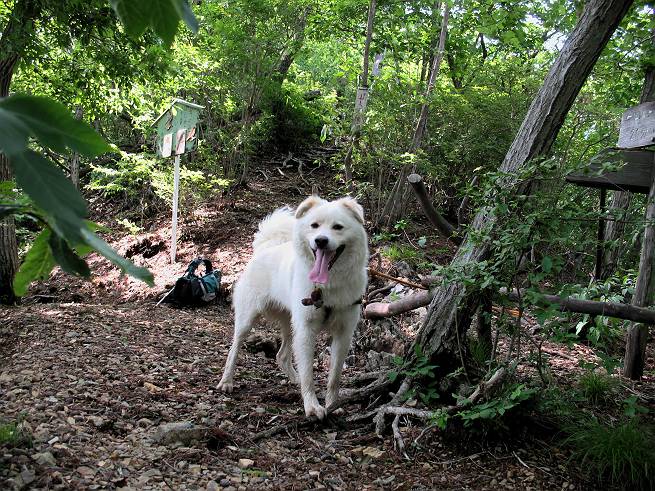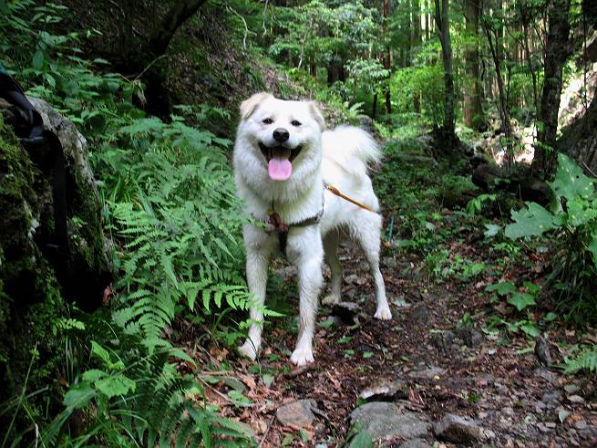| 平成二十年六月一日 Before 写真集目次へ Next うっとうしい雨の日が続いて、ぼくは、退屈してました。今日は朝から真っ青な空、お父さんがキノコの床を作って横で、ちょっぴり手伝って(お父さんはイタズラだと言います)ました。午後になって突然、「忠治、お山へ行こうか」と言いました。ぼくは、うれしくて、「ワンワンキャンキャン」言ってしまいました。ついに、足利で一番高い山、仙人ケ岳663mへ連れてってもらいました。 ここが登山口の岩切です。 案内板の左のコースを歩きました 岩切沢に沿って歩いて行きます、時々浅瀬に下りてお水を飲みました、とても美味しかったです。 お父さんは丸太の橋を渡りました。ぼくは橋が苦手なので沢の中を歩いて渡りました。 お父さんは登山道を、ぼくは沢の中を歩きました。すると大きな淵に出てしまいました。ここは登山道に上がって、岩の上を這うようにして、お父さんの後ろについて歩きました。 また沢の中をポチャポチャと歩きました、水がキレイで楽しいですね。 また深い所に出てしまいました。水を飲んで登山道に上がりました。「忠治、丸太の橋渡ろう、ゆっくりついて来るんだよ」、とお父さんが言うんです。ぼくは決心してお父さんの後ろについて渡りました。そうしたら、怖くも何でもありませんでした。滝の上を巻いたりする所も通りました、ここも全然怖くありませんでした。 生満不動に着きました。おじさんが休んでましたので、ちょっと上の道端で休みました。これまでに歩いた山と違って、沢の中を横切ったり、丸太の橋を渡ったり、沢を見下ろしながら歩くところが面白いですね。お水はいつでものめますし、ね。 生満不動からしばらく歩き、先に出たおじさんに道をあけてもらって、間もなく沢と分かれて急坂の道になりました。お父さんを引っ張って、「ヨイショ、ヨイショ」、やっと熊の分岐に着きました。 ここで、リードをながくしてもらって、斜面を下ったり上ったりしながら遊びました。お父さんは、荷物を下ろし腰を降ろして休憩してます。コアジサイを入れて撮ってもらいました。 お父さんは、まだ汗を拭いています。 ぼくも、休もう、っと。「忠治、ダニにやられるぞ」、「やだなぁ」 ここでオヤツをもらいました。ついでに食事もしてしまいました。 またしばらく緑のトンネルとなった尾根を上がったり下がったりしながら赤雪山の分岐点にさしかかりました。すると、ご夫婦とワンちゃん(ビーグル)が休憩してました。ワンちゃんがぼくを見てさかんに吠えてぼくの方へやってきました。ほくも一発吠えてやりました。そして間もなく仙人ケ岳山頂に着きました。ぼくが休んでいると、先ほどのワンちゃんがやってきて、また吠えまくりました、ぼくも吠えてしまいました。お休み中の人たちをびっくりさせてしまいました、すみません。 しばらく休んで、引き返すと、また、赤雪山の分岐点であのワンちゃんに遭ってしまいました。今度はぼくは吠えませんでした、お父さんは一言ご夫婦に「どうも・・・・」と言ってました。熊の分岐から少し下った所で小休止しました。 すると、先ほどのおじさんが、下の方に見えるんですよ。どうしたのだろう? でも戻っているようでした。 沢沿いの斜面で、ぼくの趣味が始まりました。「ニオイがしたのですが、何もいませんでした」 今日は、念願の仙人ケ岳を歩いて、これまでに大坊山、両崖山、天狗山、大岩山、行道山、深高山、石尊山、赤雪山を歩いてますので、「次は大小山へ連れてって下さい」 Before 写真集目次へ Next |