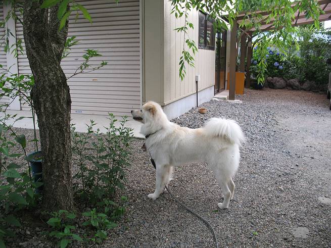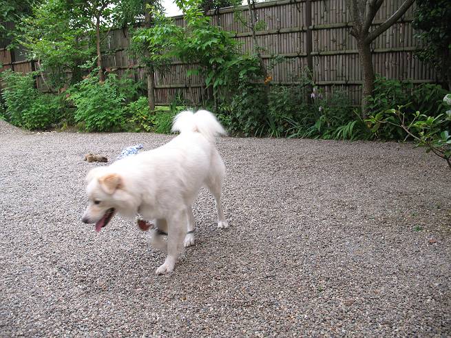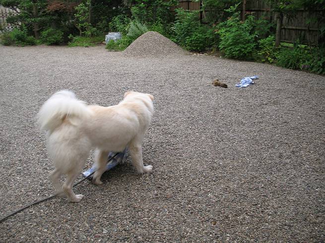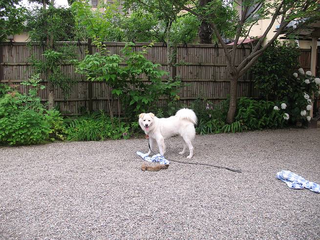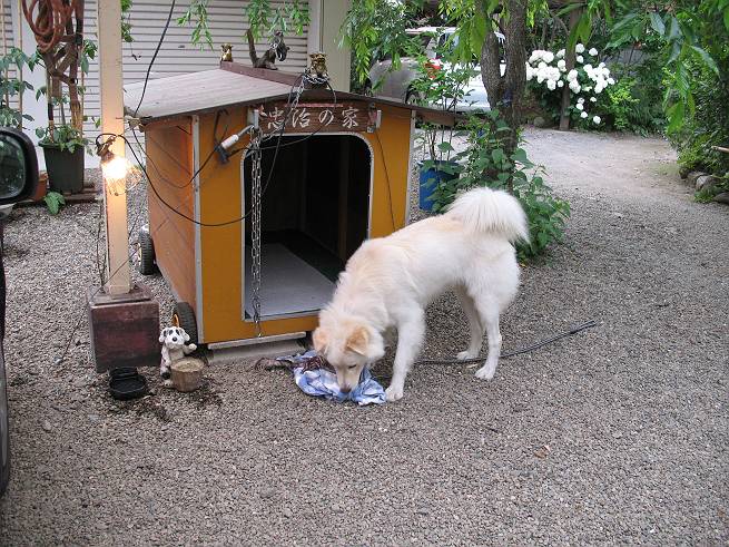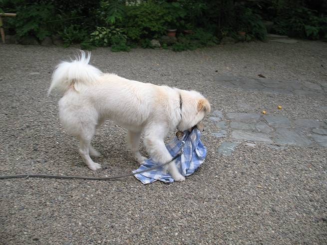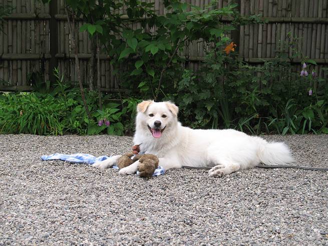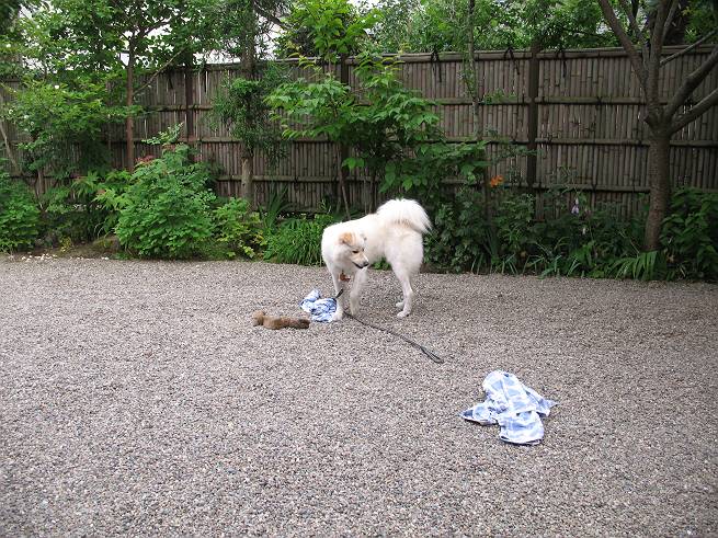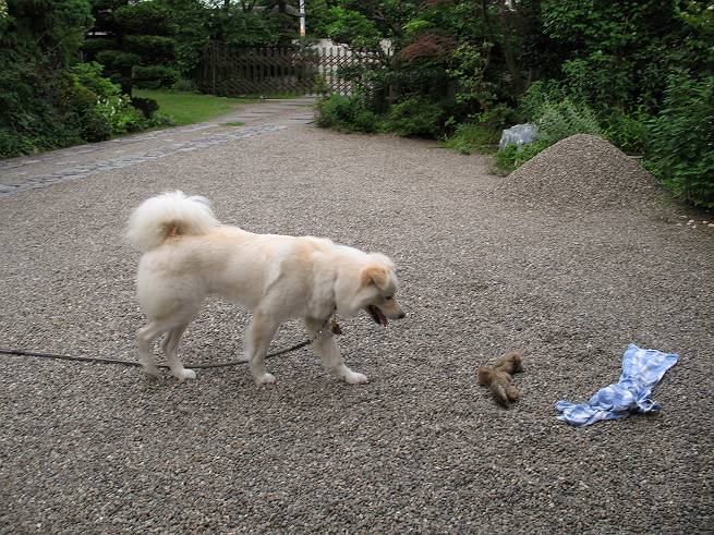 | 平成二十年六月十八日 Before 写真集目次へ Next ここ4,5日晴れた日が続いてます。午前中はお庭の木を消毒してましたので、物置から眺めてました。そして午後、シャンプーしてもらいました。ざっとふいてもらって散歩してきたら、すっかり乾いてました。 散歩の後、玄関で涼んでいると、お使いから帰ったお母さんが、「忠治、きれいになったね」、と言ってました。 ご飯をもらったし、またひと運動しよう。 何して遊ぼうかな そうだ、さっき遊んだままなんだ。「ワンちゃん、おまたせ」 遊んでいると、お父さんが玄関の方からやってきて、「忠治、何してるんだ」 「ワンちゃんのぬいぐるみとお兄ちゃんにもらったパジャマで遊んでまーす」、「そうか、きれいなうちに写真を撮るぞ」、とあちこちからぼくの遊んでいるところを撮ってました。 ちょっとたりないなあ、もうひとつ持って来よう。 何にしようかな、何か面白そうなのないかなあ。 そうだ、パジャマの上着を持っていこう。 お家から引っ張り出して、持ち直しました。 ヨイショ、ヨイショ! このへんでいいかな。 さあ、ど・う・し・よ・う・か・な。 ちょっと待てよ、また暑くなってしまった。 また、お水を飲んで、おやすみでーす。こんな梅雨の中休みの午後でした。 Before 写真集目次へ Next |