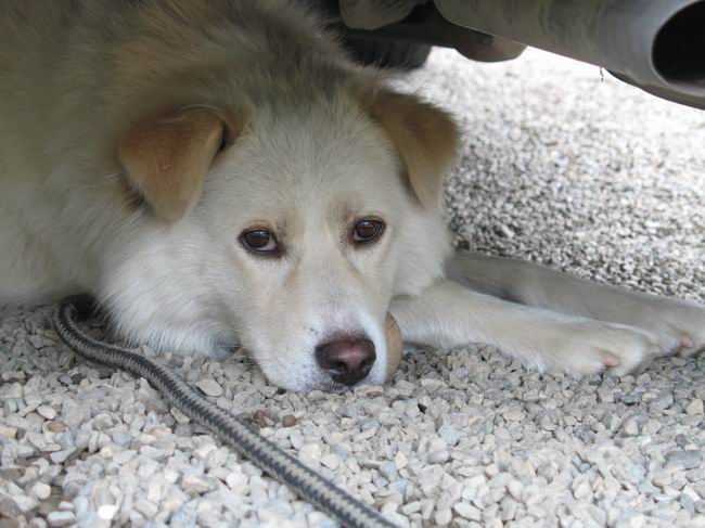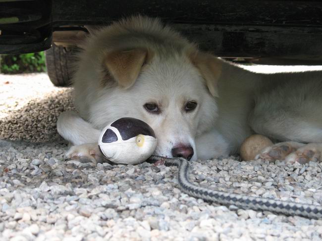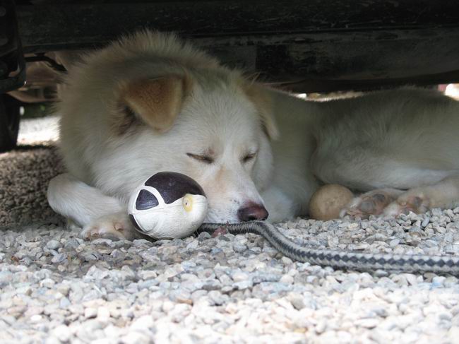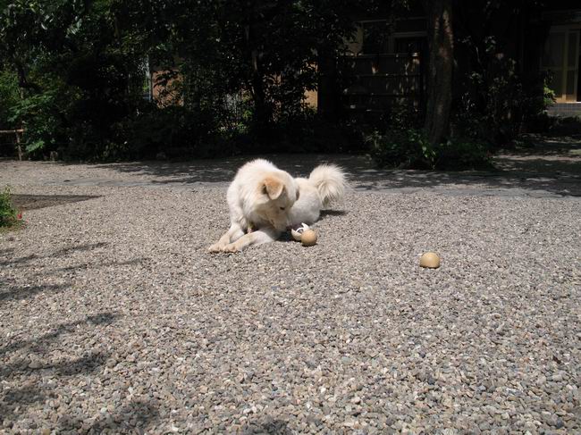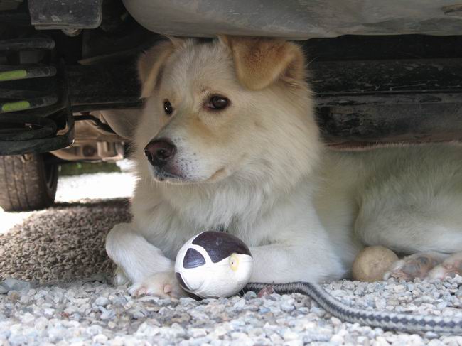 | 平成二十年八月二十七日 Before 写真集目次へ Next 夏の日差しがやっと戻ってきたようですね。雨降りはもうたくさんでーす。 「忠治! ちょっとお隣さんへ行ってくるから留守番しててね、吠えればすぐ来るよ」、「ハーイ」 リードをといてもらって、お庭でボール遊びをしながらお留守番をしてました。お母さんの声は聞こえるのですが、いつになっても戻ってきません。 暑くなったので、車の下にもぐって番犬をしてました。 でも、だんだん眠くなってしまいました。 だんだん頭が下がってしまうんです。 ついに、寝てしまいました。ぼくの寝顔、可愛いですか? 横のラグビーボールの形をしたボールは、この間親戚の“コナ”ちゃんからもらったんだよ、大切にしているよ。コナちゃんは保健所からもらわれてきたんだってさ。ぼくは、赤城山からお父さんに連れてきてもらったんだけど。 Before 写真集目次へ Next |