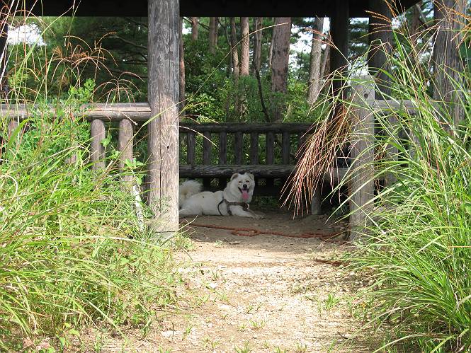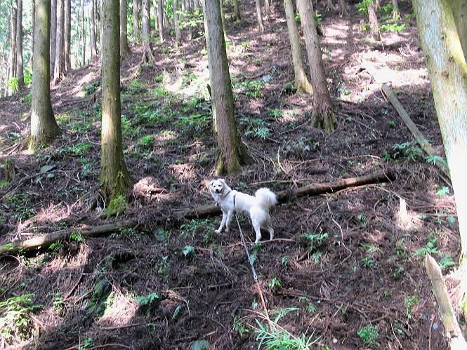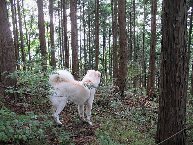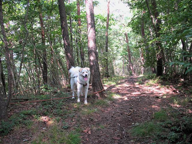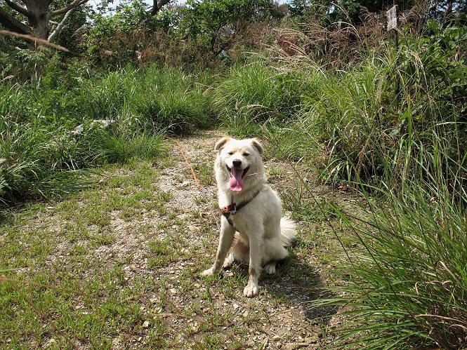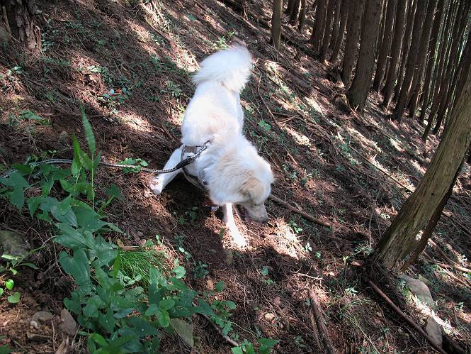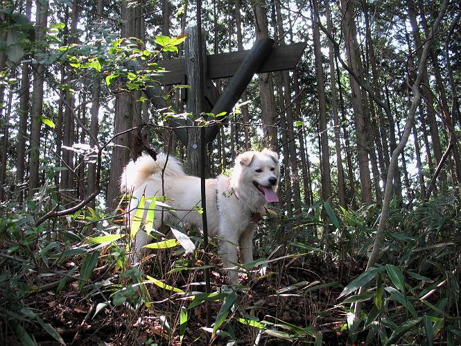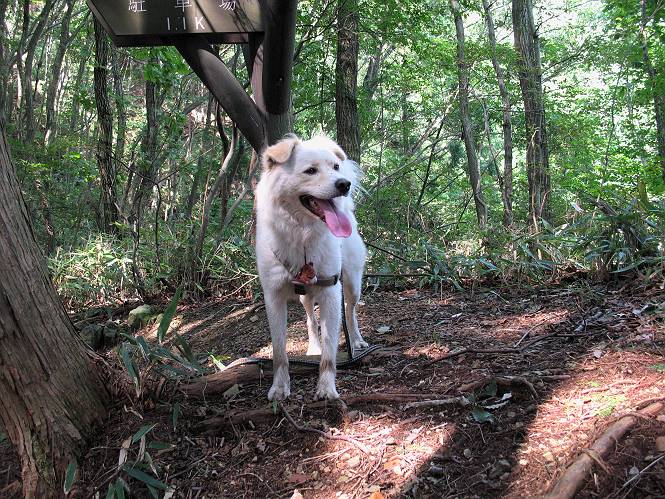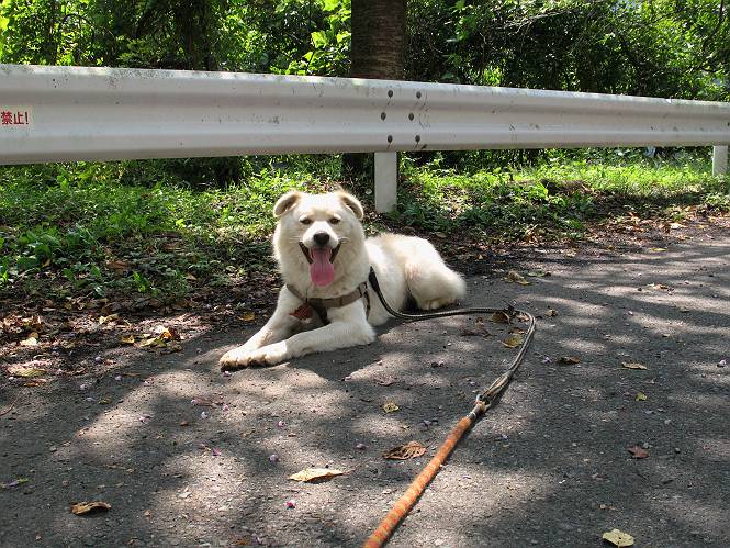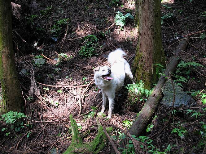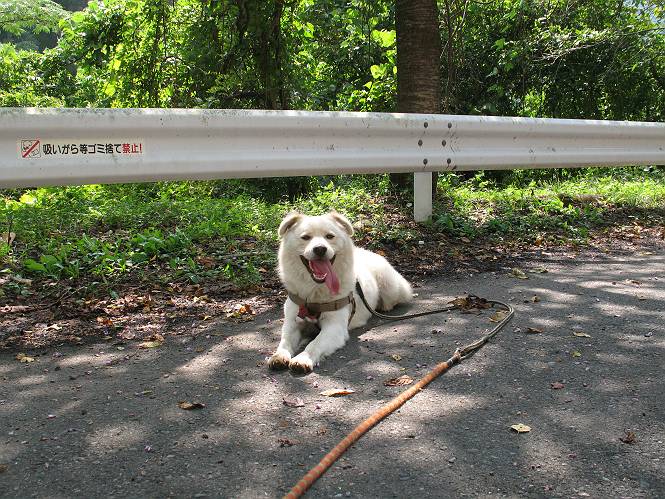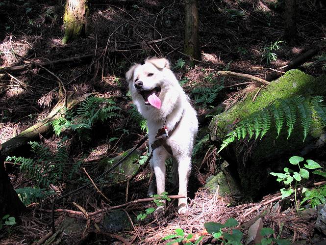 | 平成二十年九月十四日 Before 写真集目次へ Next 朝、雨が少し降りましたが、日中は良い天気になるそうで、松田川ダムから赤雪山に連れてってもらいました。赤雪山に登る時は、いつもですとダムの上から歩くのですが、今日は帰りにいつもの川で水遊びをするので、下の駐車場を出発しました。駐車場には大きなテントが沢山張ってあり、キャンプを楽しんでいるようでした。丸太の階段を上って、展望台の脇を通り、赤雪駐車場から沢に沿った登山道に入りました。 「お父さん、お水飲むから待って!」、沢に入ってお水を沢山飲みました。 「ああ、おいしかった」 沢から離れた所で小休止しました。 お父さんが休んでいる間に、急な斜面を這い上がったりして遊びました。 杉の木にリードが引っかかってしまいました。 「と・れ・ま・し・た・よ」 丸太の階段を上って、ジグザグに進むと間もなく尾根に出ました。 お父さんは、またお休みのようです。 ぼくはヘーキです。 ここからしばらく急坂を登りました、ぼくもハッハ、ハッハ、・・・・・・、しながら、やっと東屋のある赤雪山山頂に着きました。 東屋で腰をおろして休みました。干肉とトバをもらいました、おいしかったでーす。 お水ももらったよ。お父さんもザックからゴソゴソ出して食べています、何だろな? 日陰って涼しいですね。外には、ススキがいっぱい咲いてますね。今日は中秋の名月ですって、うさぎさんのお餅つきが見えるかな。 東屋の前で山頂の記念写真を撮ってもらいました。 イスのそばで座ってもう1枚撮ってもらいました。 下りはお父さんの後について歩きました。ちょっと前に出そうになると、「アト、アトだよ」って言われました。一段下がったピークで、ぼくが自由に遊べるようにと休憩しました。 歩き回ったり、ニオイをとったりして感触を楽しみました。 そうしたら、リードが木に絡まってしまいました、どうしましょう。お父さんが、「バカだねぇ、またやっちゃったよ」、と笑いながら外してくれました。 ここから、ダムに近い所まで下って、今度は穴掘りをして遊びました。 掘って、掘って、・・・・・・、何かいるかな? ダムに出て木陰で座り込んでしまいました。「忠治、疲れたか」、と言ってましたが、こうすると、いい気分なんですよ。 お父さんも一緒に座り込みました。ザックからミカンを出して食べ始めました。ぼくは、ニボシとほねっこ、トバ、ビスケットをもらいました。 こんなカッコウで失礼して頂いてます。 「そろそろ出発しましょうか」 ダムから下って駐車場を通り、いつも遊んでいる松田川に降りました。水の中って、気持良いですね。 おやっ、あっちにいっぱい人がいるぞ、行ってみよう。 ポッチャン、ポッチャン、お水を飲みながら近くまで歩きました。 ぼくの入れてもらえるのはここまでです。でも、眺めていたら小さい子が3人やってきて顔をさわったりしてました、うれしかったよ。水の中で一緒に遊びたいけれど、・・・・・。 Before 写真集目次へ Next |