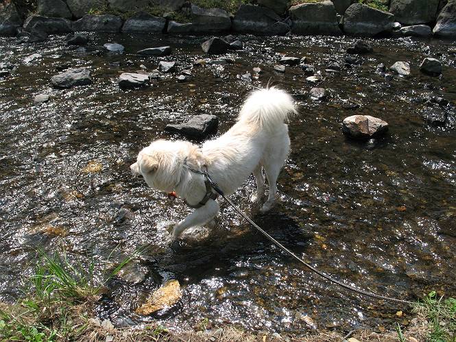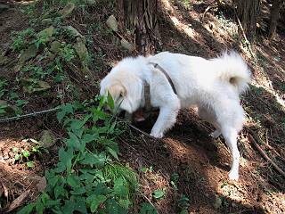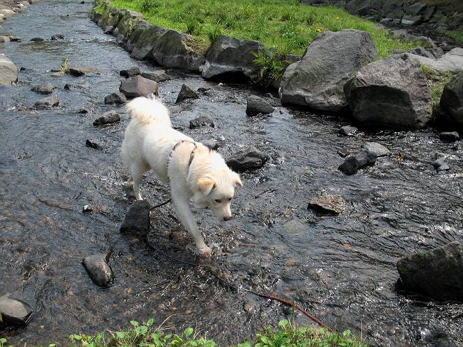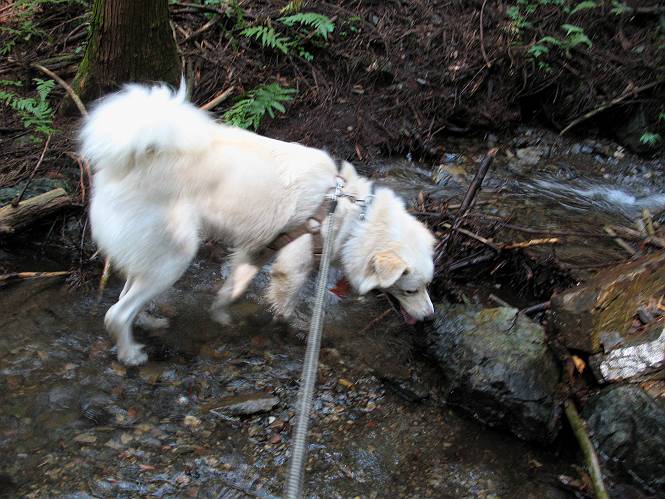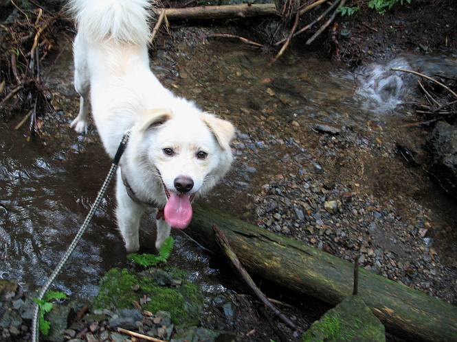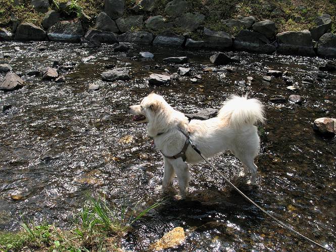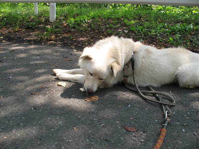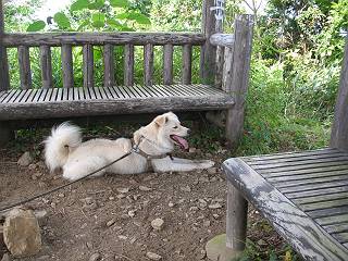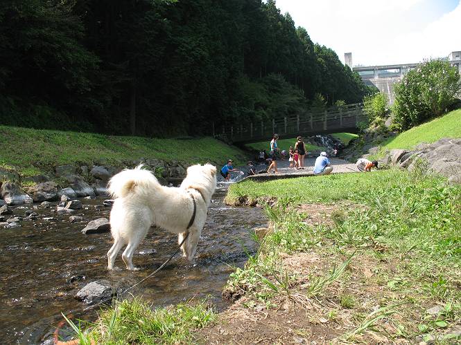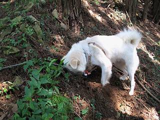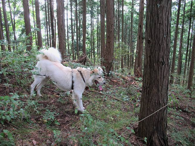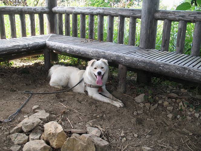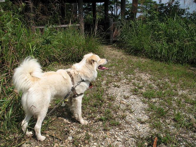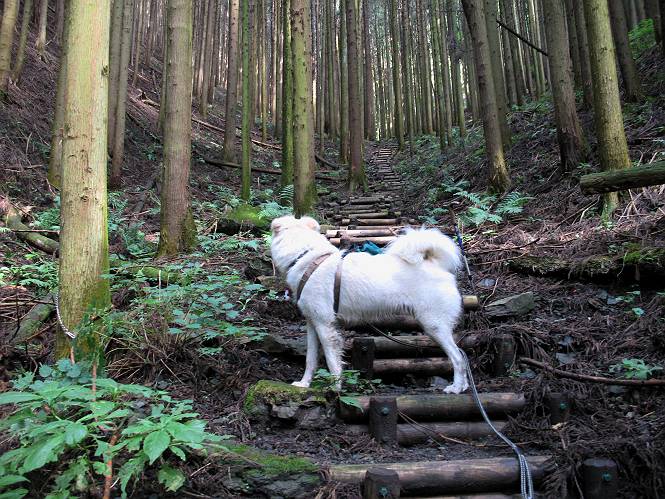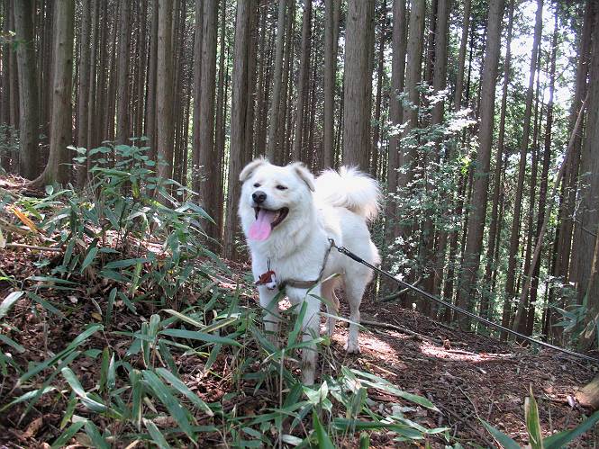 | 平成二十年九月十四日 Before 写真集目次へ Next 朝、雨が少し降りましたが、日中は良い天気になるそうで、松田川ダムから赤雪山に連れてってもらいました。赤雪山に登る時は、いつもですとダムの上から歩くのですが、今日は帰りにいつもの川で水遊びをするので、下の駐車場を出発しました。駐車場には大きなテントが沢山張ってあり、キャンプを楽しんでいるようでした。丸太の階段を上って、展望台の脇を通り、赤雪駐車場から沢に沿った登山道に入りました。 「お父さん、お水飲むから待って!」、沢に入ってお水を沢山飲みました。 「ああ、おいしかった」 沢から離れた所で小休止しました。 お父さんが休んでいる間に、急な斜面を這い上がったりして遊びました。 杉の木にリードが引っかかってしまいました。 「と・れ・ま・し・た・よ」 丸太の階段を上って、ジグザグに進むと間もなく尾根に出ました。 お父さんは、またお休みのようです。 ぼくはヘーキです。 ここからしばらく急坂を登りました、ぼくもハッハ、ハッハ、・・・・・・、しながら、やっと東屋のある赤雪山山頂に着きました。 東屋で腰をおろして休みました。干肉とトバをもらいました、おいしかったでーす。 お水ももらったよ。お父さんもザックからゴソゴソ出して食べています、何だろな? 日陰って涼しいですね。外には、ススキがいっぱい咲いてますね。今日は中秋の名月ですって、うさぎさんのお餅つきが見えるかな。 東屋の前で山頂の記念写真を撮ってもらいました。 イスのそばで座ってもう1枚撮ってもらいました。 下りはお父さんの後について歩きました。ちょっと前に出そうになると、「アト、アトだよ」って言われました。一段下がったピークで、ぼくが自由に遊べるようにと休憩しました。 歩き回ったり、ニオイをとったりして感触を楽しみました。 そうしたら、リードが木に絡まってしまいました、どうしましょう。お父さんが、「バカだねぇ、またやっちゃったよ」、と笑いながら外してくれました。 ここから、ダムに近い所まで下って、今度は穴掘りをして遊びました。 掘って、掘って、・・・・・・、何かいるかな? ダムに出て木陰で座り込んでしまいました。「忠治、疲れたか」、と言ってましたが、こうすると、いい気分なんですよ。 お父さんも一緒に座り込みました。ザックからミカンを出して食べ始めました。ぼくは、ニボシとほねっこ、トバ、ビスケットをもらいました。 こんなカッコウで失礼して頂いてます。 「そろそろ出発しましょうか」 ダムから下って駐車場を通り、いつも遊んでいる松田川に降りました。水の中って、気持良いですね。 おやっ、あっちにいっぱい人がいるぞ、行ってみよう。 ポッチャン、ポッチャン、お水を飲みながら近くまで歩きました。 ぼくの入れてもらえるのはここまでです。でも、眺めていたら小さい子が3人やってきて顔をさわったりしてました、うれしかったよ。水の中で一緒に遊びたいけれど、・・・・・。 Before 写真集目次へ Next |