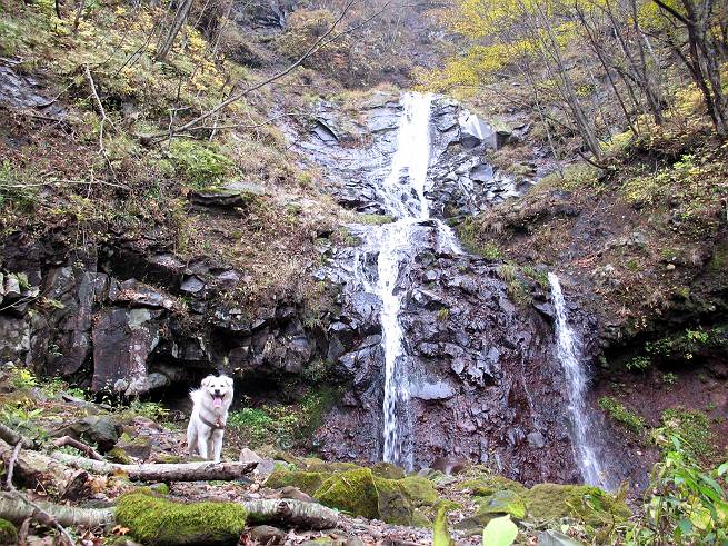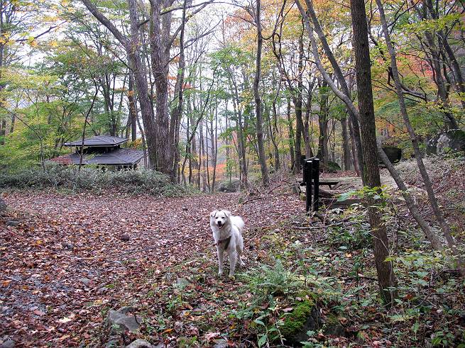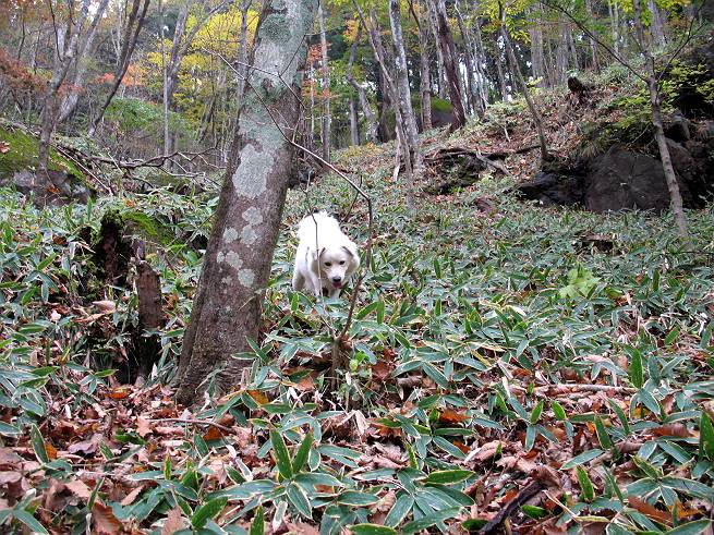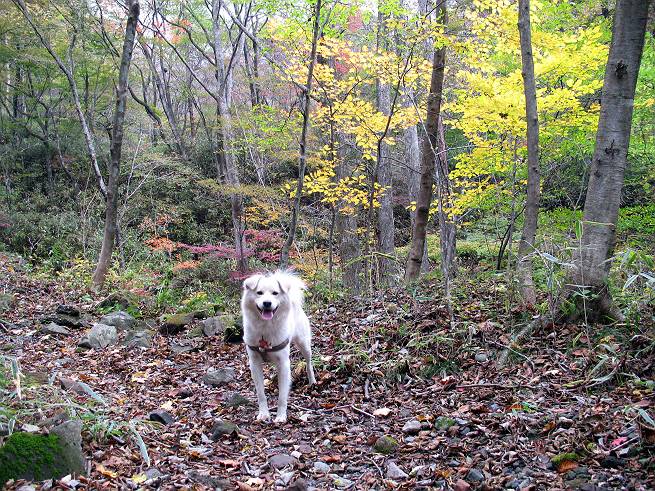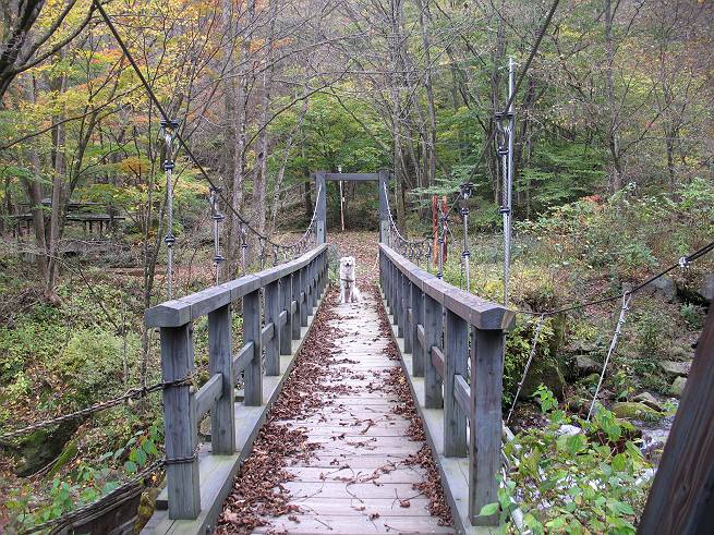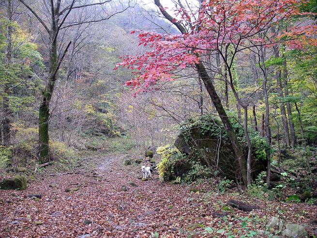 | 平成二十年十月二十五日 Before 写真集目次へ Next 今日は、赤城山の裾野、利平茶屋森林公園の三崖の滝を見に行ってきました。紅葉を期待してましたが、ちょっと早いのか遅いのか、そんな紅葉でした。公園内を通り、一番奥の広場からつり橋を渡りました。橋の真ん中で一枚撮ってもらいました。 ここは、テント場のようです。葉を落とした木が多いのですが、淡い紅葉が残ってました、いや、これから鮮やかに変身するのでしょうか。 散策路を歩いてます。一本真っ赤にカエデが紅葉していましたので、これを入れて撮ってもらいました。 黄葉だそうです、キレイでしょう、黄、赤、緑。 三崖の滝につきました。ここでオヤツをもらって休憩しました。 帰りは、沢を渡って藪を漕いで、 一直線に下って、 登山道に出て、駐車場に戻りました。駐車場には大型バスが3台停まってましたが、周辺は静まりかえってました、バスで来られた人はどこへ行ったのでしょう。この斜面は、これから色づく木がたくさんありました。 Before 写真集目次へ Next |
