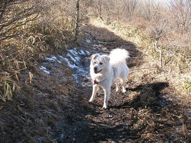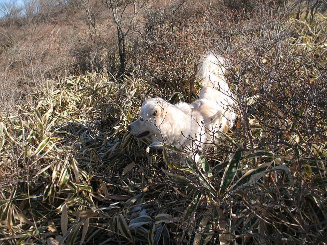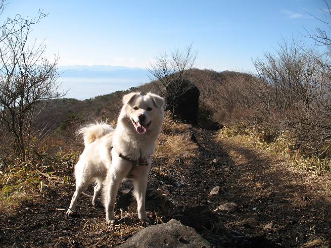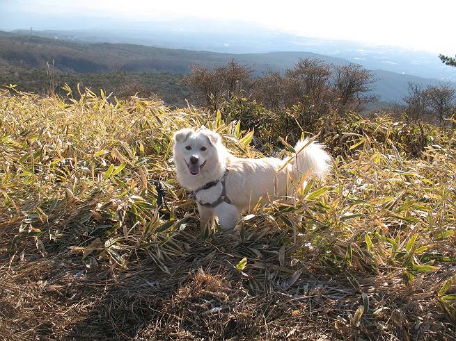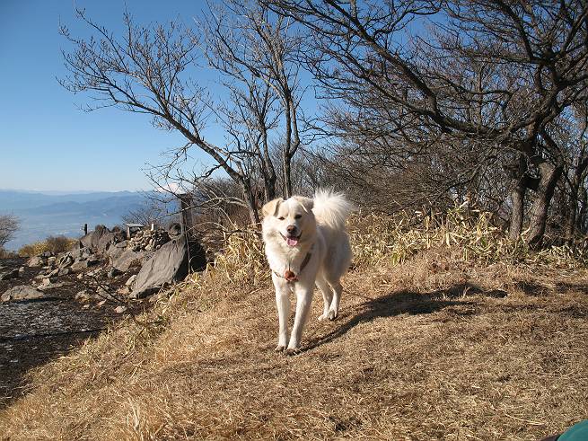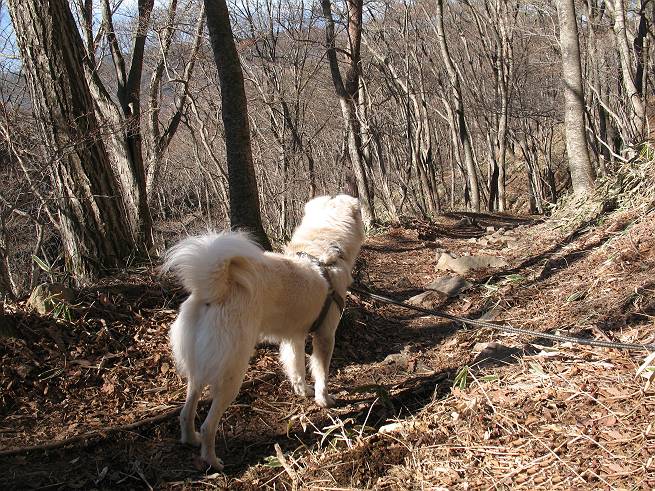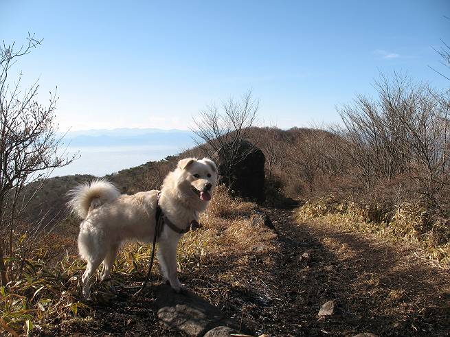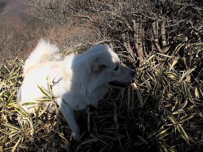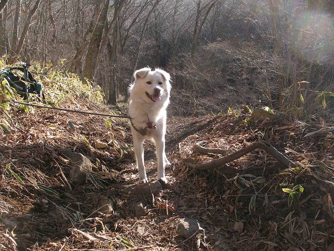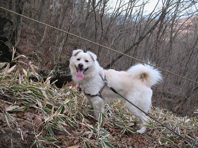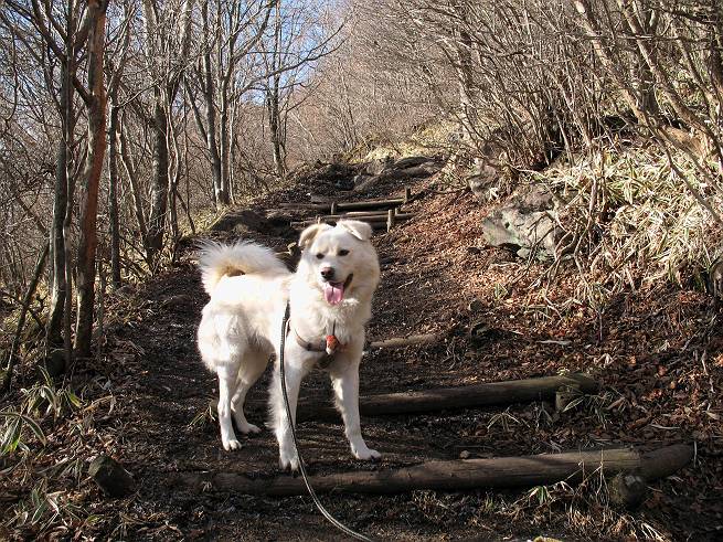 | 平成二十年十二月二十四日 Before 写真集目次へ Next 今年も残り1週間となりました。納めの山歩きとなるのでしょうか、赤城の鍋割山へ雪遊びに連れてってもらいました。姫百合駐車場付近では雪がなくなってました。解けてしまったのでしょうか、でも山頂付近には期待できそうです。 駐車場から歩いて荒山高原の手前、石のゴロゴロした所に出ました。全く雪がありません、 お父さんは、「こんなの初めてだ・・・」と言ってました。 ここは結構急な坂道です。気温が低いのでぼくには丁度いいのですが、お父さんはいっぱい着てきたので「暑い、暑い、雪は期待はずれかなあ」と言ってます。 荒山高原に着きました、後ろが荒山です。雪がぜんぜん見えないでしょう。 お座りして、もう一枚撮ってもらいました。ボコボコ土の盛り上がったところはモグラの活動した跡のようです。 鍋割山の間の小ピークを目指して、木段を上っています。雪、ないですねえ。 ちょっと登山道の端にありました。道は霜解けでグシャグシャです。 只今、お父さんは休憩中です、遠くの山々を眺めてます。 ぼくは、笹原へ失敬して入って感触を楽しんでいます。後ろは荒山の南の尾根だそうです。 もう少しで最初の小ピークだそうです。 眺めが良いですねえ、左が地蔵岳、右が荒山です。 ぼくは両方とも登りました。 下の8枚は周辺からの展望です。 まず、富士山が真南に見えます 西の方角に真っ白な浅間山が見えます、手前の凸凹は榛名山だそうです。 時計回りに四阿(アズマヤ)山 草津白根山 北に回って平標山、仙ノ倉山、万太郎山 万太郎山、谷川岳 朝日岳、巻機山 上州武尊山、そして赤城の鈴ケ岳となっているそうです。 この先に見えるピークが鍋割山だそうです。 もうすぐですね。 鍋割山山頂に到着です。 遠くに見える真っ白い山が浅間山です。 ぼくも休憩してます。 この格好の方が楽ですね。足がドロンコでしょう。 帰りは来た道を戻ってますが、北側の斜面に雪が見えましたので少し入ってみました。 ほんの少しですが、木陰に残ってました。この先にも見えますね。 登山道に戻りましょう。 「オヤッ、誰か来るぞ」、山頂へこれから行くのでしょう。 「アッ、行ってしまった」、5人の親子でした。 荒山高原から急坂を下り平坦な明るい冬枯れの林にでました。 ここで最後の休憩をしました。今日は雪がなくて残念でしたが、また連れ来てもらえるかな、楽しみに待っていよう。では、皆さん、良いお年をお迎え下さいね。 Before 写真集目次へ Next |