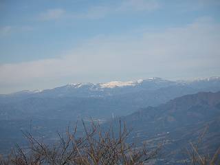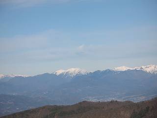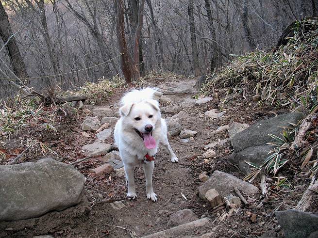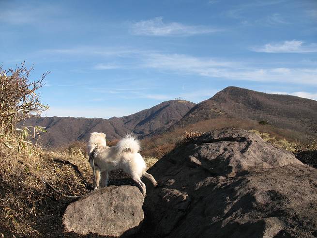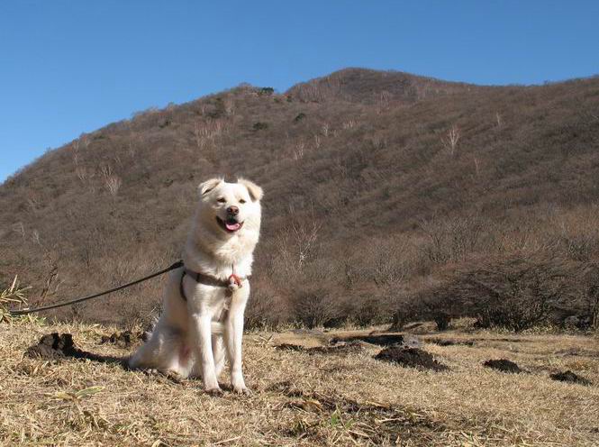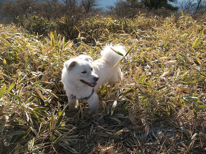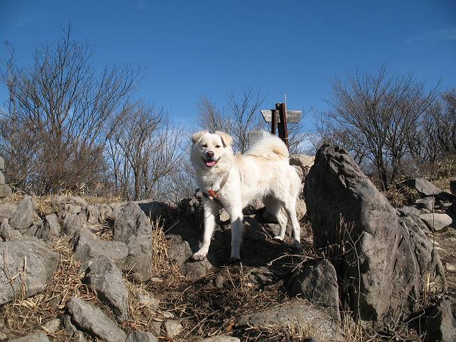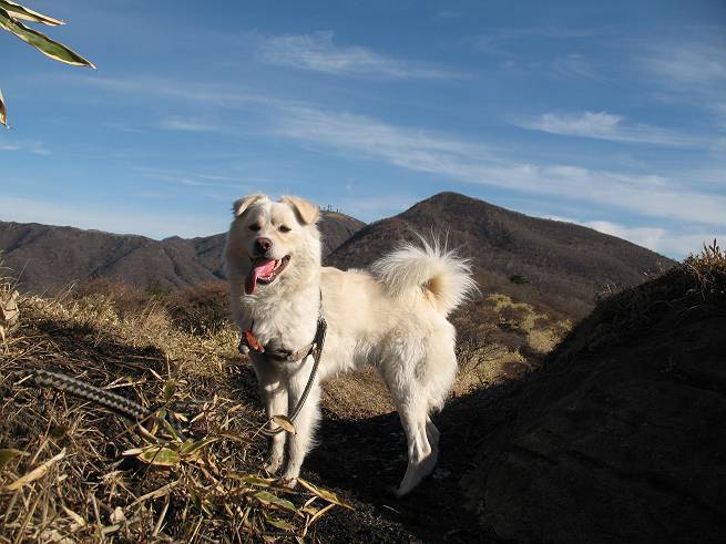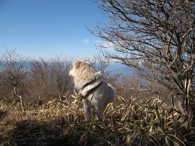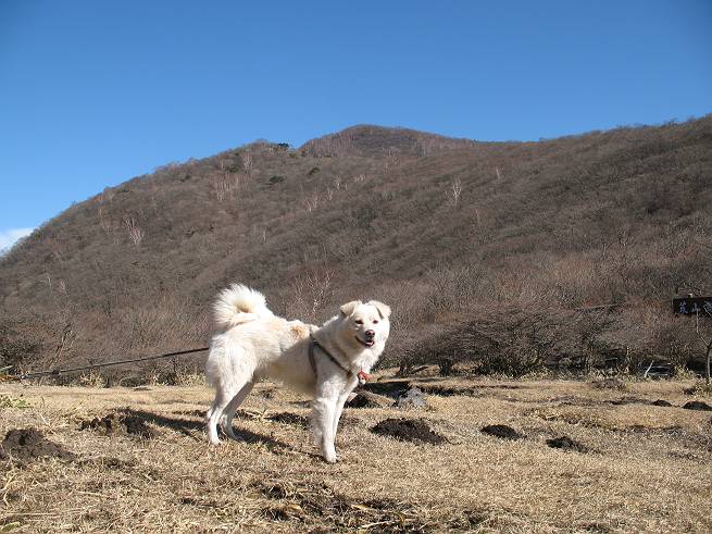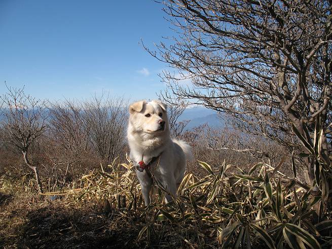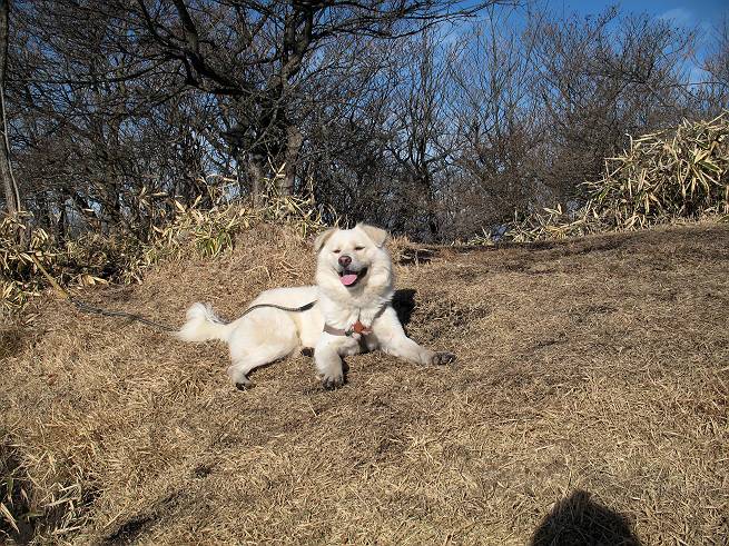 | 平成二十年十二月二十四日 Before 写真集目次へ Next 今年も残り1週間となりました。納めの山歩きとなるのでしょうか、赤城の鍋割山へ雪遊びに連れてってもらいました。姫百合駐車場付近では雪がなくなってました。解けてしまったのでしょうか、でも山頂付近には期待できそうです。 駐車場から歩いて荒山高原の手前、石のゴロゴロした所に出ました。全く雪がありません、 お父さんは、「こんなの初めてだ・・・」と言ってました。 ここは結構急な坂道です。気温が低いのでぼくには丁度いいのですが、お父さんはいっぱい着てきたので「暑い、暑い、雪は期待はずれかなあ」と言ってます。 荒山高原に着きました、後ろが荒山です。雪がぜんぜん見えないでしょう。 お座りして、もう一枚撮ってもらいました。ボコボコ土の盛り上がったところはモグラの活動した跡のようです。 鍋割山の間の小ピークを目指して、木段を上っています。雪、ないですねえ。 ちょっと登山道の端にありました。道は霜解けでグシャグシャです。 只今、お父さんは休憩中です、遠くの山々を眺めてます。 ぼくは、笹原へ失敬して入って感触を楽しんでいます。後ろは荒山の南の尾根だそうです。 もう少しで最初の小ピークだそうです。 眺めが良いですねえ、左が地蔵岳、右が荒山です。 ぼくは両方とも登りました。 下の8枚は周辺からの展望です。 まず、富士山が真南に見えます 西の方角に真っ白な浅間山が見えます、手前の凸凹は榛名山だそうです。 時計回りに四阿(アズマヤ)山 草津白根山 北に回って平標山、仙ノ倉山、万太郎山 万太郎山、谷川岳 朝日岳、巻機山 上州武尊山、そして赤城の鈴ケ岳となっているそうです。 この先に見えるピークが鍋割山だそうです。 もうすぐですね。 鍋割山山頂に到着です。 遠くに見える真っ白い山が浅間山です。 ぼくも休憩してます。 この格好の方が楽ですね。足がドロンコでしょう。 帰りは来た道を戻ってますが、北側の斜面に雪が見えましたので少し入ってみました。 ほんの少しですが、木陰に残ってました。この先にも見えますね。 登山道に戻りましょう。 「オヤッ、誰か来るぞ」、山頂へこれから行くのでしょう。 「アッ、行ってしまった」、5人の親子でした。 荒山高原から急坂を下り平坦な明るい冬枯れの林にでました。 ここで最後の休憩をしました。今日は雪がなくて残念でしたが、また連れ来てもらえるかな、楽しみに待っていよう。では、皆さん、良いお年をお迎え下さいね。 Before 写真集目次へ Next |