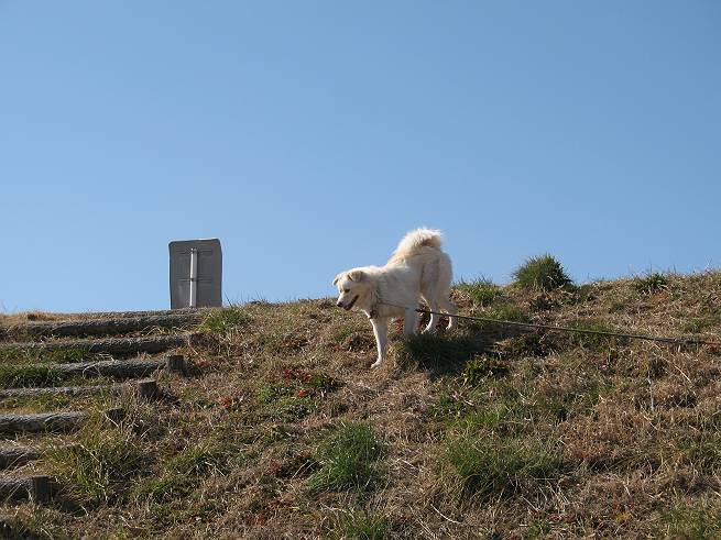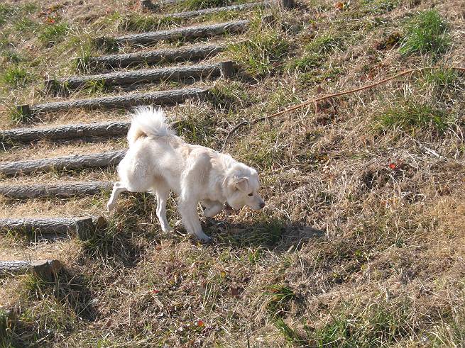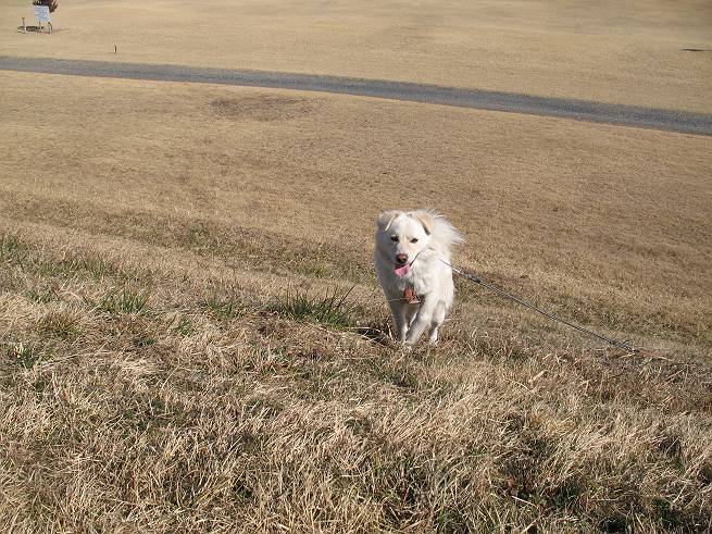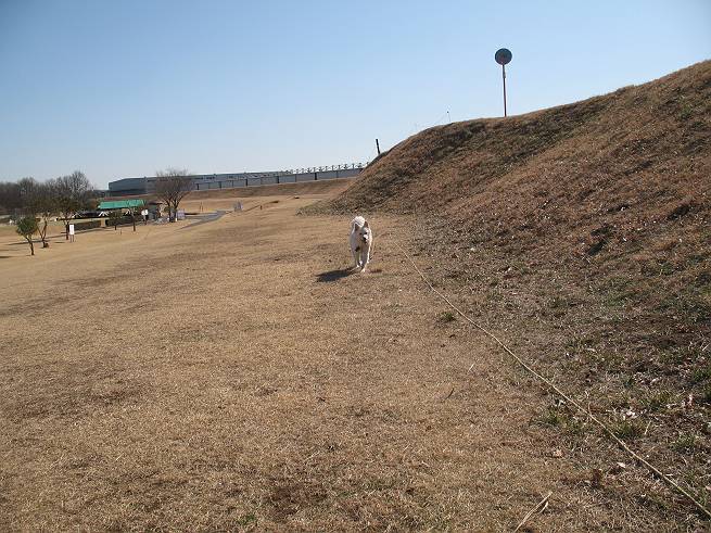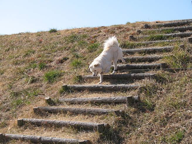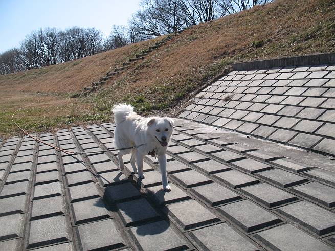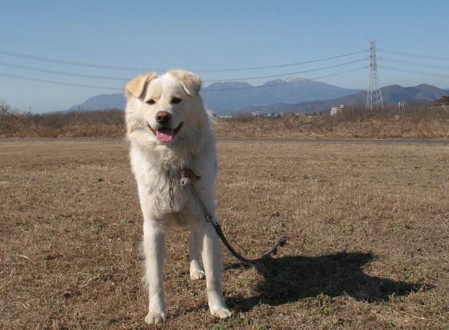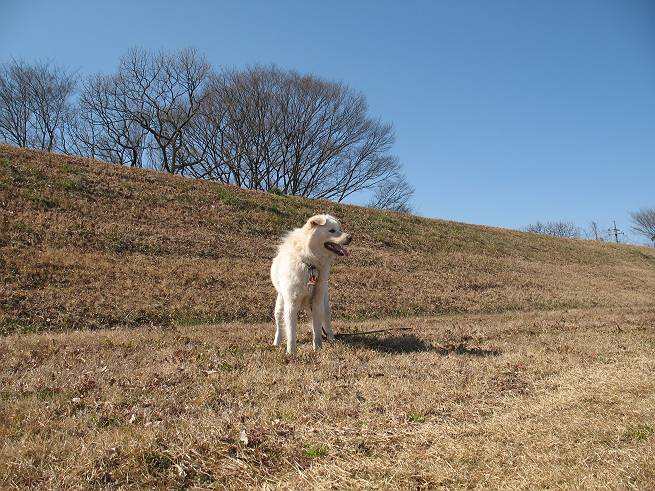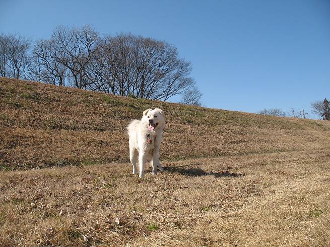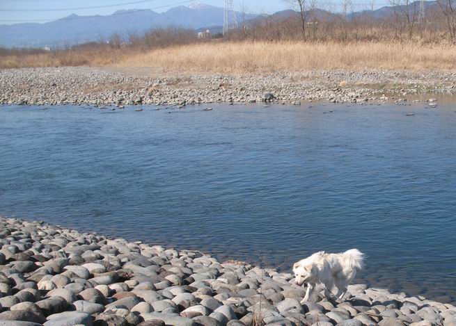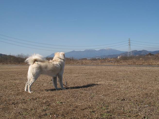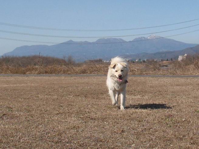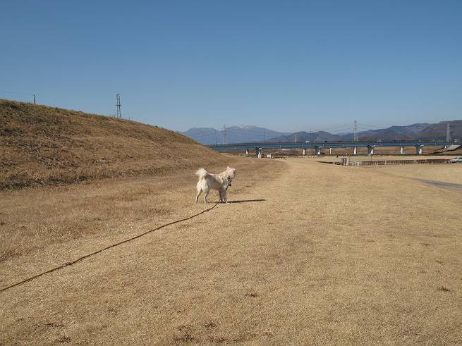 | 平成二十一年二月十二日 Before 写真集目次へ Next 午後の散歩は、渡良瀬川の河川敷で遊んできました。葉鹿橋付近から土手に沿って上ったり下ったりしながら下流方向に進みました。 土手を下って 義木の階段を下って また、土手に戻ったりして遊びながら歩きました。土手伝いに歩いたり、サイクリングしている人にも会いました。 中段からの河川敷の眺めが良いんですよ。 あっちが面白そうだ、もっと東へ歩いてみよう。 ここは水門です、中段は狭くなってます。 下からの道に出た所から折り返してきました。結構強い風が吹いています、でも暖かいですよ。 また、土手に上ろうかな。 ゴルフ場の端の所で中段に降りると、赤城山がキレイに見えてました。今日は葉鹿橋の上流まで行くことにしました。 水辺に沿って、コンクリートの上を歩きました。ぼくは水の中を歩きたかったのですが、「忠治、駄目!」と言われてしまいました。もう少し暖かくなれば、連れてきてもらえるでしょう。 運動場にでると赤城山が高圧線越しにキレイに見えてました。 赤城山を入れて撮ってもらいました。 最後はお父さんと競争しながら車に戻りました。背景は赤城山、左から鍋割山、荒山、地蔵岳、駒ケ岳、黒檜山です。 Before 写真集目次へ Next |