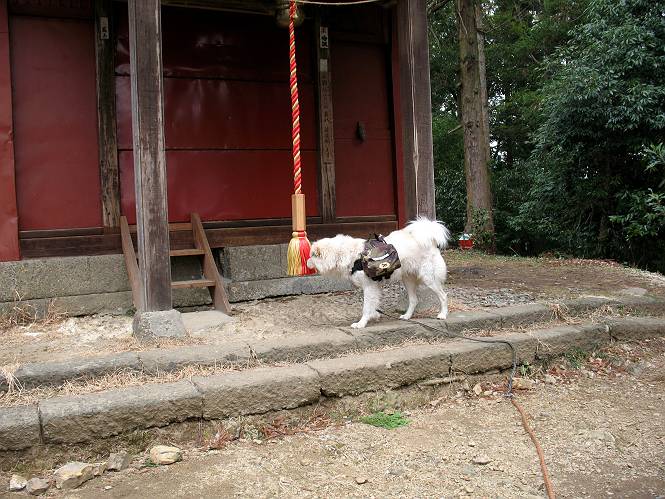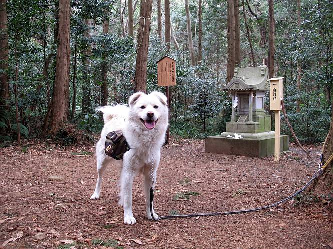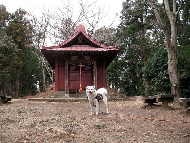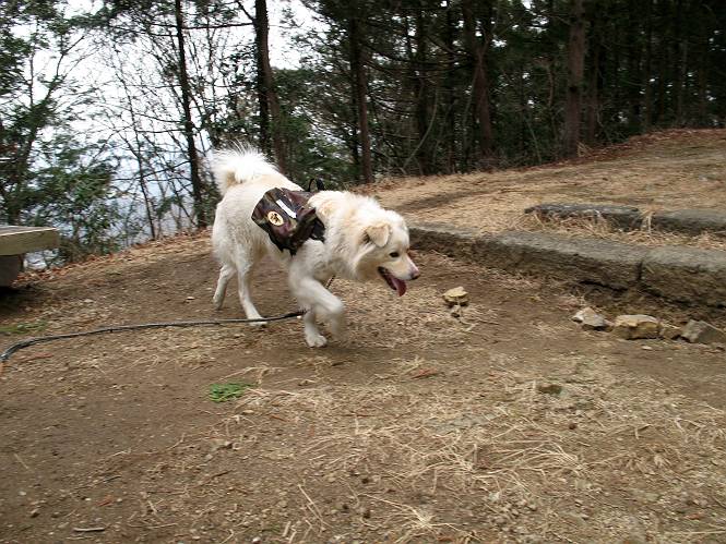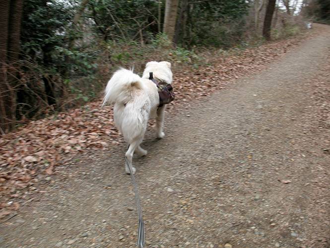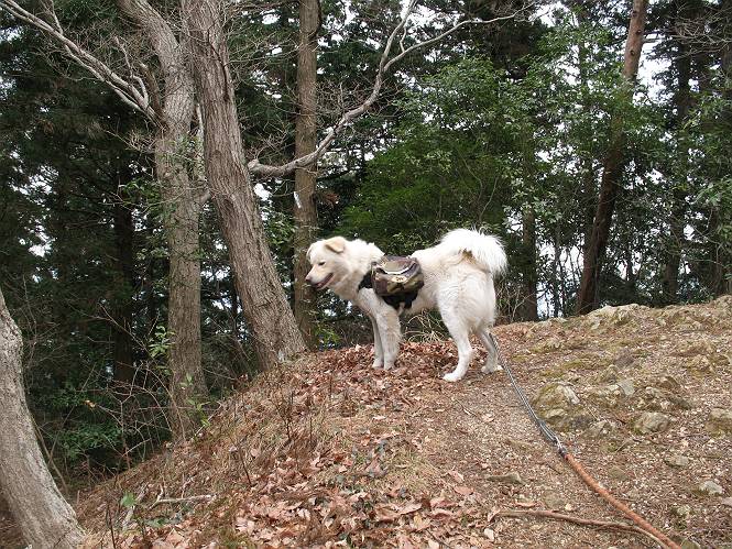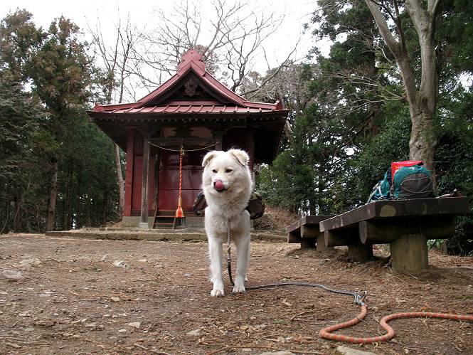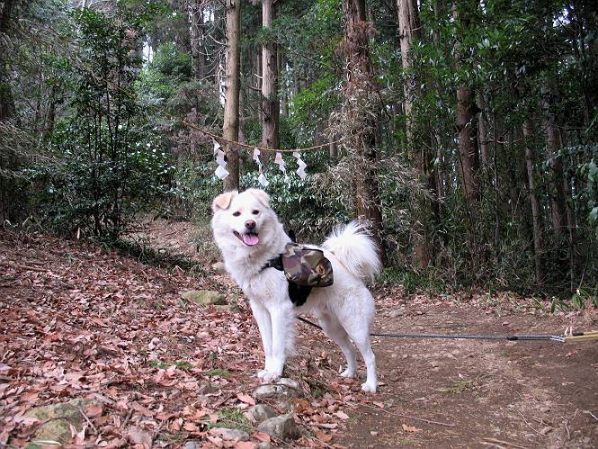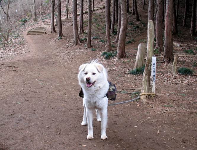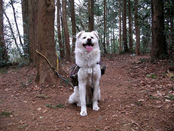 | 平成二十一年三月三日 Before 写真集目次へ Next 今日は昼頃から雪の予報でしたが、大平山へ連れてってもらいました。昨年お母さんがアジサイ見物をしている間に、下の方で散策してましたが、山ははじめてです。大中寺の駐車場から細い登山道を歩いて、大平山神社を通り、奥宮へ着きました。雪が少し降ってきました。ここは、杉森の中の登山道のすぐ脇で静かな所です。 のどがかわいたので、お水とついでにオヤツをもらいました。今回からぼくの荷物は自分で背負って歩きます。ネットでドッグリュックを買ってもらいました、色は迷彩で、3ケ所で固定します。今日は、片方に水とオヤツ、もう片方にぼくの必需品が入っています。カッコイイでしょう。 ちょっとお休みして、出発です。「こっちですか」 少し進んで、ゴツゴツした道を上ると、浅間神社にでました。ここの裏が大平山の山頂だそうです。 お父さんが、食事をしてまして、ぼくに見せびらかしているんですよ。おいしそう、ぼくもほしいなあ。 「これ、なーに?」、「引っ張って、上の鈴を鳴らすんだよ、駄目だよ、舐めちゃあ」 裏の山頂です。木が茂っていて、ぼくには何も見えませんでした。雪は時々ちらつく程度です。 「さあ、行くぞ!」、「ハーイ」 根っこと岩の間を通って、林道に出ました。 アンテナの所からまた根っこだらけの道を下って、ちょっと道草です。 下り終わると、ぐみの木峠に出ました。ベンチがあってお休み所になっています。 「こっちへ下って、駐車場に出るぞ」、「これで帰っちゃうのはつまらないなあ」、「また来ればいいさ」、「そうだね」 Before 写真集目次へ Next |