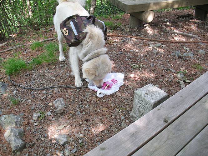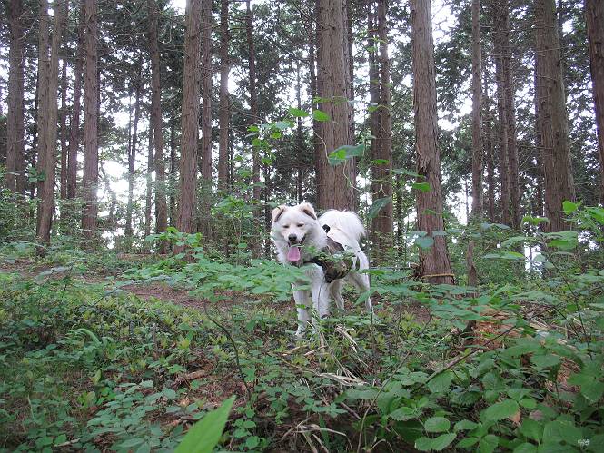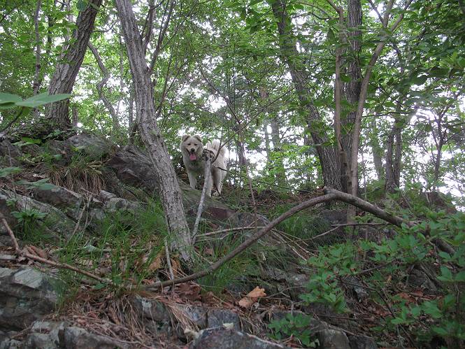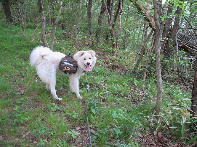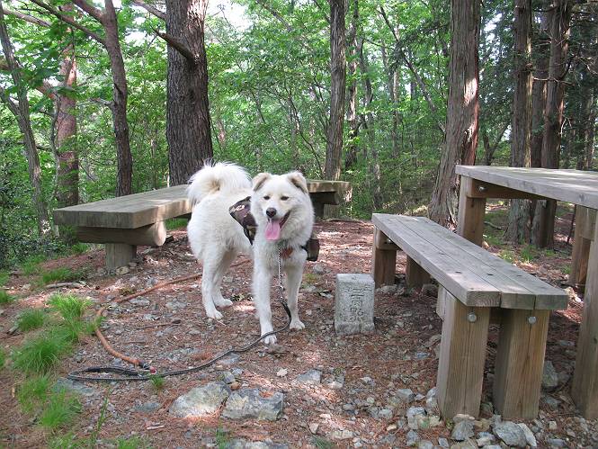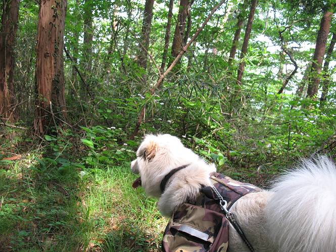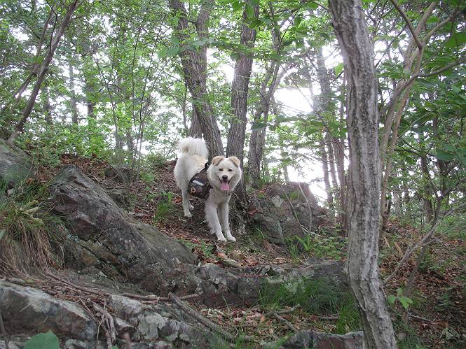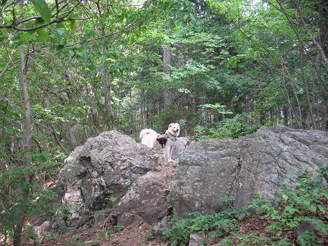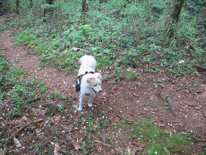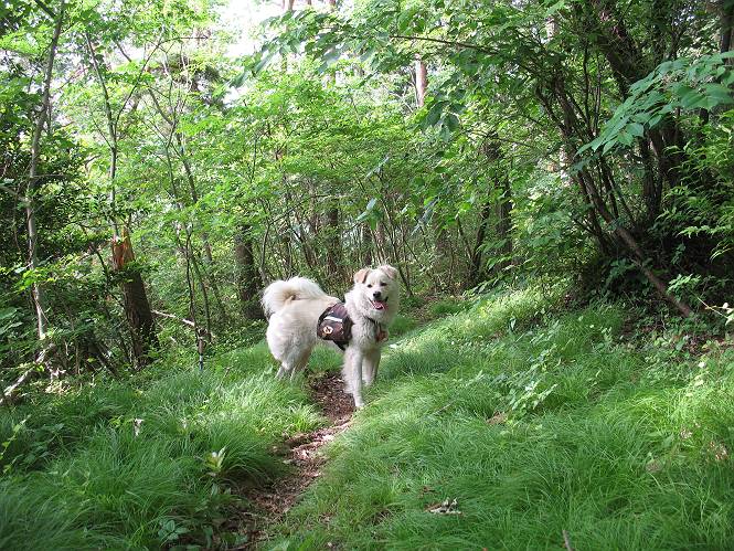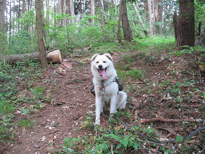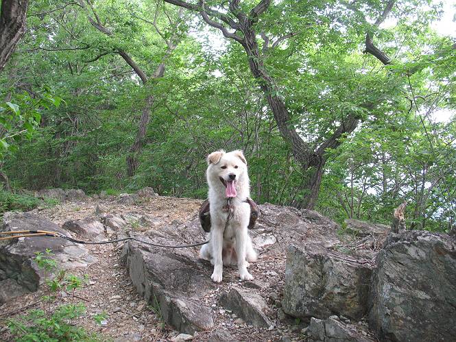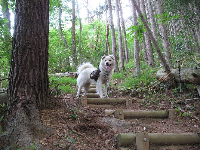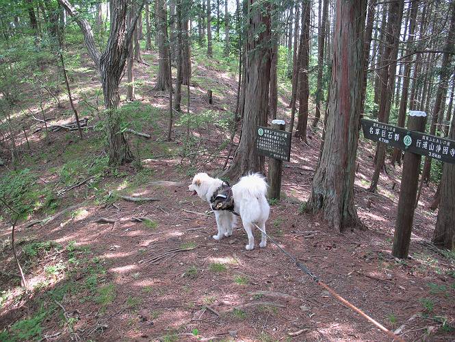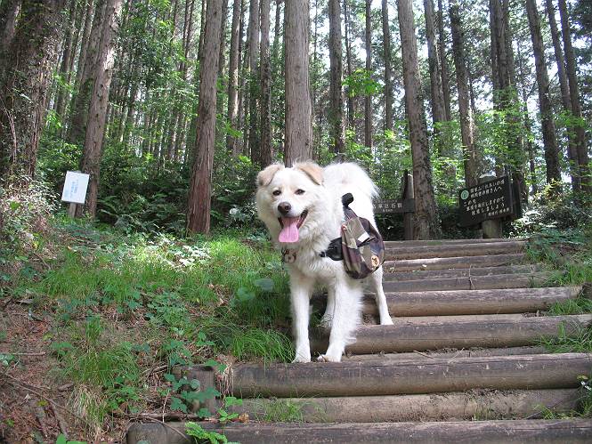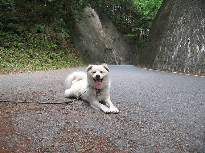 | 平成二十一年五月二十三日 Before 写真集目次へ Next 「忠治、今日は畳屋さんが来るから、お父さんに山へ連れてってもらいな」、なんてお母さんに言われて、早速やってきました。今日のコースは足利市松田町から月谷町へ抜ける道に馬打峠という所があります。ここから名草巨石群へ通じる関東ふれあいの道の一部を歩きます。 馬打峠にある道標です。片道2kmほどにある三角点のある無名の山(?)388mを往復するそうです。 木段を少し上ると、桧の林から明るい緑の雑木林に変わります。新緑と道際の草がきれいです。 再び桧の林に入ると、コアジサイがアチコチに咲いてました。 お父さんは、山の中へ入ってカメラを向けています。 少し青みがかった小さい花が沢山集まっています。 桧林の中のコアジサイです。 お父さんは下の方へ行ってしまいました。 戻ってちょっと歩いたら、またコアジサイを撮りに行ってしまいました。 また少し歩いたら、大きなエゴの木の下に出ました。お父さんは木登りしてます、花を撮っているのでしょう。ぼくの周りに落ちている白い花がエゴの花だそうです。 ぼくは一休みしてます。 エゴの花だそうです。 長い木段に出ました。もう目的の山頂は近いようです。お父さんは、「アチイ、アチイ」と言って汗を拭きながら歩いてますが、木陰が多いのと休み休みでしょ、自然の中で楽しいですよ。 また雑木林になりました、山頂はもう少しあるそうです。 ゴツゴツした岩が出てきました。お父さんは、下の方へ走って行きました。 ぼくも行きたいなあ。 「お父さん、まだですか、ワン」 「キンランが咲いていたよ」、と言ってました。キンランは野生ランの仲間で足利の山では沢山生えていたそうです。しかし、最近ではほとんど見られなくなってしまったそうです。 今度は大きな岩にでました。ぼくは岩の間から、ポンと飛び上がりました。 ここでお水を出してもらいました。全部で500cc位飲んでしまったようです。オヤツに干し肉2枚、あっという間に食べてしまいました、おいしかったでーす。 オヤツもらって歩きだすと直ぐに山頂でした。三角点とベンチが木漏れ日の中にありました。残念ですが、周辺の景色は全く見えません。 また、ドッグフード少々とホネを1本もらいました。 あっちへ行きたいなあ、どうなってるんだろう。 この方向に進むと、名草の巨石群に行くそうです。たっぷり休憩したあとは、来た道を真っ直ぐ、道草くわないで戻りました。 この木段を下ると道路に出ます。 ここが出発点の馬打峠です。お父さんは準備中です。ぼくはこうして、ひ・と・や・す・みです。このくらいの暑さは、平気です。また来たいなあ、ずうーと巨石群まで歩きたいでーす。 Before 写真集目次へ Next |