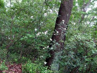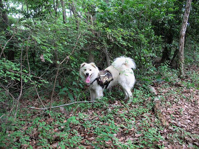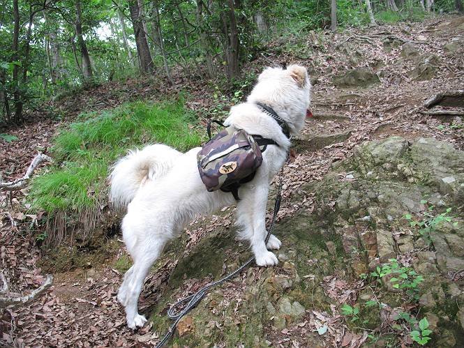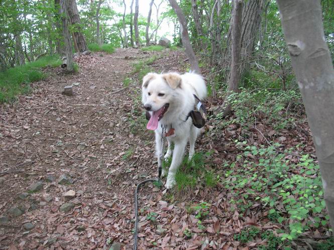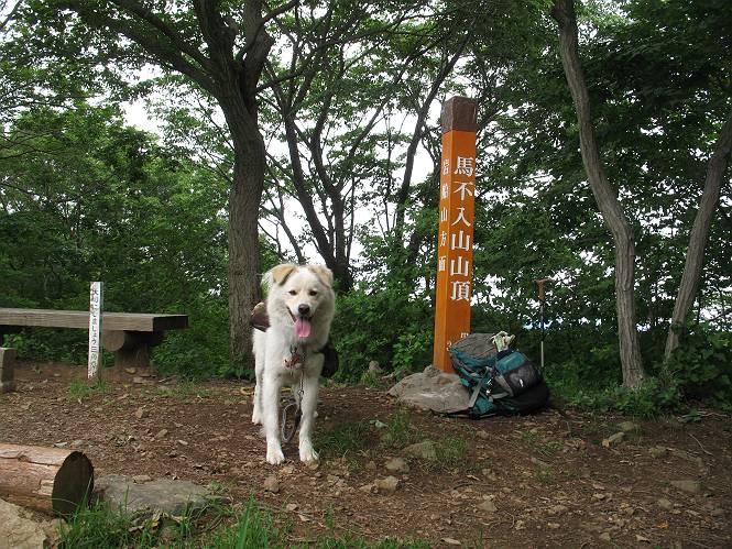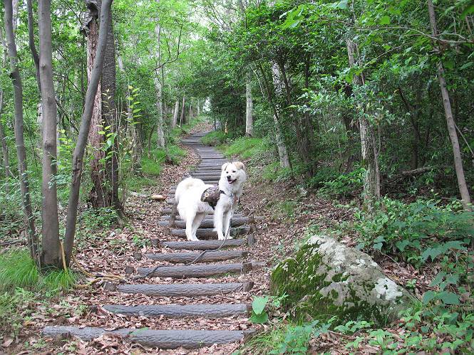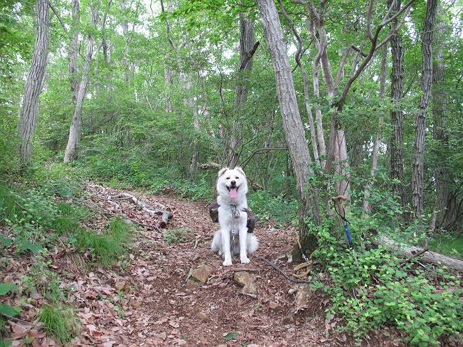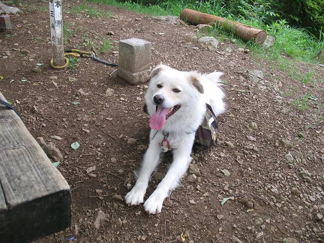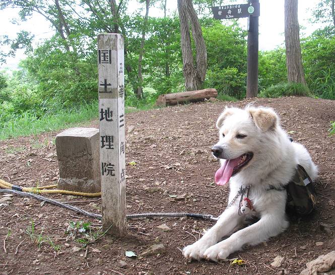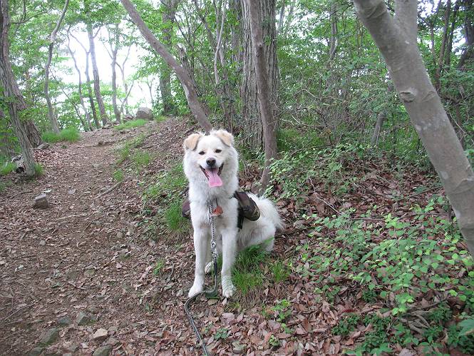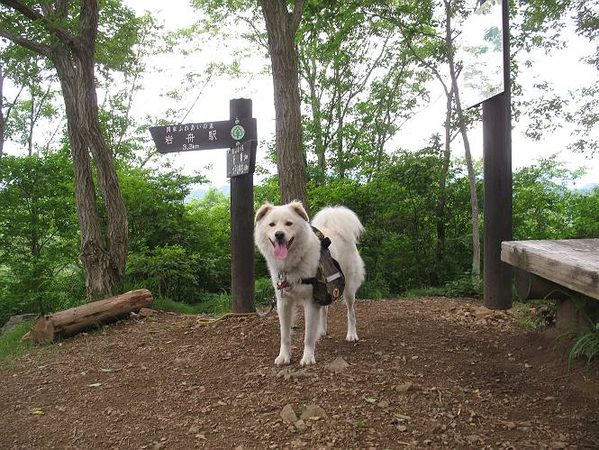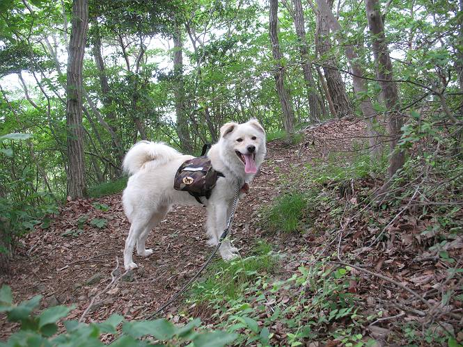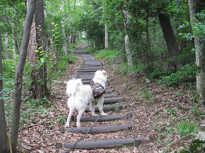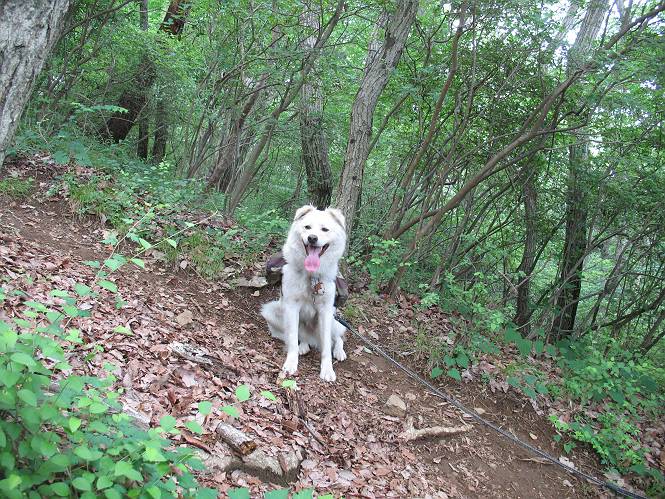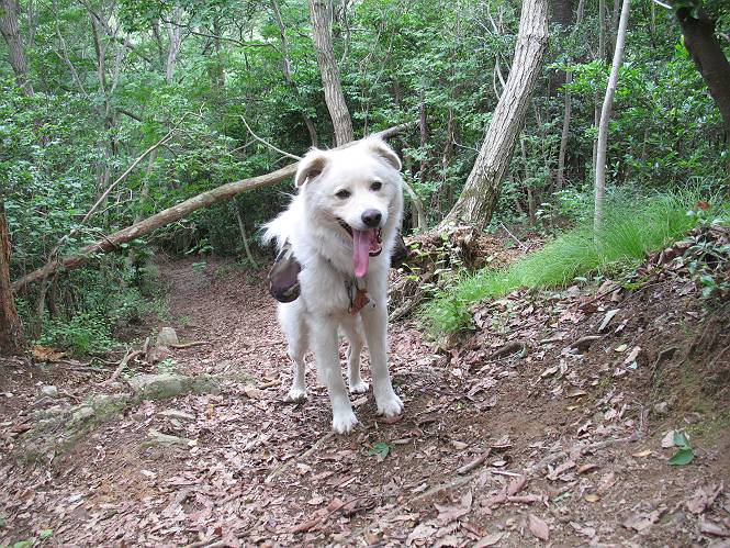 | 平成二十一年六月七日 Before 写真集目次へ Next 朝から青空が広がり良い天気となりました。お父さんは山へ行く準備をしています。また、ぼくは留守番なのかな、と思っていたら、ぼくのリュックと長いリードを車に積みました。うれしい、キャッ、キャッ吠えたら、「忠治、静かに!」、と言われてしまいました。栃木の大平山系の馬不入山へ行くそうです。実は、3月に歩いた大平山は、予定ではこの馬不入山だったのです。馬不入山と岩舟駅を結ぶハイキングコースの道路と交わる峠付近から馬不入山を往復します。「距離は山頂までたったの1.2kmしかないが、急坂だぞ」って言ってました。何だかここに着いたら曇ってしまって、山の中は薄暗く感じます。 ここから歩き始めました 高圧線の鉄塔まで真っ直ぐ丸太の階段を歩きます 鉄塔から右に曲がって、岩混じり道に変わりました。 急坂がずっと続いてます、「ハッ、ハッ、お父さんが止まっちゃった、ワン」 ぼくも藪の中をちょっとね。 義木の階段、これも長いですねえ 「あれ、何だ、あの音は?」、「チンコン、チンコンという音か?」、「そう」、「踏切りだよ」、「そう、電車が通るんですか?」 ここは緑に囲まれた明るい場所で気持良いですよ。お水を飲みました、持ってきた半分。250ccほどかな。 モミジイチゴが橙色に熟れてました。 そして小さなピークに出ました、丁度中間点のようです。 また、ひ・と・や・す・みでーす。 ここからしばらく下ります。はじめは緩やかに、そして急坂になって鞍部にでました。 上りにかかりました、もう少しで山頂のようですが、キツイ坂道で一休みしてます。 また一休みして頑張ります。 やっと馬不入山山頂に着きました、休憩です。 ぼくたちの後から一人、反対側からも一人到着しました。遠くから電車に乗って、岩舟駅から歩いて栃木駅に抜けるそうです。もう一人の方は大平山に戻るそうです。その方は「後からいっぱい来るよ」、って言ってました。 山頂のプレートです。 南東の街だそうです。 こちらは南方向で見える山並は大小山だそうです。 ナルコユリが咲いてました。 コアジサイや野ばらも咲いてました。 山頂の記念写真を撮ってもらいました。 もう一枚山頂での記念写真です。ここからちょっと北方向に進み、来た道をゆっくり下って戻りました。まだ曇ってます。 家に帰って、アチコチをかいていましたら、お兄ちゃんが「忠治、ダニだ」、と7,8匹捕ってもらいました。薄っ平な赤い小さいダニでした。つづいてお父さんにも捕ってもらいましたが、まだかゆくて、かゆくてたまりません。お父さんは、「忠治、シャンプーするか」、って言ってます。どうしよう、「ワン」 Before 写真集目次へ Next |