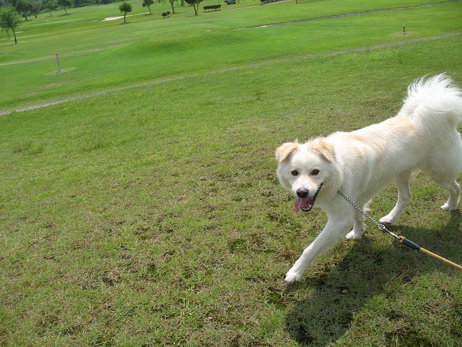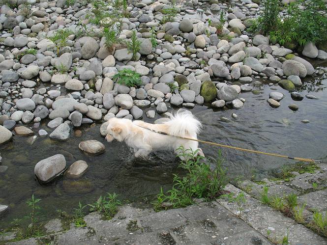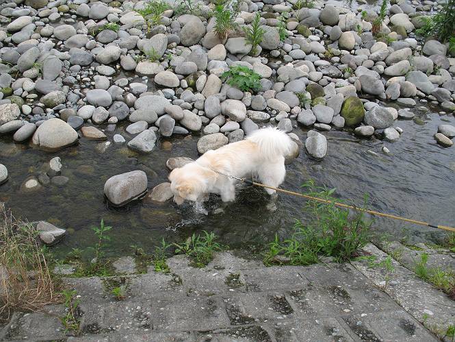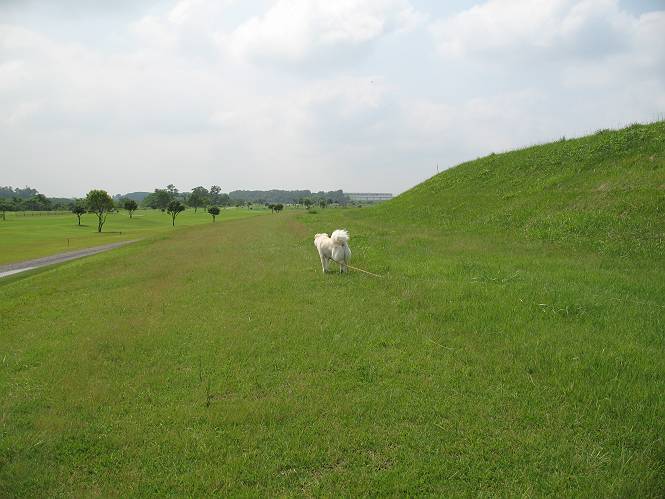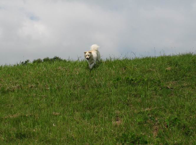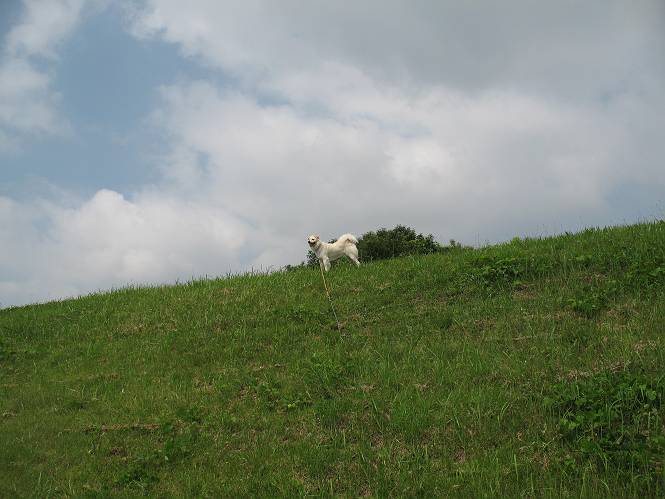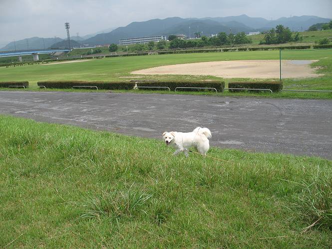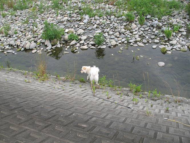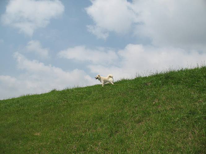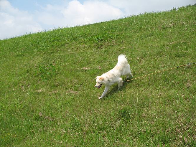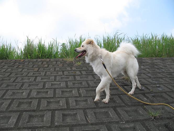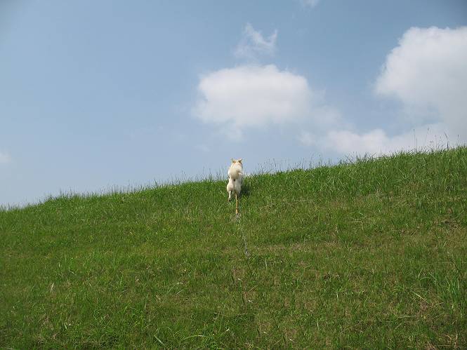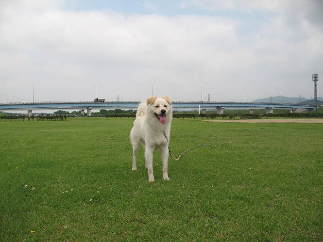 | 平成二十一年六月十七日 Before 写真集目次へ Next 久しぶりに渡良瀬川の河原へ連れてってもらいました。緑がまぶしい感じがしました。所々に赤や黄色い花が咲いてました。土手や草むらを走って、シャンプーしたばっかりですが、寝転んで草の感触を楽しんだ後、東の方へ歩いていきました。 「もっと向こうまで行きますか」 「橋みたいなものが見えてきましたよ、土手に上ってみよう」 よっこらしょい、上ったぞ 「見えた、見えた、橋ですね」、「鹿島橋だよ」 ここの眺めもいいなあ、ゴルフ場にも、川の中にも、人が見えるよ。働いている人も見えますよ、点検かな? 下りるぞ! 「楽しいね、♪♪♪」 「見てきたよ」 「川の方へ行きたいなあ」、「いいよ」 「お水飲んでこよう」 「どこで飲もうかな、この辺にしよう」 「冷たくて美味しいですよ」、それから浅瀬でひとりで遊びました。お父さんは堤防に腰を下ろして休んでました。 そして、堤防を上って グラウンドを抜けて 葉鹿橋をバックに1枚撮ってもらいました。赤城山は雲に隠れて見えませんでした。今日はダニ、大丈夫かな。 Before 写真集目次へ Next |