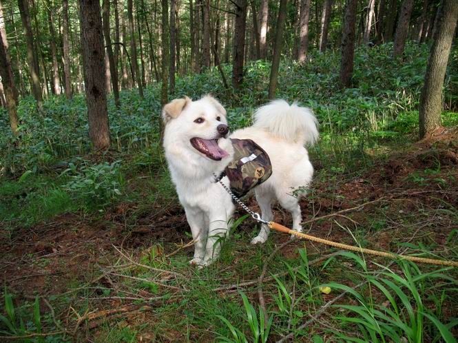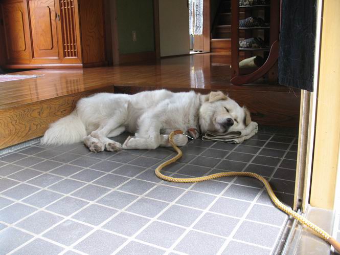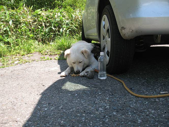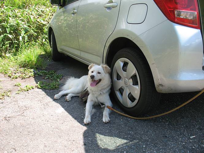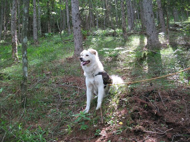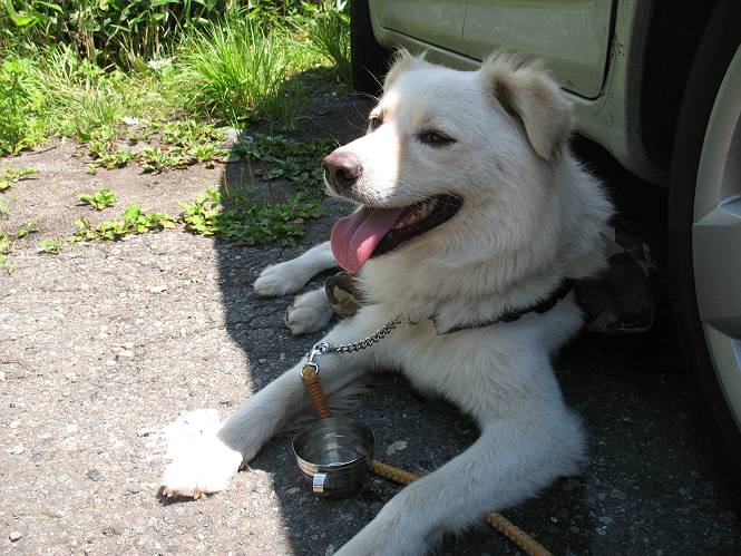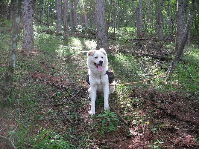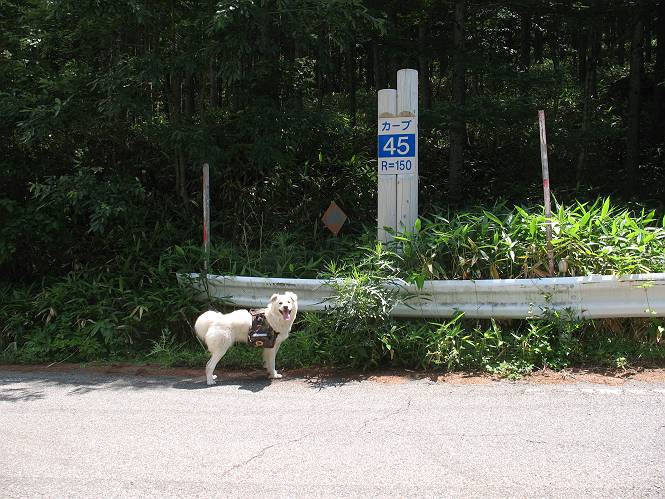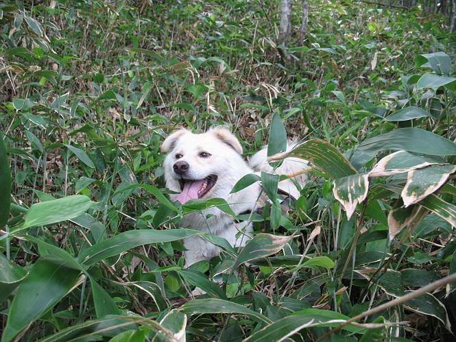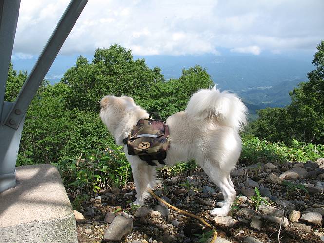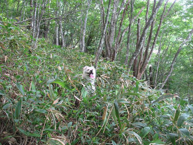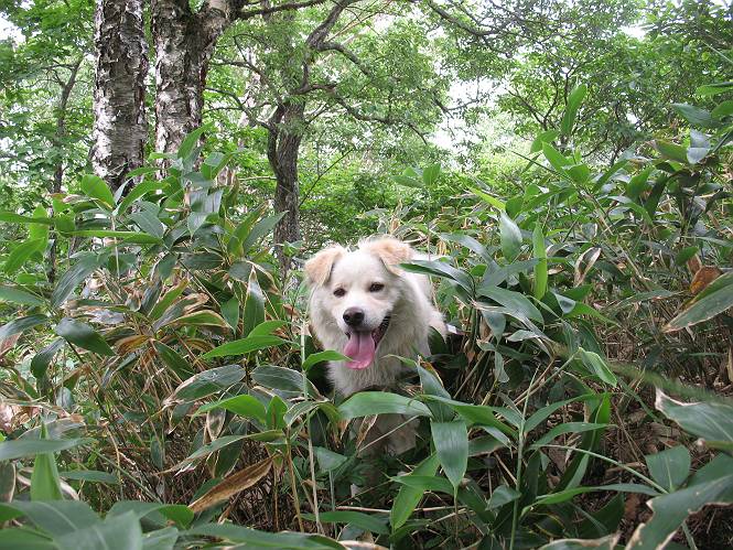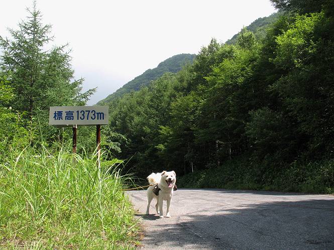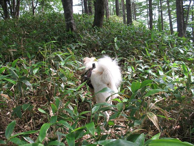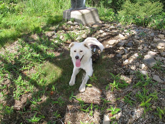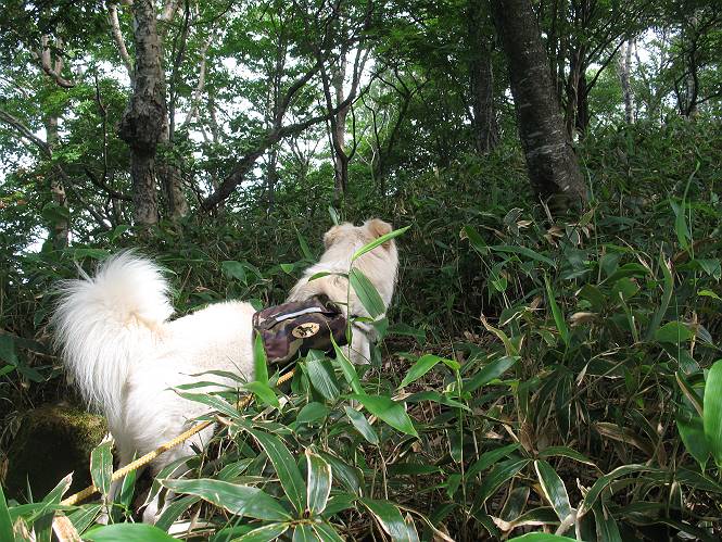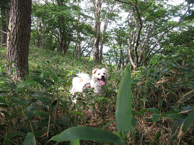 | 平成二十一年七月二十日 Before 写真集目次へ Next 朝の散歩から帰ると、「忠治、赤城山へ行って来るか」って、お父さんが言いました。うれしくって、「キャッキャ、キャッキャ」、ぼくのリュックにオヤツとお水を持って「出発!」 今日は赤城山で一つ残っている小黒檜山だそうです。この山は最高峰の黒檜山の北側にあって、あまり訪れる人のない山で道もないんですって。大沼から沼田へ向かって走り、五輪峠を越えて下ると黒檜橋に出ます。ここから歩き始めました。 お父さんが準備していて、「しまった、自分の水と食料を忘れちゃった」、と橋からのぞいていました。「いいや、あまり時間はかからないだろう」、とそのまま出発です。道路からカラマツ林へ草を分けて入りました。 笹のない斜面を選びながら、しばらく歩き小休止です。 どちらを見ても笹が生い茂っています。 こんな感じの斜面を急登します。 まだ首が出るところは良いのですが、ぼくは笹に沈んで先が良く見えないんです。深い所はピョンピョン跳ねながら、岩のゴロゴロした所も通りました。時々「コッチだぞ!」言われて向きを変えました。 「ヨイショ、ヨイショ」、このくらいの笹ならいいのですが。 もう少しで、尾根に出るそうです。 やっと尾根に出ました。 木の間に黒檜山が見えてます。 まだずっと笹が続いているようです。 ここからも深い笹と枯れ枝に足を取られながら、進みました、もうヘトヘトになりそうでしたが、「忠治、もう少しだ、ガンバレ」、と山頂を前に休みました。そこから見た黒檜山です。小黒檜山はここまで来ても見えません。 「もう少しだって、ぼく頑張るぞ」 ここの笹は低いですが、ほとんどぼくは沈みっぱなしです。 やっと、電波の反射板のある小黒檜山山頂に着きました。 こちらの方向が沼田方面だそうです。山は雲に覆われてます。 お水をいっぱい飲んで、ダニを払ってもらって、ひと休みしてます。丁度反射板の陰で気持良いですよ。 下りはラクチン、お父さんにぴったりついて急斜面を下りました。ここが道路に出たところです。 反対側に、標高1373mの大きな看板があり、背景に今登ってきた小黒檜山1644mが見えています。 そして、車を止めた黒檜橋です。水はありませんでした。スピードを出して走っていく車に注意しながら撮ってもらいました。 「距離は短かったようですが、結構きつかったですよ、何しろ道がないんですから」 オヤツを頂きました。いろいろミックス、おいしかったでーす。 お水飲んで、今日も楽しかったでーす。これで赤城山の1/25000地形図に出ているピークは完歩だそうです、バンザーイ。 帰り、街中の信号で停車した時、「忠治、顔がダニだらけだ」、と言われ撮られました。 「ぼくには見えないのですが、やだなあ、ワン」 家に帰り、さっそくダニをとってもらいました。ぼくも3匹、足、尻尾についていたダニをやっつけました。全部で12匹、「まだ、たくさんいるぞ」、ってお父さんが言ってました。 2009年7月21日 ぼく、昨日は疲れちゃったみたい。夕べも良く眠ったし、今日は朝からこんな格好で失礼してます、すみませんねぇ、ZZZ。 Before 写真集目次へ Next |
