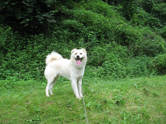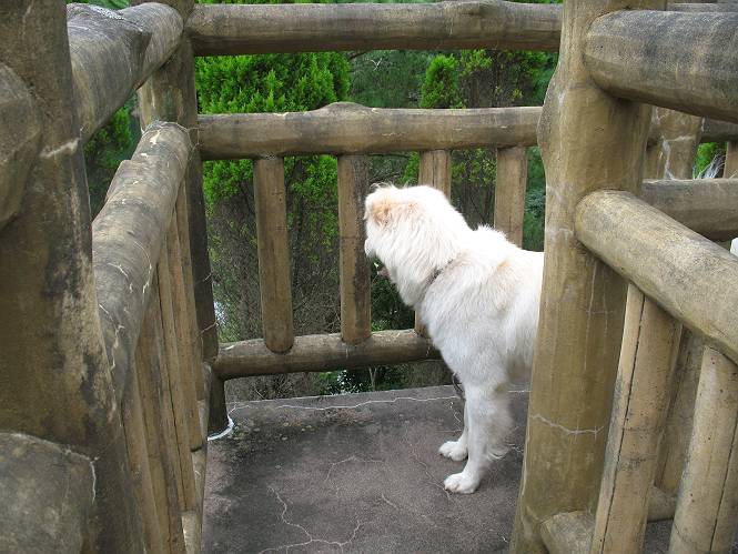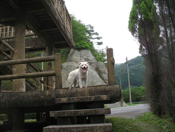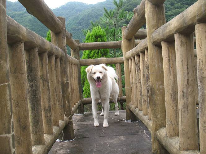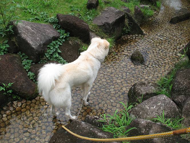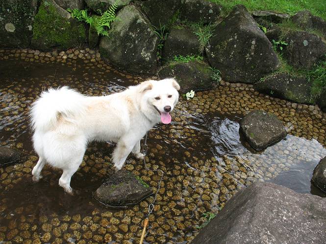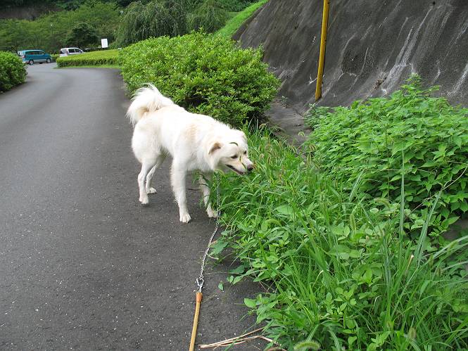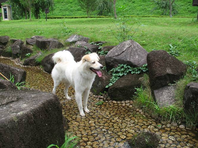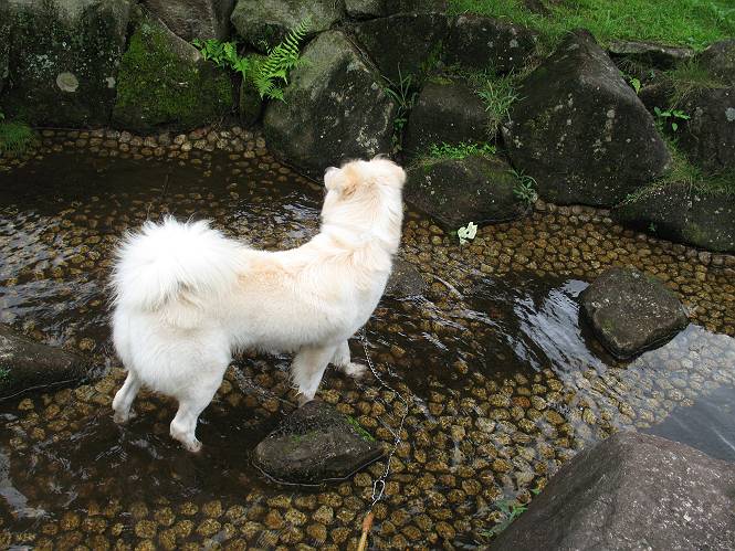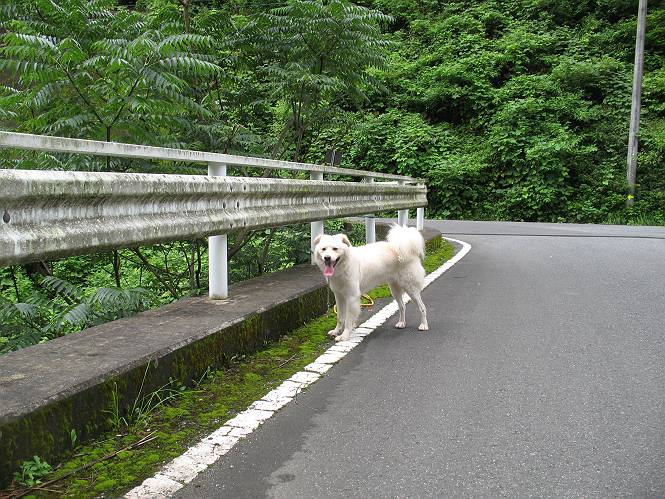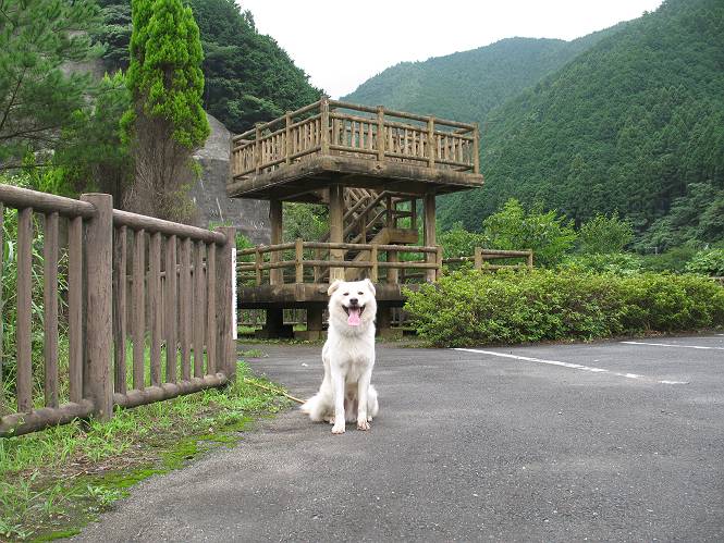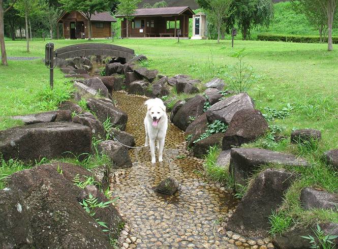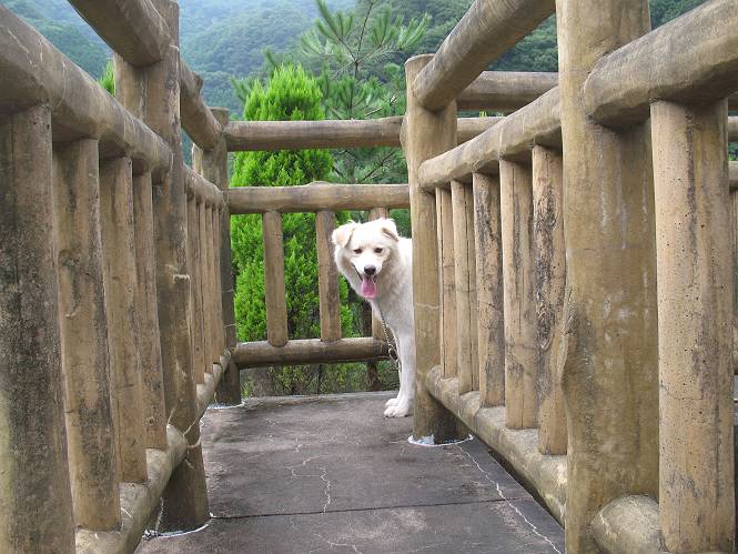 | 平成二十一年八月八日 Before 写真集目次へ Next 雨の降りそうな天気でしたが、足利の松田町の奥にある松田川ダムへ連れてってもらいました。下の広場はイベントでしょうか、沢山テントが張られ、駐車場もいっぱいでした。上の赤雪山駐車場付近に停車して、ダムの周回路をキャンプ場まで遊びながら往復しました。 ダムの周りには、いくつか展望台がありますが、ここは北側の展望台です。 お家の物置の階段は怖いのですが、この階段は平気です。 一番上の段に上ってきました。間からダムが見えます。 こっちは降りるのかな? ひと回りできるんだ キャンプ場の水路でお水を飲みました。ついでに、・・・・・・・。 ポチャ、ポチャ歩いてしまいました。 水量も少なく、足の先がつかる程度でした。 「なーに、管理人のおじさんに叱られちゃう?」 「じゃあ、そろそろ上りまーす」 一番奥の遊び場に行きました。丸太が階段状に吊ってある遊具に挑戦しました。真ん中まで上手くいきましたが、こけてしまい芝生の上に落ちてしまいました。見事失敗です。 道草を食べながら、右へ行ったり、左に寄ったり、遊びながら歩いています。 野山橋の上で一枚撮ってもらいました。 山の斜面から落ちた水が側溝を流れています。お水で喉をうるおしました。間もなく、駐車点に戻りました。昨日シャンプーしたばっかりなので、今日は草むらに入りませんでした。ダニは大丈夫でしょう、だってさ。 Before 写真集目次へ Next |