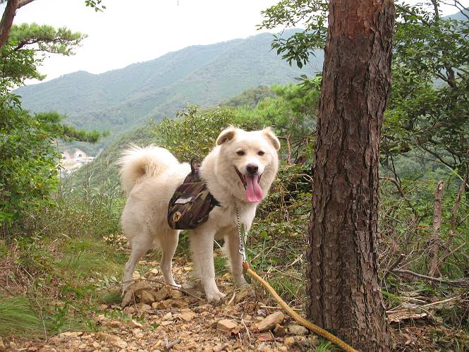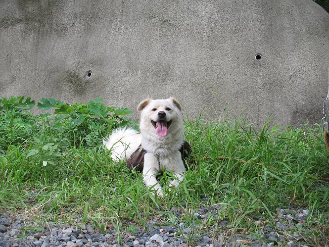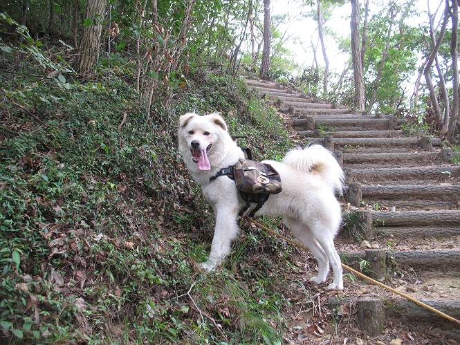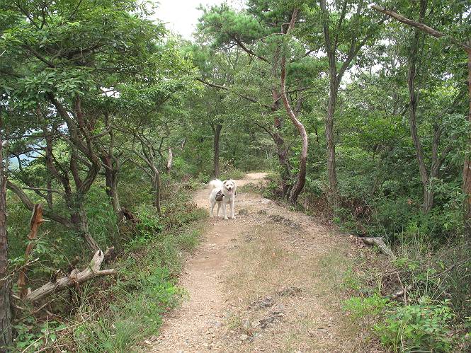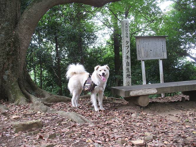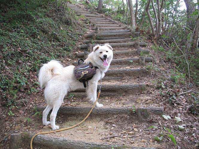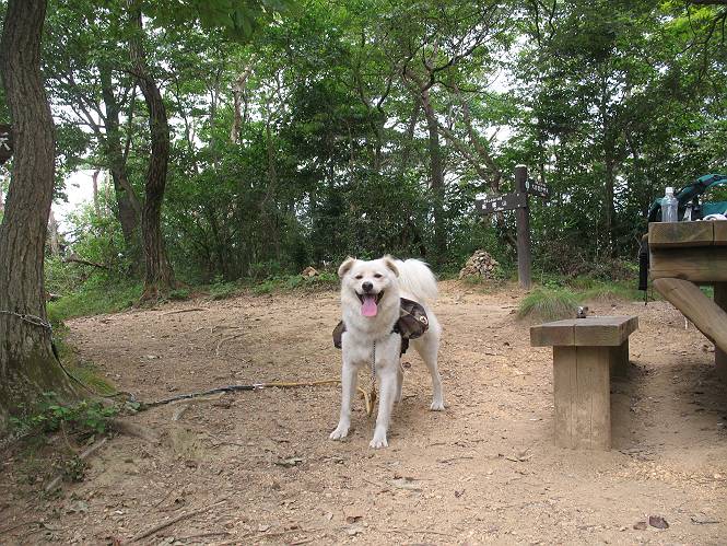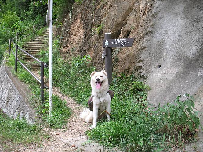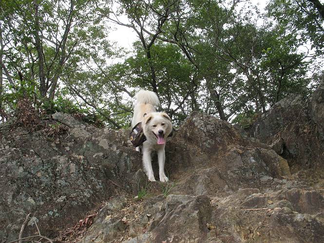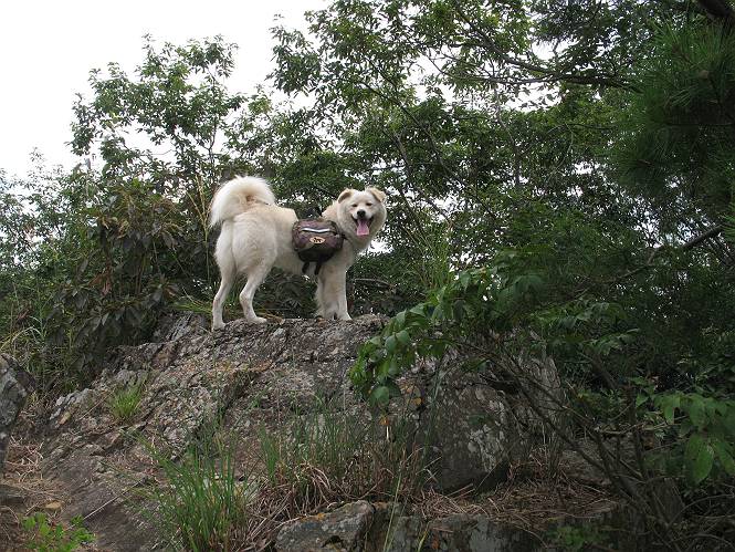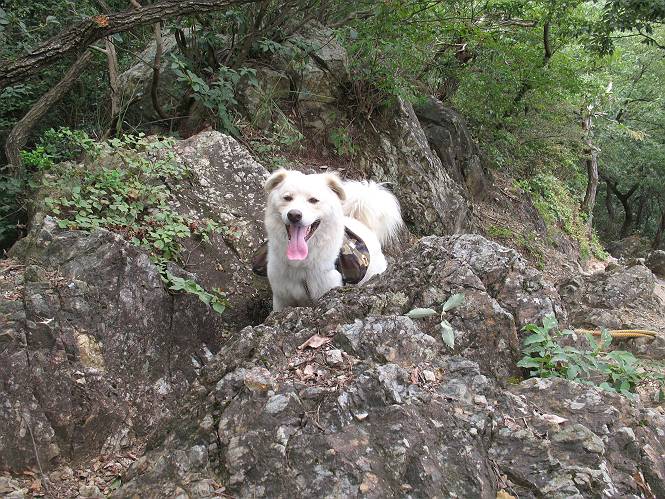 | 平成二十一年八月三十日 Before 写真集目次へ Next 今日は日ざしが弱いので、1ケ月ぶりに足利の両崖山に連れてってもらいました。大岩山へ行く途中から砂利道を少し走ると、両崖山の尾根の切通しに出ます。ここから歩きました。丸太の階段を上ってしばらく歩くとベンチのあるピークに出ます。ここから雷電神社の方へ下りられるようです。曇っていますが、毛皮を纏っているぼくは暑くてたまりません。 ベンチのあるピークで早速休憩です。 リュックからお水を出してもらって飲みました。 平らな広い道を少し進みました。枯れた松の木が沢山あったそうですが、すっかり伐採されていました。 ちょっと進むと小さな岩場に出ます。足利の街が右に左に見えてきます。 ここの岩は、ぼくが入れるほどのミゾがあるんですよ。 岩場を下る、こんな格好で一枚撮ってもらいました。 ここで岩場は終わりですって。 ぼくの後ろ下、大岩山の麓の方の山肌に2つ穴があいています。これは高速道路のトンネルだそうです。 ここからちょっと進むと、またベンチのある見晴らしのいい場所にでます。3名が休憩してました。ぼくを見て、お父さんを見て、話しかけてきました。なんと、知り合いの方だったのです。おばさんから、りんごとお菓子を頂きました、おいしかったでーす。ついでに、リュックからオヤツを出してもらって、全部食べてしまいました。後ろは以前歩いた天狗山です。 お父さんは、皆さんとお山の話に盛り上がってました。ぼくは、待ってましたが、時々通る人が、頭を撫でてくれました、うれしかったですね。後ろは大岩山です。 下ってすぐに階段をまた上るのですが、「お父さん、コッチ・・・・」、「ヤブはダメだよ」 「ソッチだ、まっすぐ上に・・・・」 ここを上るとすぐに両崖山の山頂でした。沢山神様が祀られているようです。お祈りしている人もいました。 こちらには、タブノキの自生地の案内板とベンチがありました。この辺一帯は昔タブノキで覆われていたそうです、って。少し休んで来た道を戻りました。 車の停めてある切通しに戻って、撮ってもらいました。 お父さんは、帰る準備をしています。ぼくは、また休憩しています。今日は、お山を歩いて、オヤツいっぱい食べたし、満足だすワン。 Before 写真集目次へ Next |