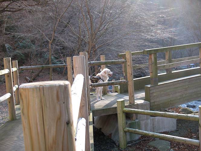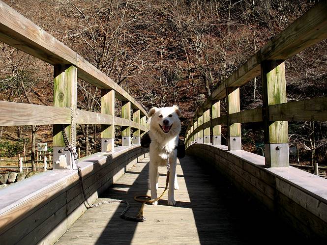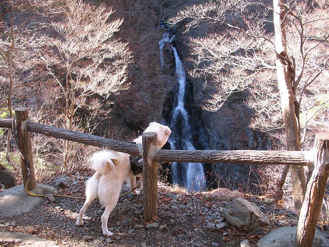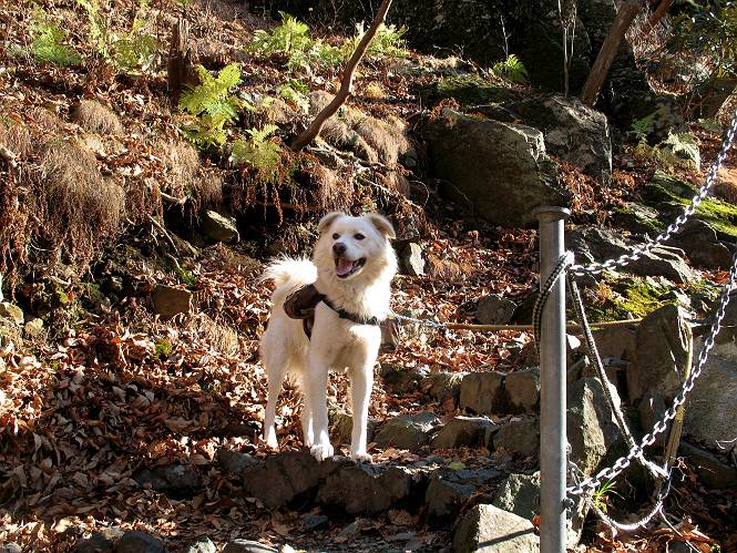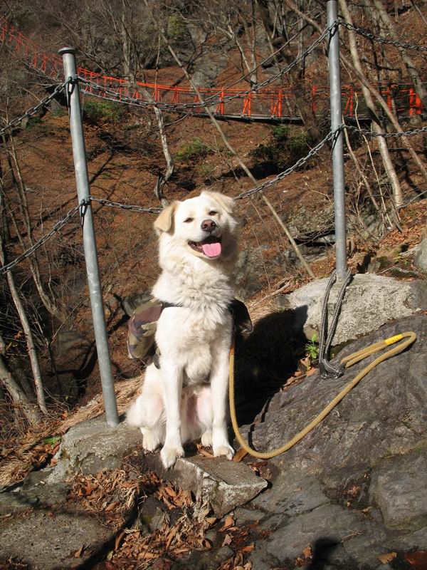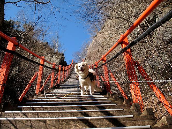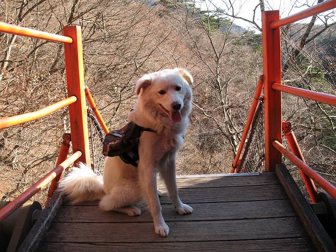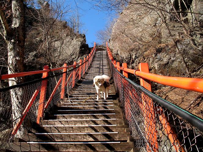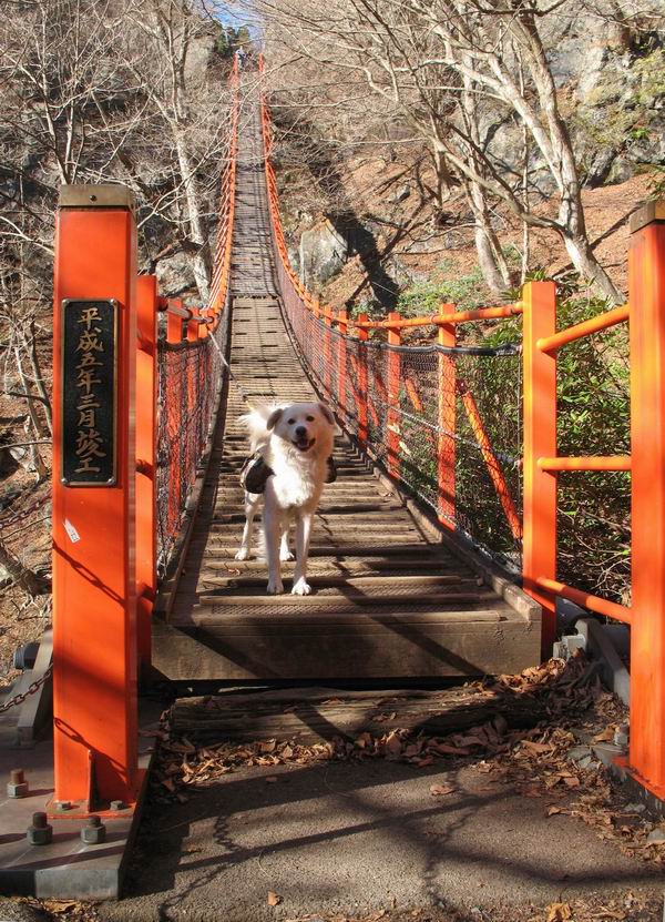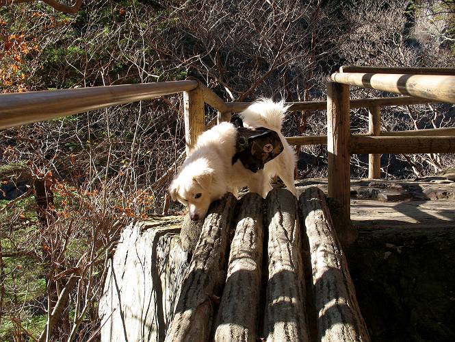 | 平成二十一年十二月二日 Before 写真集目次へ Next ここはどこでしょう? ここはね、みどり市の奥、足尾山系の袈裟丸山から流れる小中川にかかる大滝遊歩道の源太橋です。この橋を渡ってケサカケ橋という吊橋を渡って大滝を眺めにやってきました。 橋を渡ると左手に東屋がありましてお休み所になってます。春はこの斜面にアズマシャクナゲなどお花がいっぱい咲くそうですよ。 ここから柵のついた石段を上って行きます。 「なんだ、あれ、穴っぽがあいてる」、「トンネルになっているんだよ」 小さいトンネルをくぐると、ケサカケ橋という弓形の階段状になった吊橋に出ました。お母さんは、「忠治の後ろ足がふるえているよ」、と言って先に下ってしまいました。お父さんは直ぐ前にいるのですが、高いのと揺れるのが怖いんですよ。 やっとここで半分だそうです。 もう少しで到着です、少し平になった所で一休みです。まわりを怖くて見られないんですよ。 やっと着きました。スゴイ橋でしょう。 山の斜面に造られた細い道を歩いて柵に囲まれた滝見台に来ました。ちょっとのりだして下を眺めると、先ほどの橋が枝間に見えてます。 下は断崖絶壁ですよ、コワコワです。 でも、眺めたいね、うわっ、こっちもだ。 この橋も夢中で渡りましたが、この下も深いなあ。 南側の山陰に大滝が大きな音を立てて落ちてました、落差は96mあるそうです。 山際に戻って柵の先端まで歩きました。ぼくは、こっちを歩く方が得意だなあ。 戻って、今度は下の滝見台へ移動しました。水の落ちるのってスゴイですね。小さい滝は幾つか見ましたが、こんな大きな滝ははじめてです。 ケサカケ橋を入れて撮ってもらいました。 お水とオヤツをいっぱいもらいました。美味しかったでーす。 橋の一番上のトンネルの所まで戻りました。帰りは幾分慣れましたが、でも揺れるのが嫌だねえ。 ぼくは、やっと、でした、ここまで来れば安心です、一休み。さっきね、ぼくの後ろから来た女の人でコワーイって、戻ってしまった人がいたんですって。 源太橋を渡って、駐車場です。楽しかったけれど、ケサカケ橋は怖かった。でも、また来たいなあ。 Before 写真集目次へ Next |