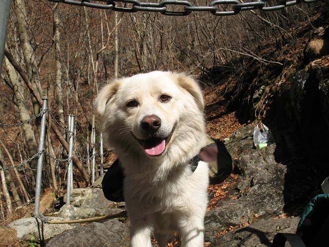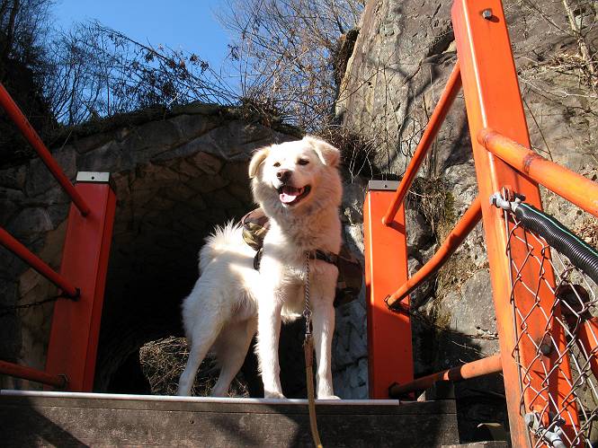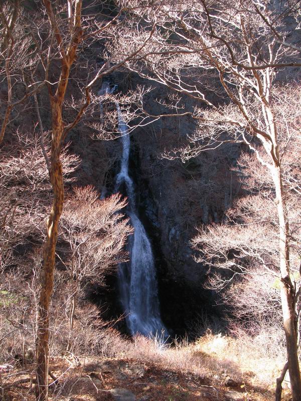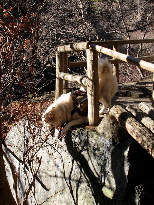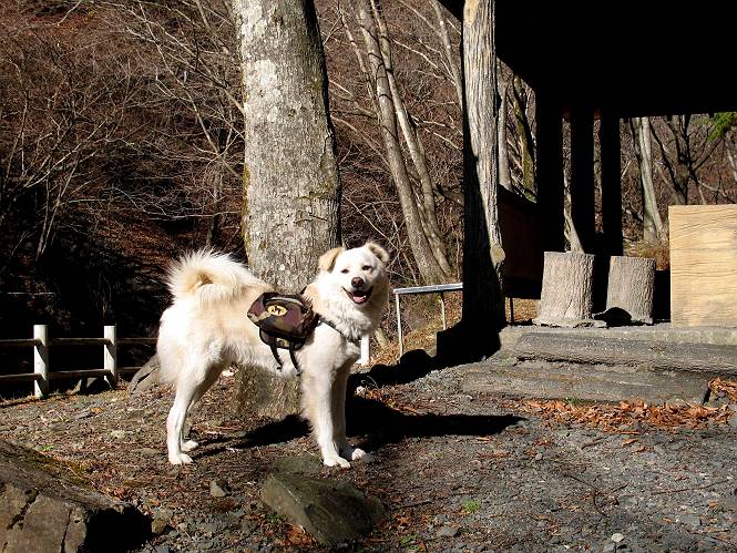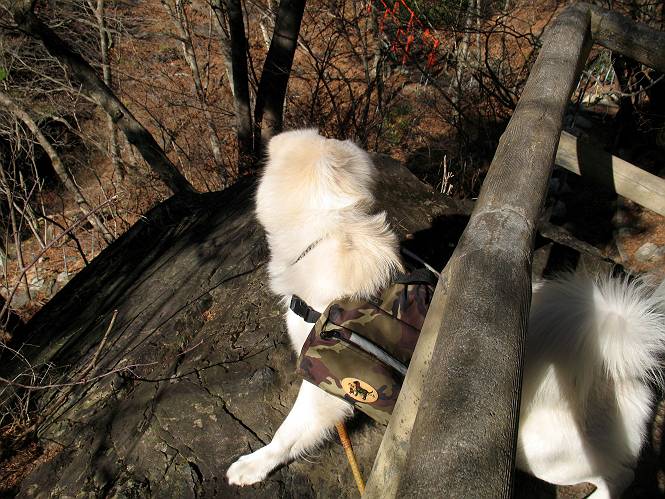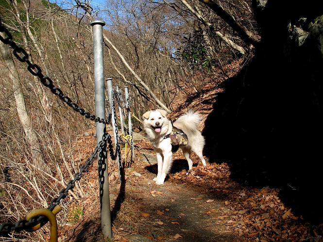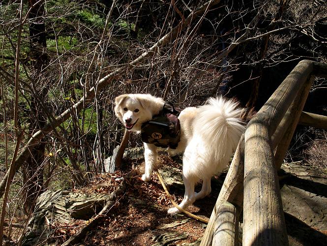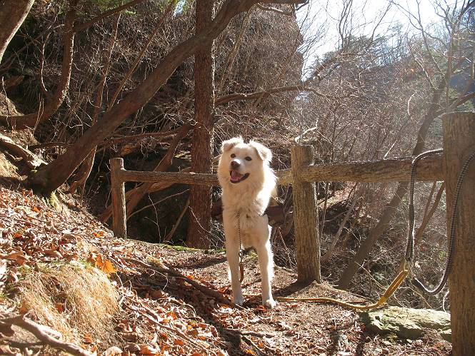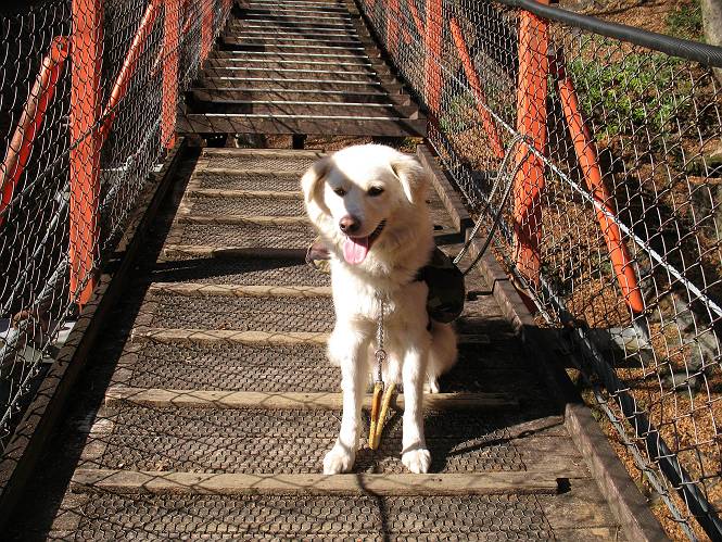 | 平成二十一年十二月二日 Before 写真集目次へ Next ここはどこでしょう? ここはね、みどり市の奥、足尾山系の袈裟丸山から流れる小中川にかかる大滝遊歩道の源太橋です。この橋を渡ってケサカケ橋という吊橋を渡って大滝を眺めにやってきました。 橋を渡ると左手に東屋がありましてお休み所になってます。春はこの斜面にアズマシャクナゲなどお花がいっぱい咲くそうですよ。 ここから柵のついた石段を上って行きます。 「なんだ、あれ、穴っぽがあいてる」、「トンネルになっているんだよ」 小さいトンネルをくぐると、ケサカケ橋という弓形の階段状になった吊橋に出ました。お母さんは、「忠治の後ろ足がふるえているよ」、と言って先に下ってしまいました。お父さんは直ぐ前にいるのですが、高いのと揺れるのが怖いんですよ。 やっとここで半分だそうです。 もう少しで到着です、少し平になった所で一休みです。まわりを怖くて見られないんですよ。 やっと着きました。スゴイ橋でしょう。 山の斜面に造られた細い道を歩いて柵に囲まれた滝見台に来ました。ちょっとのりだして下を眺めると、先ほどの橋が枝間に見えてます。 下は断崖絶壁ですよ、コワコワです。 でも、眺めたいね、うわっ、こっちもだ。 この橋も夢中で渡りましたが、この下も深いなあ。 南側の山陰に大滝が大きな音を立てて落ちてました、落差は96mあるそうです。 山際に戻って柵の先端まで歩きました。ぼくは、こっちを歩く方が得意だなあ。 戻って、今度は下の滝見台へ移動しました。水の落ちるのってスゴイですね。小さい滝は幾つか見ましたが、こんな大きな滝ははじめてです。 ケサカケ橋を入れて撮ってもらいました。 お水とオヤツをいっぱいもらいました。美味しかったでーす。 橋の一番上のトンネルの所まで戻りました。帰りは幾分慣れましたが、でも揺れるのが嫌だねえ。 ぼくは、やっと、でした、ここまで来れば安心です、一休み。さっきね、ぼくの後ろから来た女の人でコワーイって、戻ってしまった人がいたんですって。 源太橋を渡って、駐車場です。楽しかったけれど、ケサカケ橋は怖かった。でも、また来たいなあ。 Before 写真集目次へ Next |