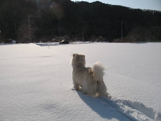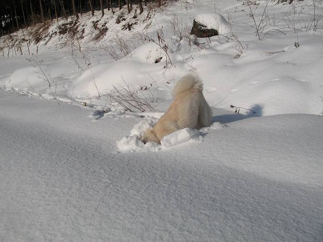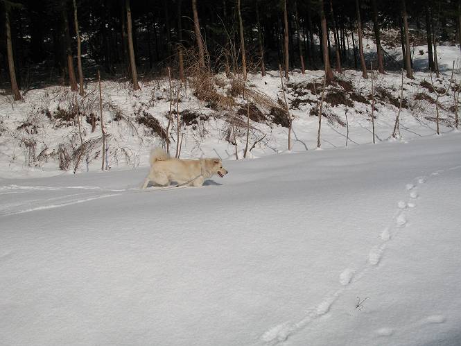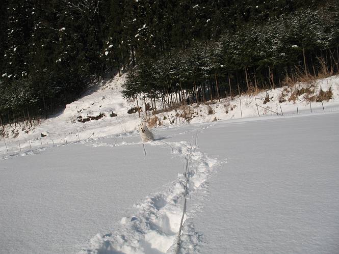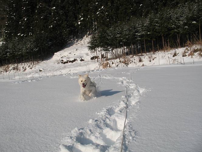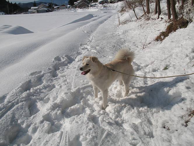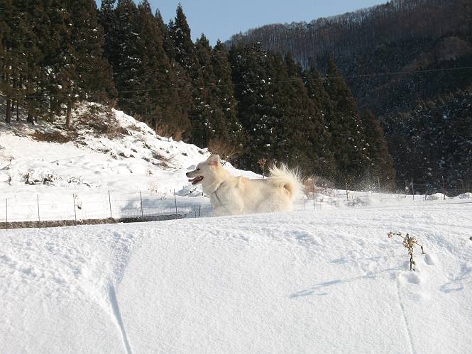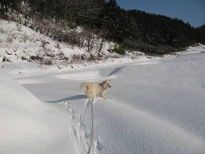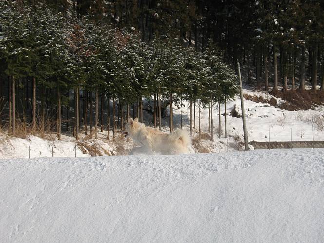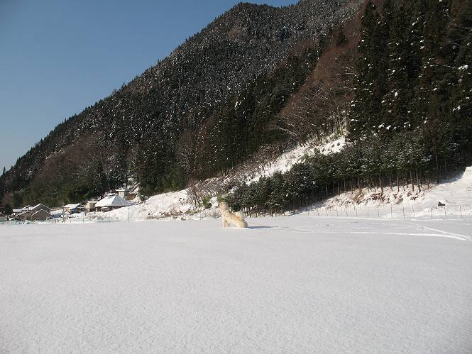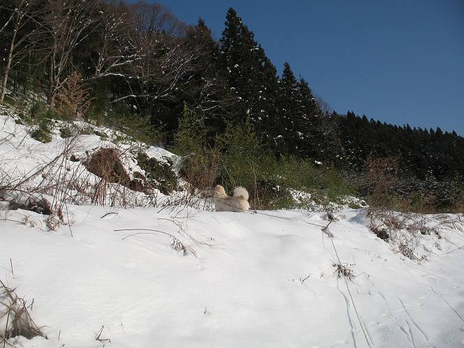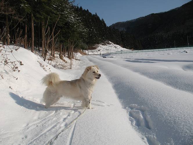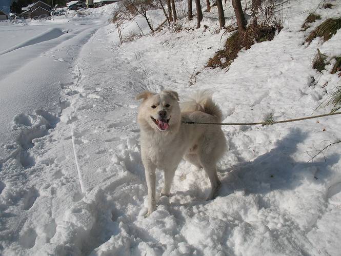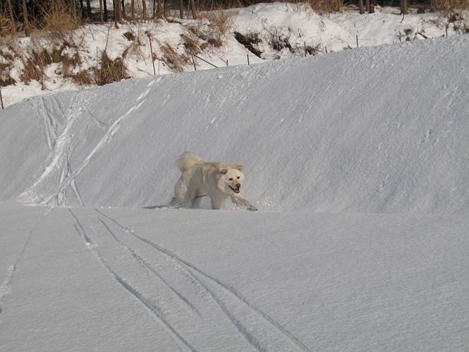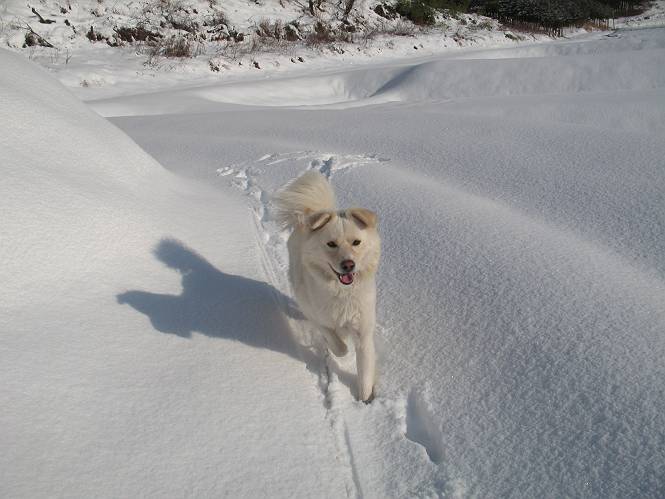 | 平成二十二年一月四日 Before 写真集目次へ Next 良いお天気に誘われて、上州武尊山の麓、川場村の山裾へ、雪遊びに行ってきました。沼田ICで降りて川場村に入ると雪が徐々に増えて、ぼくは興奮してワン、ワンと思わず吠えてしまい、「忠治、静かに!」と叱られてしまいました。 赤城山を北から見るとこんな形に見えるんですね。左が黒檜山、次は地蔵岳、右が鈴ケ岳です。 白いのが上州武尊山です、手前の山裾に向かうそうです。 最高峰の沖武尊と右が剣ケ峰です。 山裾に近づきました、パノラマ写真です。ここをクリックすると拡大します。 山裾から子持山も見えてました。 お年寄りの方が雪かきをしてました。 こんな造りのお家が沢山ありました。 早速、長いロープを引いて雪の中へ入りました、ここは山裾に造られた道のようです。 「いいねえ、先に行っちゃっていい?」、「いいよ」 真っ白だ、どっちへ行こうかな 山の斜面も面白そうだな ちょっと入ってきました、今度はこっちから入ろう。 深そうだな。 あの辺まで行ってみよう。 戻れって言われちゃった、戻ろう。 ぼく、ここにいるよ、直ぐ下りまーす。 木に引っかかってしまった やっと抜けました、今度はどっちへ行こうかな。 「ヨイショ、ヨイショ」 この辺でぼくの好きな雪もぐりをしよう。 あれっ、道に近づいてしまった 車が走ってる あそこまでぐるっと回って戻ろうかな それ、走れ! 疾走だ 土手を下って 走れっ、走れ! 「駄目だ、忠治、戻れ!」、「???」 何だ、川があるから戻るんだって。 もう少しだぞ 道に出たぞ ついでにまた檜林に上がって、雪景色を眺めよう、いいなあ銀世界。 もう帰るんですか ぼく、疲れてないんだけどな。 Before 写真集目次へ Next |