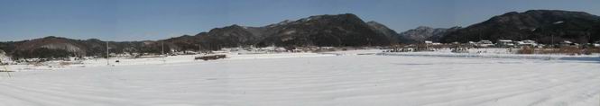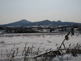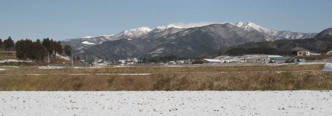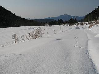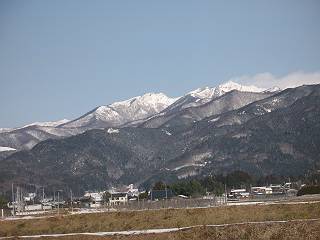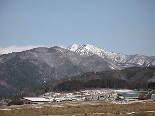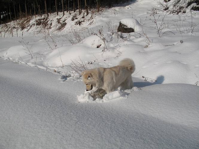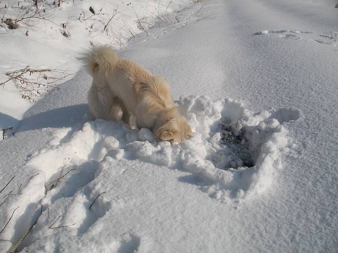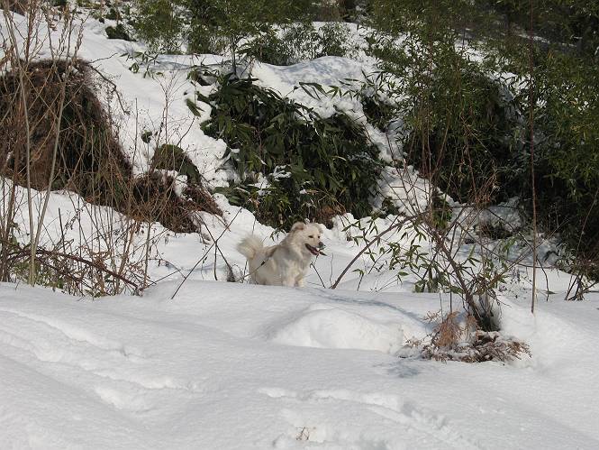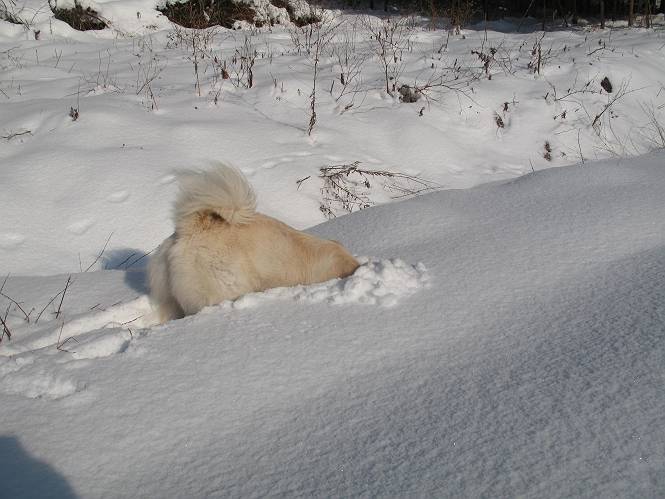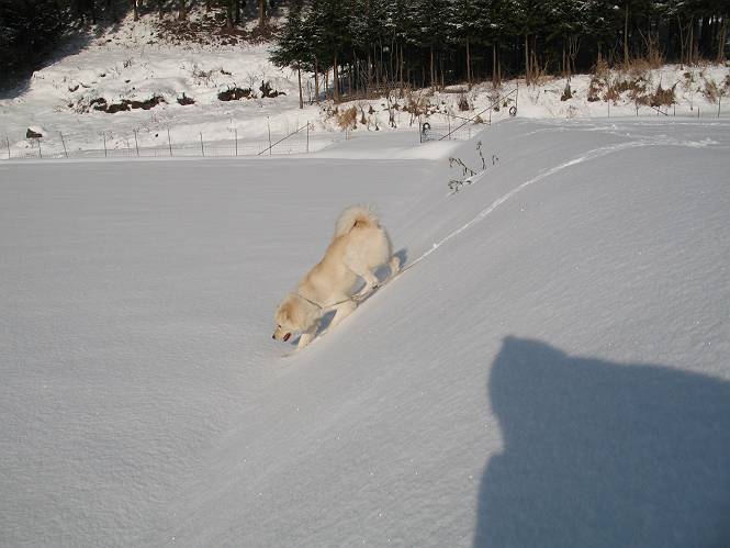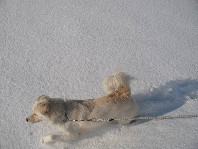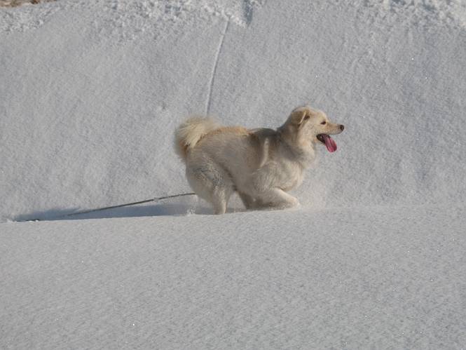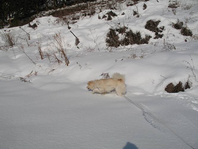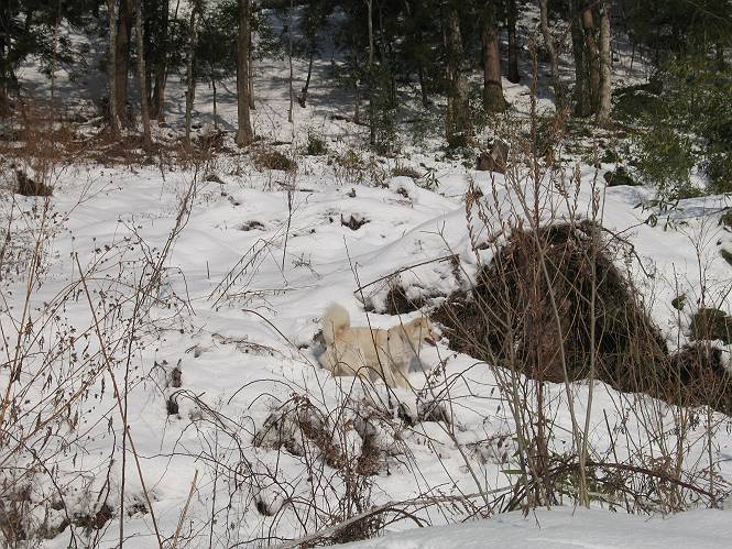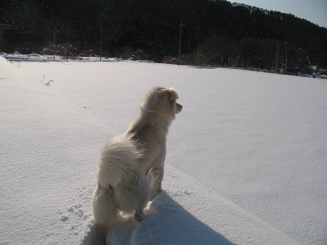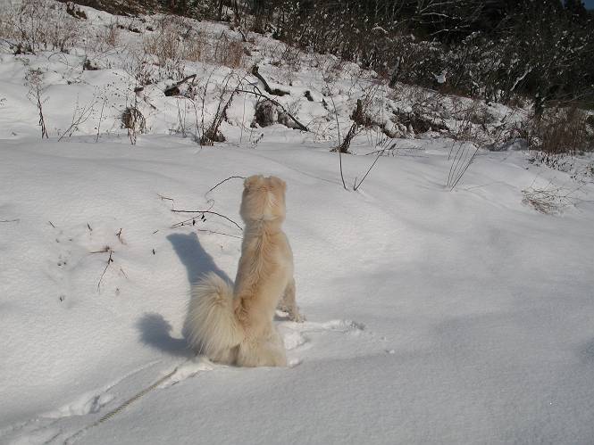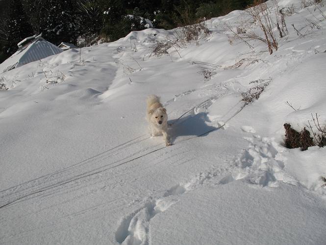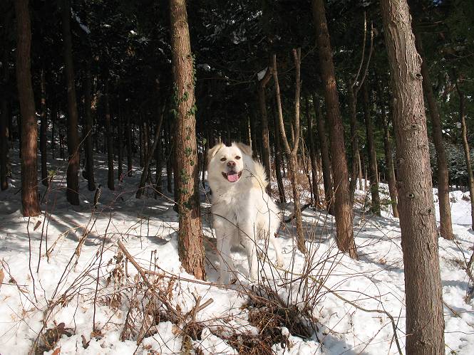 | 平成二十二年一月四日 Before 写真集目次へ Next 良いお天気に誘われて、上州武尊山の麓、川場村の山裾へ、雪遊びに行ってきました。沼田ICで降りて川場村に入ると雪が徐々に増えて、ぼくは興奮してワン、ワンと思わず吠えてしまい、「忠治、静かに!」と叱られてしまいました。 赤城山を北から見るとこんな形に見えるんですね。左が黒檜山、次は地蔵岳、右が鈴ケ岳です。 白いのが上州武尊山です、手前の山裾に向かうそうです。 最高峰の沖武尊と右が剣ケ峰です。 山裾に近づきました、パノラマ写真です。ここをクリックすると拡大します。 山裾から子持山も見えてました。 お年寄りの方が雪かきをしてました。 こんな造りのお家が沢山ありました。 早速、長いロープを引いて雪の中へ入りました、ここは山裾に造られた道のようです。 「いいねえ、先に行っちゃっていい?」、「いいよ」 真っ白だ、どっちへ行こうかな 山の斜面も面白そうだな ちょっと入ってきました、今度はこっちから入ろう。 深そうだな。 あの辺まで行ってみよう。 戻れって言われちゃった、戻ろう。 ぼく、ここにいるよ、直ぐ下りまーす。 木に引っかかってしまった やっと抜けました、今度はどっちへ行こうかな。 「ヨイショ、ヨイショ」 この辺でぼくの好きな雪もぐりをしよう。 あれっ、道に近づいてしまった 車が走ってる あそこまでぐるっと回って戻ろうかな それ、走れ! 疾走だ 土手を下って 走れっ、走れ! 「駄目だ、忠治、戻れ!」、「???」 何だ、川があるから戻るんだって。 もう少しだぞ 道に出たぞ ついでにまた檜林に上がって、雪景色を眺めよう、いいなあ銀世界。 もう帰るんですか ぼく、疲れてないんだけどな。 Before 写真集目次へ Next |