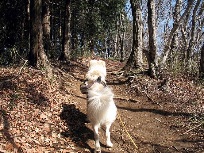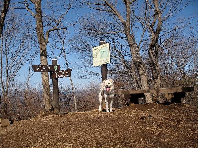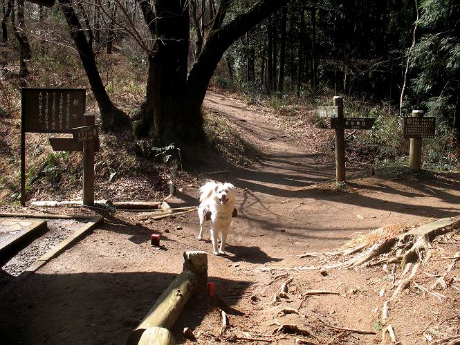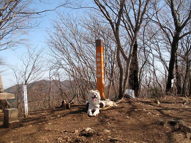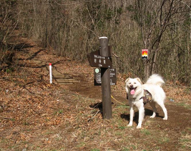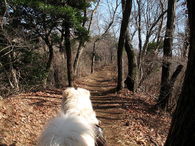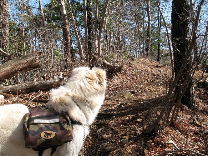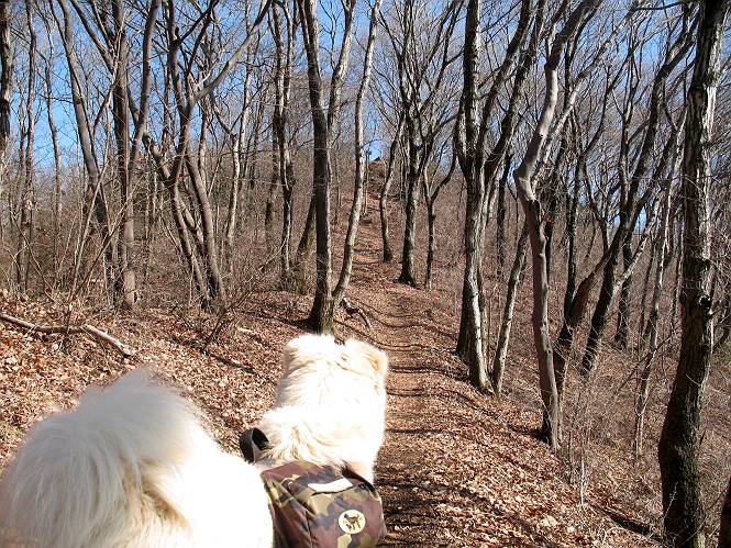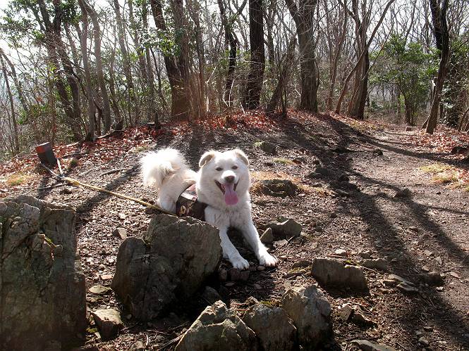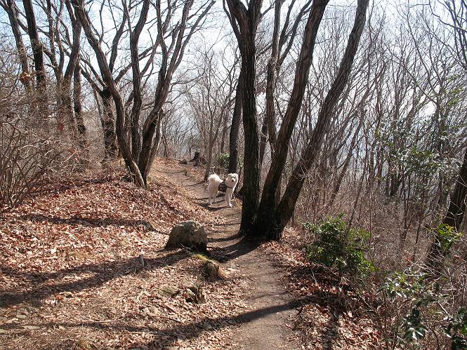 | 平成二十二年三月五日 Before 写真集目次へ Next 暖かい陽気に誘われて、栃木県の大平山系、馬不入山と晃石山に連れてってもらいました。馬不入山は二度目ですが、晃石山は初めてです。晃石山の麓にある清水(セイスイ)寺の駐車場から林道を歩いて 馬不入山の登山口にでました。ここから馬不入山山頂までは前に歩いたコースです。 出発するとすぐに桜峠へ入る道がありました。 そこからしばらく誰も通らない林道を歩き 自動車道を少し歩くと 馬不入山の登山口に出ました。 ここから丸太の階段を真っ直ぐ上って鉄塔にでます。 いきなり、すごく急ですからきついようです、ぼくは平気です。 適当に山に入って遊びながら歩きました。 お父さんが脱いでいる間、ちょっと、お休みしてます。 こんな花が咲いてました、これって、ヒヤシンスですよね。「植えたのかな?」って言ってました。 次の長い階段を上ると 馬不入山が見えました。 また、ちょっとね、オヤスミです。 少し下ると山頂が見えました、最後の上りにかかります。 馬不入(ウマイラズ)山山頂に着きました。おじさんが一人景色を眺めています。 山頂の標高は345mですって 北側に日光の山々が見えているようです。 こんな格好でもう一枚撮ってもらいました。 おじさんは、ぼく達の来た方向に下って行きました。ぼく達は大平山方向に向かいます。 緩やかな落葉樹の林が続きます。陽だまりハイクでなく、今日は暑いですよ。 ちょっとはっきりしませんが、正面が晃石山だそうです。 この辺には赤松がまだ少し残っていて、頑張ってます。 桜峠の直ぐ傍にきました。今日は、良い天気なので大勢の人に会います。アズマヤにも3人おります。 ここが桜峠で十字に道が交差してます。後ろに大きなヤマザクラがあります。 少し休憩して晃石山へ向かうそうです。ここから出発点に出る道もあるそうです。 また長い階段です、道の真ん中にガッチリした手すりがあります。ぼくは四駆ですから、・・・・。 晃石山山頂の手前の小さいピークに出ました。歩いてきた馬不入山が南に見えてます。 また、少し下って 登り返してます。 今日の二つ目の山、晃石山山頂に着きました。 早速、お水とオヤツを頂いてます。 次々とやってきます、今は三人ですね。ぼくを撫でてくれたおばさんがいたので、 抱きついちゃった、悪かったかな。 山頂からは、北側に日光の山々、南に馬不入山が見えてます 東に少し下ると晃石神社にでます。 ここから車の止めてある清水寺へ真っ直ぐ下るそうです。 露出した岩がゴツゴツして、まだ濡れてますので、“注意”ですって。 清水寺に到着です。まだちょっと早いようですが、春の山も良いですね。お天気が良すぎて、ぼくにとっては暑かったです、お水をいっぱい飲んでしまいました。 駐車場は、すぐそこです、楽しかったなあ。 Before 写真集目次へ Next |
