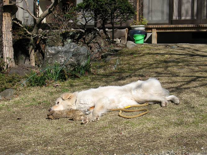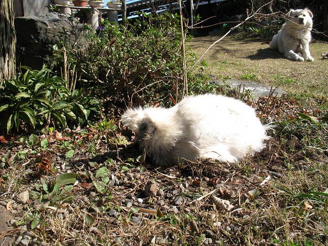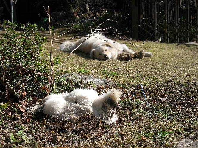 | 平成二十二年三月十四日 Before 写真集目次へ Next 昼間は暖かな陽気になりましたね。花が咲いて、お庭が賑やかになってきました。雑草ものびて、お母さんがヘラを使って抜いています。ぼくとコッチャンは傍らで遊んでます。 満開になったサンシュユです。 コッチャンは土浴びを、ぼくはぬいぐるみで遊んでいます。 コッチャンは、くちばしで土を掘り起こして、羽をバタバタさせて体の中に入れてます。 体の位置は、少しずつ回転させてるんですよ。 コッチャンは嬉しそうだなあ、ぼくは暖かくて気持良くなって 眠くなってきちゃうよ。 紅梅も満開です、キレイだなあ。 Before 写真集目次へ Next |