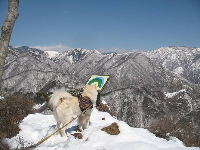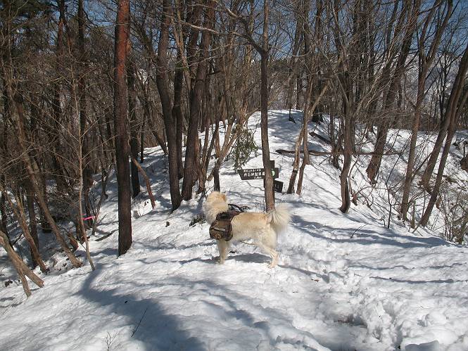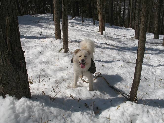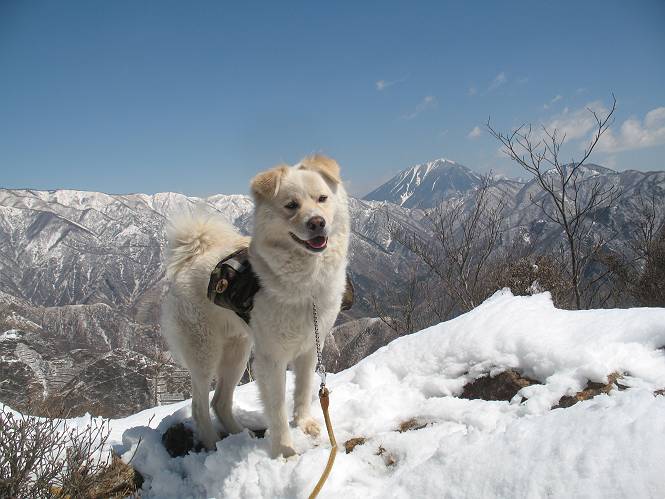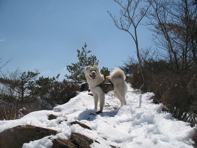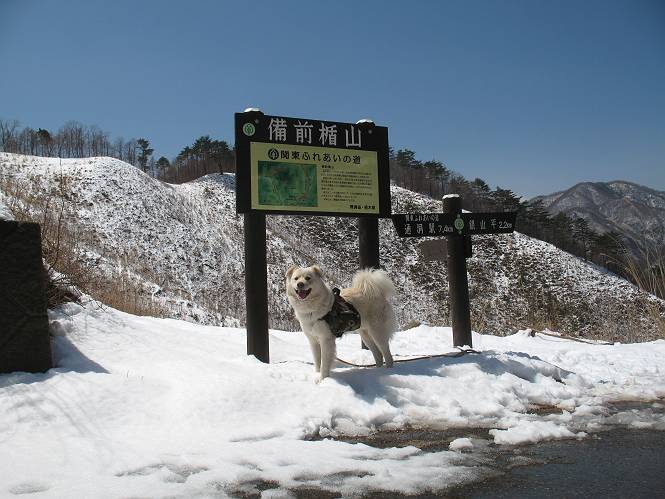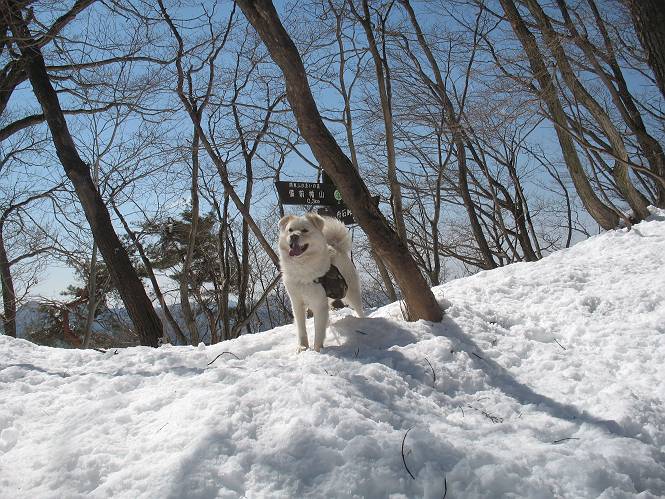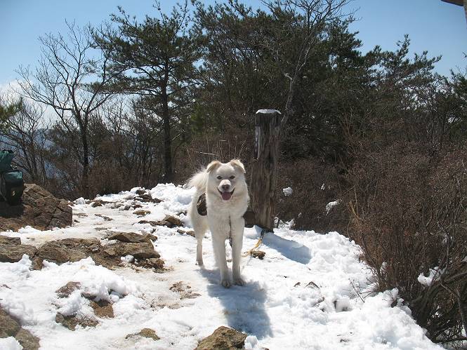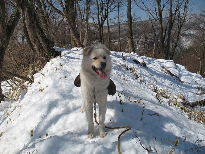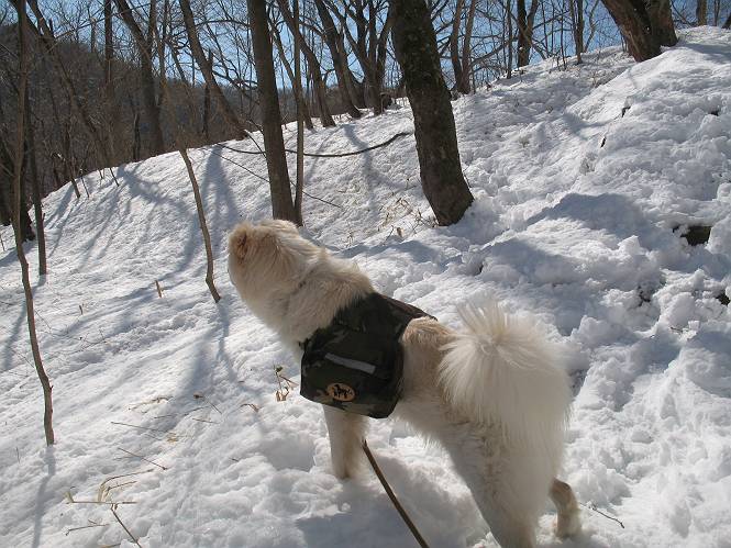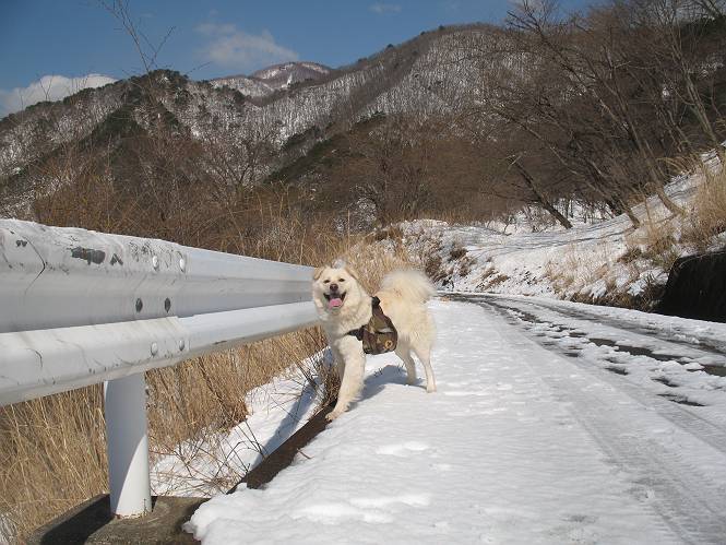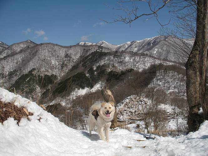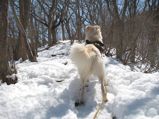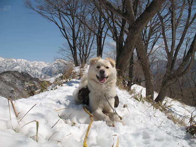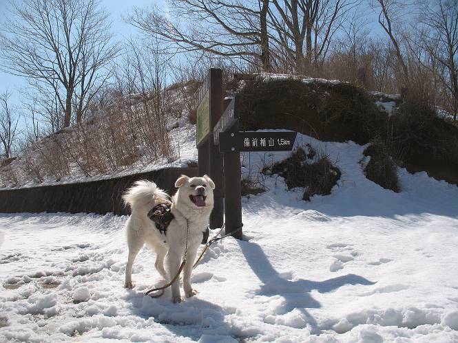 | 平成二十二年四月十八日 Before 写真集目次へ Next 16日から17日にかけて冬が戻ってきました。ぼくの家の周りは直ぐに解けてしまいましたが、散歩コースから眺められる山々は真っ白でした。今朝の散歩のあと、「今日は足尾の備前楯山に雪遊びに連れていくからな」、と言うんです。準備は昨日のうちにしてあったようです。かじか荘の奥の林道を700mほど走りますと一面の雪で、そこから舟石峠の登山口まで歩きました。 うわー、雪がいっぱいだ、真っ白だ。 雪っていいなあ、大好き。 お父さんの支度が終って出発です。 しばらく道路を歩くと、立派な鳥獣観察所がありまして、ちょっと立ち寄りました。 もう、舟石峠はすぐそこのようです。雪の上には靴跡が沢山ありました。 舟石峠、奥の右に駐車場があります。 右の尾根伝いに上って行くそうです。 ここが舟石峠で備前楯山の登山口となってます。山頂まで1.5kmだそうです。 雪は10cm〜15cmほどあります。この茂みの向こうが駐車場になっています。 駐車場の向こうに社山と男体山が見えてました。 ここにも道標があって銀山平2.4km、備前楯山1.3kmとなってました。 ちょっと登った所で足尾の山をバックに撮ってもらいました。下に道路も見えてます。 後も、前も真っ白だ、きれいだなあ。 ここは最初の小さいピークで、足尾の山々が一望できます、きれいだなあ。 あそこに見える尖ったピークが備前楯山の山頂だそうです。 一休みしてます。 ちょっと進んで、カラマツ林でまたお休みです。葉がないのでいっぱい陽がさしてます。 手前にピークがあって、その奥(左)が山頂ですが、形が大分変わって見えますね。 そろそろ進むそうです。 「あれ!、何かいるぞ」、「いいから先に進もう」 あと山頂まで700mだそうです、近いなあ。 こんな格好で備前楯山を入れて撮られてしまいました。 ここは雪が沢山あります。 山頂まあであと300mだそうです。 このちょっと先ってわけだ。 備前楯山山頂に着きました。 山頂には8人のグループがいまして、ぼくを沢山撫でてくれました、うれしかったです。 山頂の北側には日光の社山、男体山、半月山が見えてました。 北側、日光の山々です。 西側、足尾の山々です。 西の端に案内板がありました。 下が足尾の街ですって。 きれいだなあ、山だらけだ。ぼくは半月山は登ったけど、あとは登ってないなあ。 足尾の山をバックに撮ってもらいました。 今度は男体山をバックに。 オヤツだって、お腹がすいたなあ。 良い景色を見て、腹ごしらえもしましたので、来た道を下るそうです。 時々、道から外れて山の中を歩き、 斜面に這い上がったりして、遊びながら下りました。 帰りは男体山がクッキリ見えてきたようです。下は駐車場です。 登山口に戻りました。雪がとけて水溜りがアチコチに出来ています。道路も真ん中はほとんど とけてしまったようです。 帰り道、道路から備前楯山が見えました。思いがけない雪の備前楯山、楽しかったなあ。 Before 写真集目次へ Next |