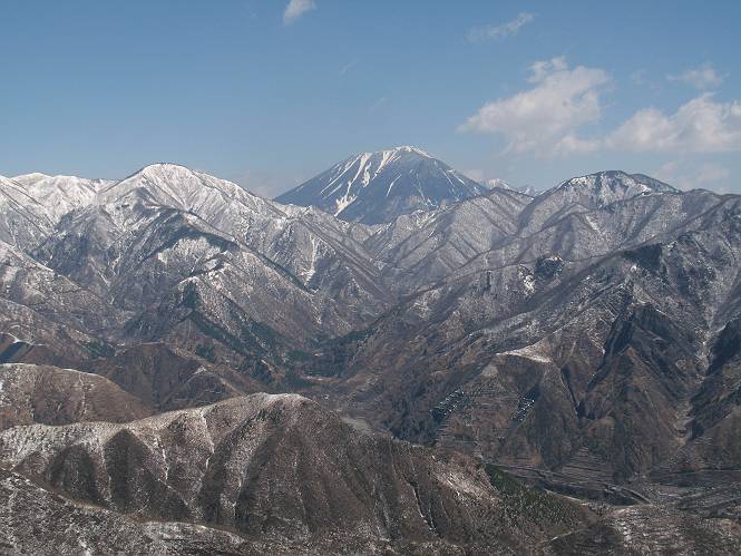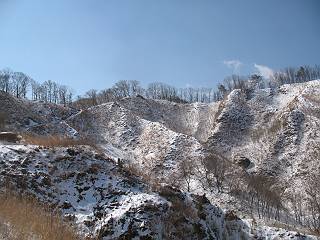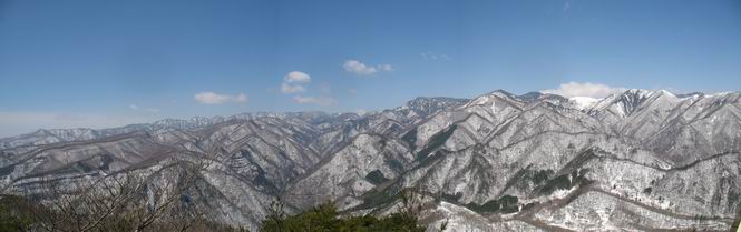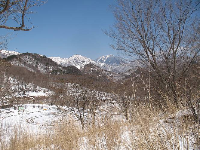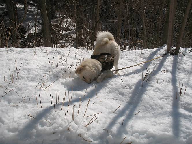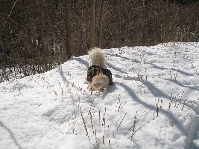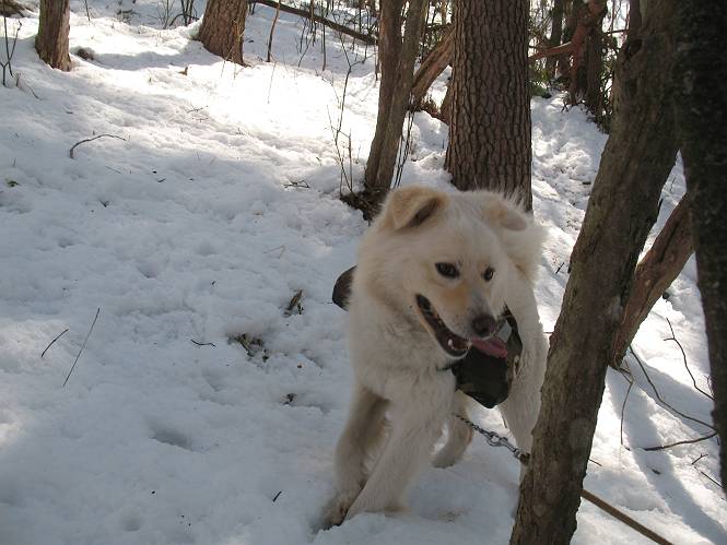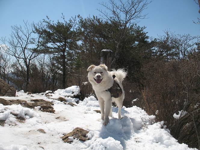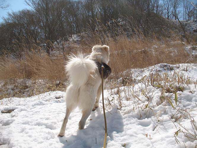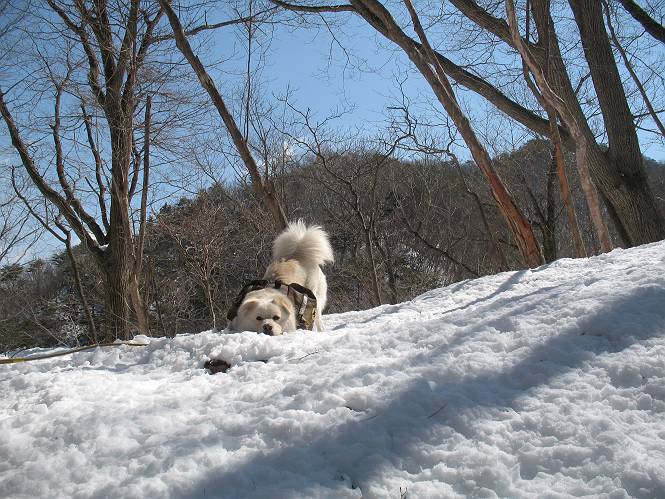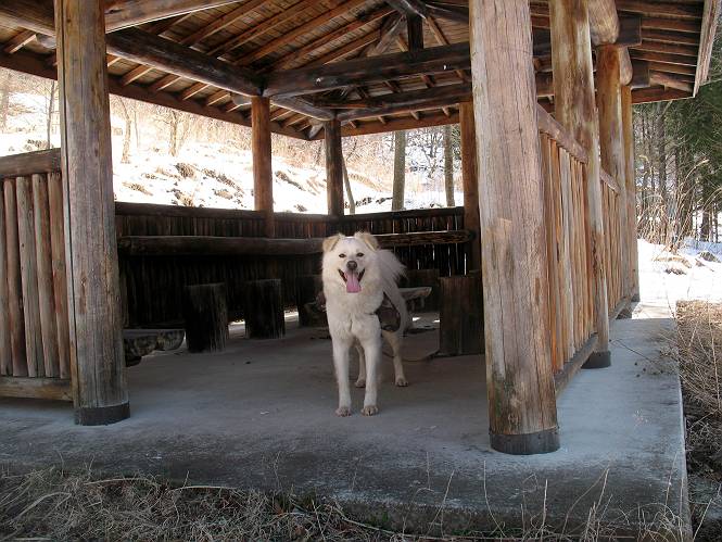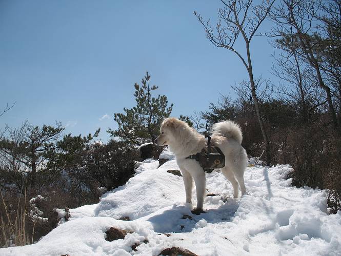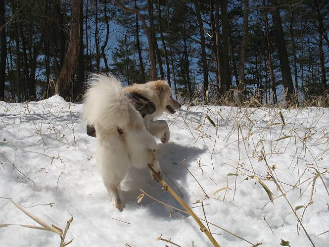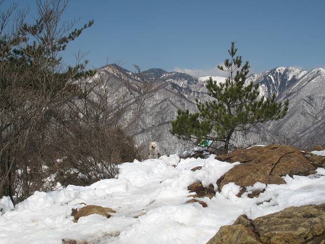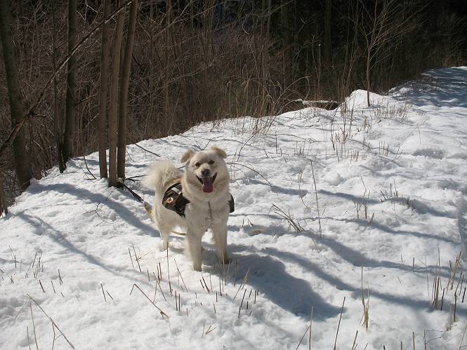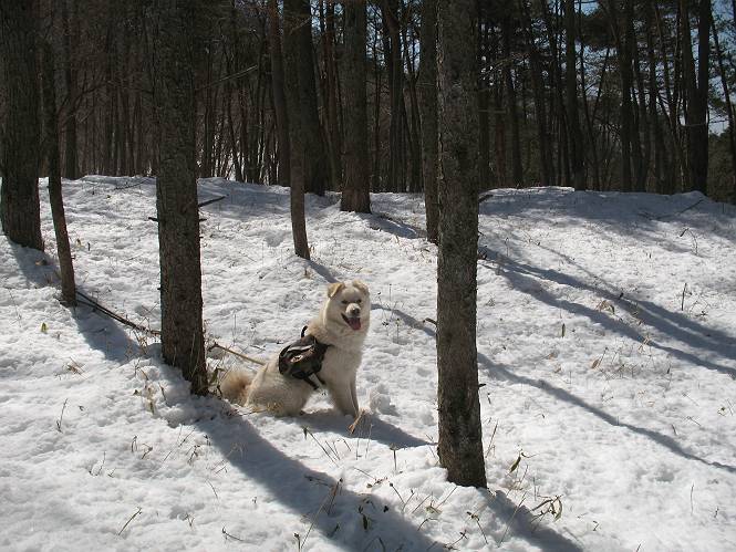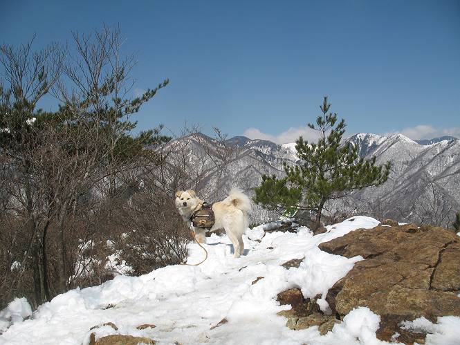 | 平成二十二年四月十八日 Before 写真集目次へ Next 16日から17日にかけて冬が戻ってきました。ぼくの家の周りは直ぐに解けてしまいましたが、散歩コースから眺められる山々は真っ白でした。今朝の散歩のあと、「今日は足尾の備前楯山に雪遊びに連れていくからな」、と言うんです。準備は昨日のうちにしてあったようです。かじか荘の奥の林道を700mほど走りますと一面の雪で、そこから舟石峠の登山口まで歩きました。 うわー、雪がいっぱいだ、真っ白だ。 雪っていいなあ、大好き。 お父さんの支度が終って出発です。 しばらく道路を歩くと、立派な鳥獣観察所がありまして、ちょっと立ち寄りました。 もう、舟石峠はすぐそこのようです。雪の上には靴跡が沢山ありました。 舟石峠、奥の右に駐車場があります。 右の尾根伝いに上って行くそうです。 ここが舟石峠で備前楯山の登山口となってます。山頂まで1.5kmだそうです。 雪は10cm〜15cmほどあります。この茂みの向こうが駐車場になっています。 駐車場の向こうに社山と男体山が見えてました。 ここにも道標があって銀山平2.4km、備前楯山1.3kmとなってました。 ちょっと登った所で足尾の山をバックに撮ってもらいました。下に道路も見えてます。 後も、前も真っ白だ、きれいだなあ。 ここは最初の小さいピークで、足尾の山々が一望できます、きれいだなあ。 あそこに見える尖ったピークが備前楯山の山頂だそうです。 一休みしてます。 ちょっと進んで、カラマツ林でまたお休みです。葉がないのでいっぱい陽がさしてます。 手前にピークがあって、その奥(左)が山頂ですが、形が大分変わって見えますね。 そろそろ進むそうです。 「あれ!、何かいるぞ」、「いいから先に進もう」 あと山頂まで700mだそうです、近いなあ。 こんな格好で備前楯山を入れて撮られてしまいました。 ここは雪が沢山あります。 山頂まあであと300mだそうです。 このちょっと先ってわけだ。 備前楯山山頂に着きました。 山頂には8人のグループがいまして、ぼくを沢山撫でてくれました、うれしかったです。 山頂の北側には日光の社山、男体山、半月山が見えてました。 北側、日光の山々です。 西側、足尾の山々です。 西の端に案内板がありました。 下が足尾の街ですって。 きれいだなあ、山だらけだ。ぼくは半月山は登ったけど、あとは登ってないなあ。 足尾の山をバックに撮ってもらいました。 今度は男体山をバックに。 オヤツだって、お腹がすいたなあ。 良い景色を見て、腹ごしらえもしましたので、来た道を下るそうです。 時々、道から外れて山の中を歩き、 斜面に這い上がったりして、遊びながら下りました。 帰りは男体山がクッキリ見えてきたようです。下は駐車場です。 登山口に戻りました。雪がとけて水溜りがアチコチに出来ています。道路も真ん中はほとんど とけてしまったようです。 帰り道、道路から備前楯山が見えました。思いがけない雪の備前楯山、楽しかったなあ。 Before 写真集目次へ Next |