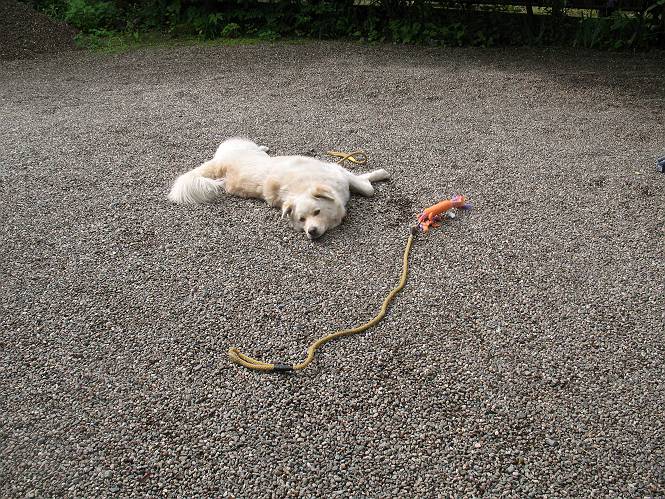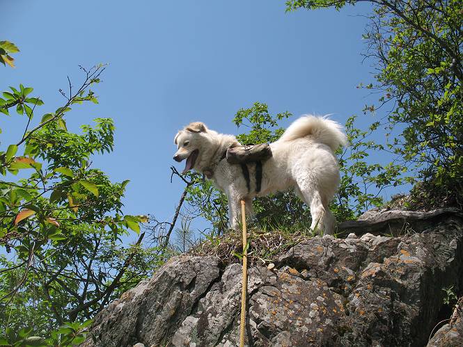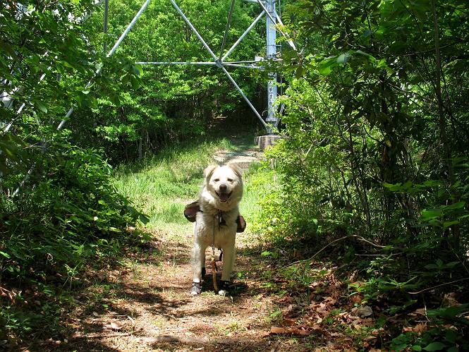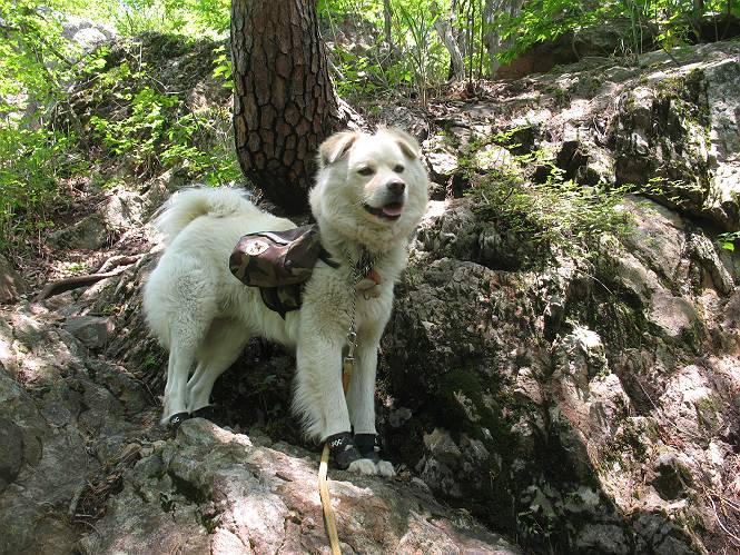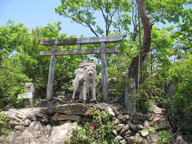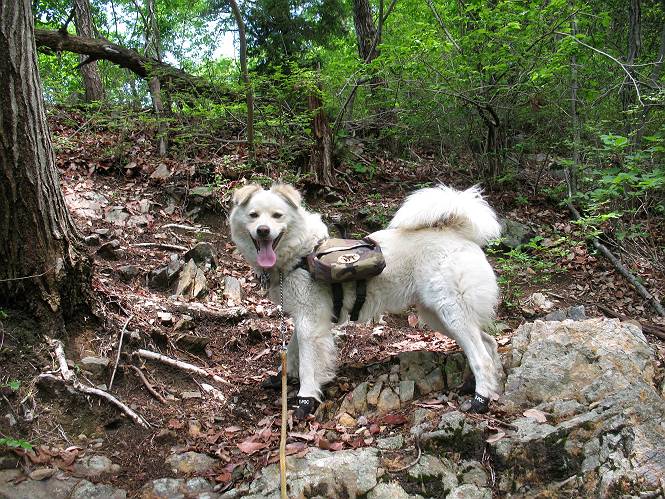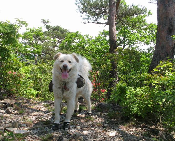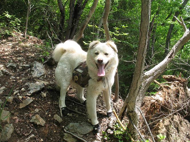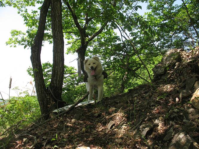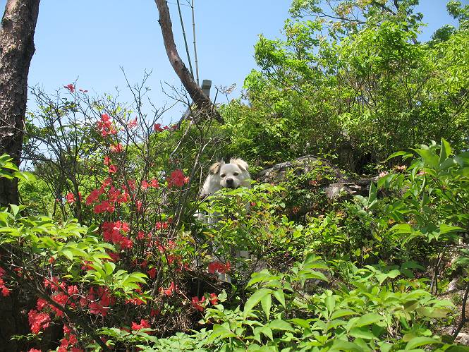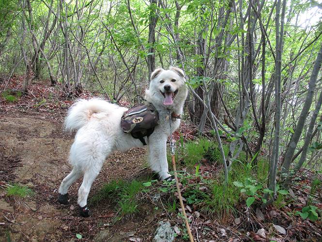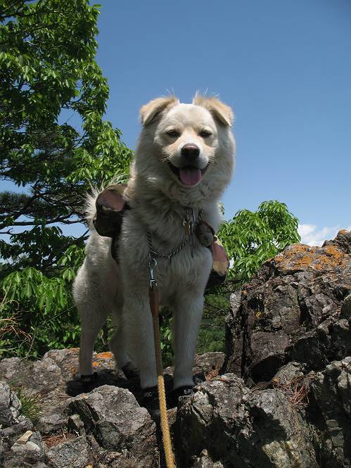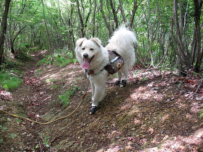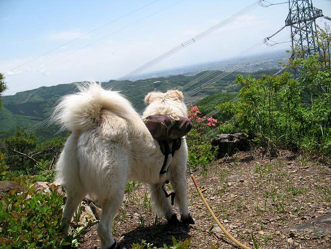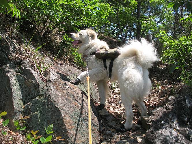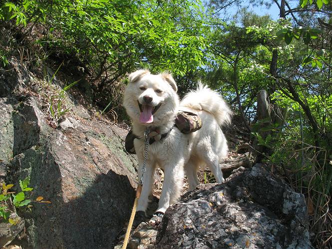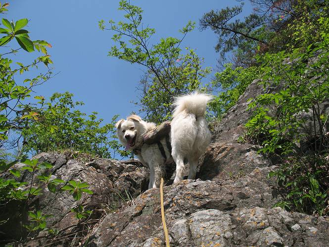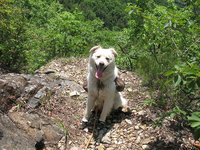 | 平成二十二年五月十二日 Before 写真集目次へ Next 3日間、お父さんとお母さんは昼間留守で、ぼくはひとりでお留守番でした。今日もかな、と思って庭で遊んでいると、お父さんがぼくのザックと靴を車に積みはじめました、「あっ、山だ」、早速支度をしてでかけました。今日は靴の試し履きに足利の湯殿山をぐるっと廻ってくるそうです。 すっかり緑になった林の中をを歩いてます、気持良いですね。昨日の雨で道は濡れています。 粘土質の道は、力が入ると、どうしても滑ってよろけてしまいます。 露岩の道にでました、この程度なら良いのですが、蹴り上がりが続くと後足の靴がずれたり脱げたりします。平地の散歩でも傾向はありましたが、少し問題のようです。お父さんは時々止まってぼくの靴を見てました。 「ちゃんと履いてますよ」 峰不動に出ました、岩の上から街並みがきれいでした。 峰不動です。 「木陰が涼しくて気持良いですよ」 岩がすっかり乾きましたので、滑らなくなりました、快調でーす。 ハッ、ハッ、ハッ、息づかいが荒くなります。 また見晴らしの良い所にでました。 お休みしてます、靴、脱げてませんよ。。 もう少しで湯殿山の山頂です。 さあ、頑張るぞ、ヨイショ。 湯殿山の山頂に着きました、誰もいませんね。 ちょっと失敬して上らせてもらいました。 登山道にも咲いてましたが、まだヤマツツジがきれいですね。 こんな格好でどうでしょう、緑と赤と青い空、きれいですね。 東に回り込んで、岩場に出ました。ぼくのお気に入りの場所です、下に足利の街が大きく広がってます。 首にいっぱいついているでしょう。首輪に、予防注射済札と鎌倉のコナちゃん家でもらったぼくの名前と電話番号の入ったメタルでしょう、ずーとつけてる犬のマスコットでしょう、あとチョークチェーンをつけてます。リュックも背負っているもんね。片方お水を飲んでしまったので、重い方が下がっちゃうんだよね。 見渡す山並は夏の装いですね。ここにもヤマツツジが残ってますね。 前足の靴もズレちゃってます。 大きな高圧線の鉄塔まで下りて来ました。あとは人工林の中を下ると登山口に戻ります。靴の試し履きは50〜60点かな、って言ってました。いろいろ工夫しないと、高い山に行けないもんね。 Before 写真集目次へ Next |