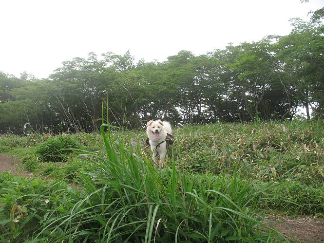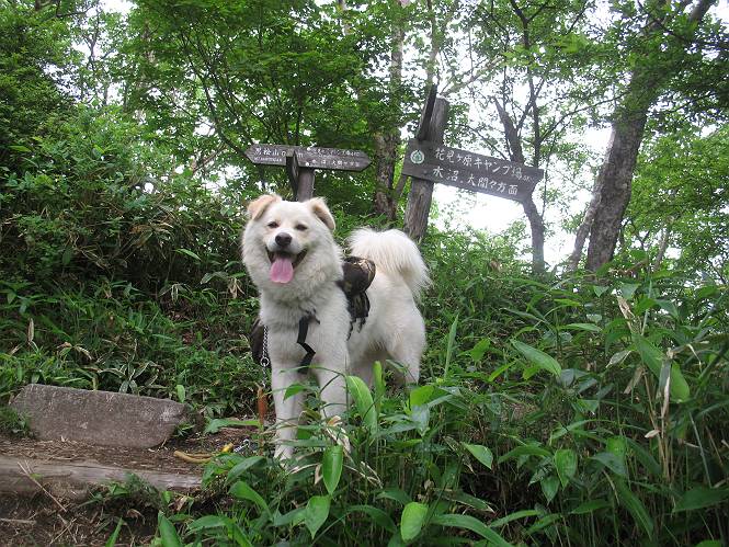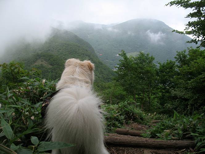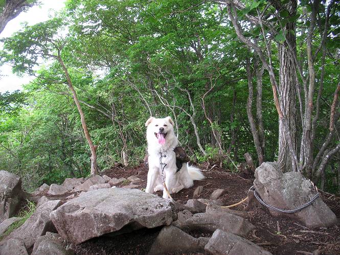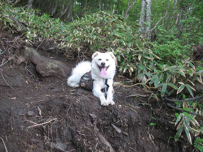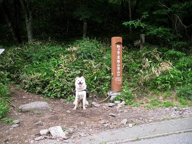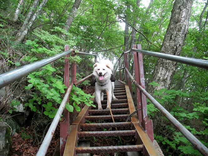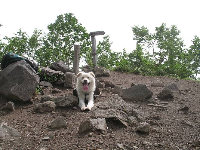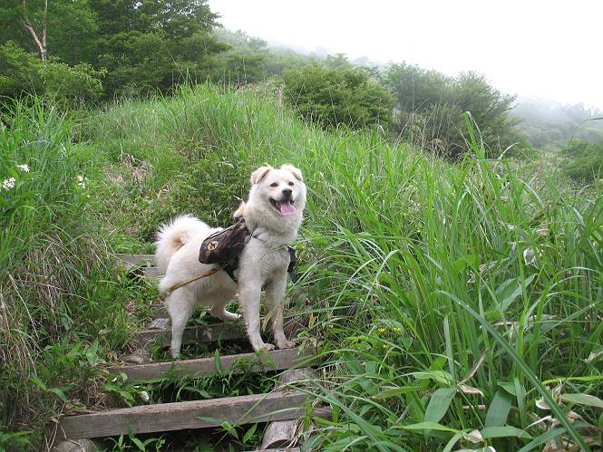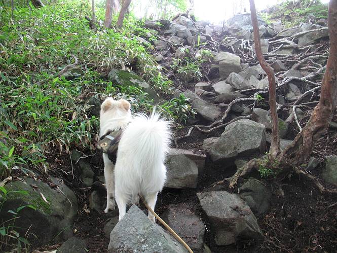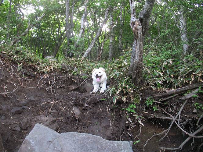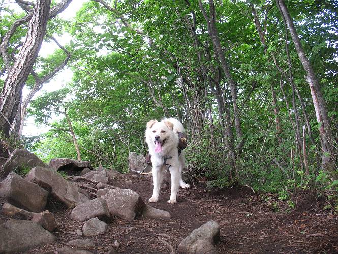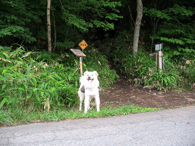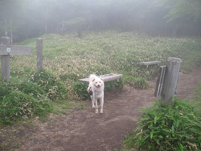 | 平成二十二年七月五日 Before 写真集目次へ Next 高いお山に連れてってもらうのを待ってましたが、ずっと天気がはっきりしません。お父さんの靴の修理が終ったこともあり、今日は、赤城山へ連れてってもらいました。朝の散歩をぬいて、赤城山大洞に向かいました。もうシーズンオフで登山者も少ないようですから、黒檜山と駒ケ岳を一回りするそうです。ぼくは、黒檜山は花見ケ原から、駒ケ岳は大洞から往復してます、今日は2度目となります。 黒檜山の登山口です、雨が降り出しそうな空模様なので、山の中は薄暗い感じがします。 ぬかった急坂を上って猫岩に出ました、大沼に地蔵岳が写ってました。 大沼をバックに撮ってもらいました。 真下に赤城神社が見えてます、きれいだなあ。 その向こうにお店があって・・・・・、その後の山が小地蔵岳ですって。 ここから尾根を少し歩いて、また大きな岩のゴロゴロした急坂です ハー、ハー、荒い呼吸が続きます、時々うさぎ跳びをして跳ね上がります。 また尾根に出て大沼を眺めました。 小地蔵岳には雲がかかり、枝間からモクモクした入道雲が見えました。 ここでまた小休止しをしました。 そろそろ出発だそうです。 大きな岩でしょう、この間を抜けていきます。 きつい坂道がずっと続いてます。 一段高い所に上がり、またひとやすみしてます。もう山頂は近いようです。 花見ケ原、駒ケ岳から来る道に合流しました。この奥が山頂のようです。 黒檜山山頂に着きました。周りは曇っていて見えません。 2年ぶりの山頂で休憩中です。あの時は沢山人がいましたが、今日は誰もいません。 黒檜山山頂は曇ってます 一番近い黒檜山大神のピークが見えるだけです。 先ほどの合流点に戻りました、すぐ先が黒檜山大神です。 黒檜山大神で記念写真を撮ってもらいました。 花見ケ原の分岐点に来ました。ここから駒ケ岳山頂までが、ぼくの初めて歩くコースです。 木段が連続します。「忠治、木段歩きが上手くなったなあ」、とお父さんが言ってました。 また、下の方が見えてきました。 駒ケ岳も見えてきました。 ニガナ クサタチバナが咲いてました。 真っ白なクサタチバナ、きれいですね。 この花はニシキウツギというそうです。色が変化するようです。 草原の中を下って大タルミに出ます。ぼくの前にニガナ、後にクサタチバナが咲いてます。 ここが大タルミです。クサタチバナが点々と咲いてました。 小さいピークを越えて、木段を沢山上って駒ケ岳山頂に到着です、早速お水を飲んでます。 「ああ、お水がおいしかった」、また景色が霧で見えなくなってしまいました。 駒ケ岳山頂 南の小さいピークです。 南のピークから人声が聞こえてきます。到着を待って出発します。 先ほど見えたピークにやってきました。 ここから大洞への下りです。霧が一段と濃くなってきました。 鉄階段、木段と続きます。 またお父さんに「下るのがうまくなった」、って言われちゃった。ぼく、はじめは怖かったんですよ。 大洞の駒ケ岳・黒檜山登山口到着です。 大沼湖畔で遊んで 啄木鳥橋を渡って 赤城神社に参拝してきました。この先の駐車場で一周となります。 帰りに小沼に寄ってまた水辺で・・・・・・ 駐車場の斜面を走り回って・・・・・・、楽しかったなあ、でも疲れた。 Before 写真集目次へ Next |