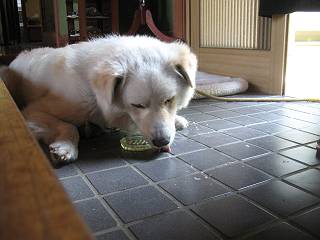 ぼくの鼻息で削り節が飛んでしまいました。もったいないから舐めてます。