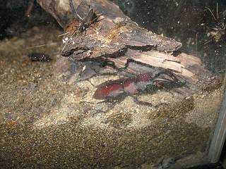 これがスズムシのお家です、3匹見えますね。もう、リリリーン、リリリーン、と鳴いているんですよ。手前に見えるノコギリクワガタは夕べ飛び込んできたそうです。