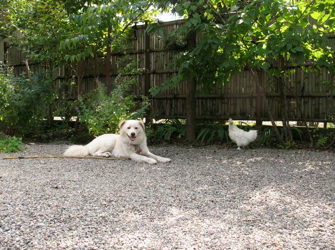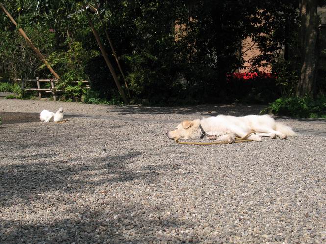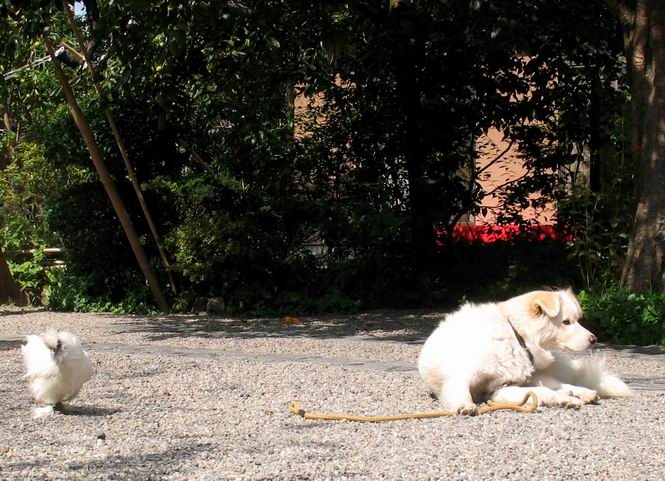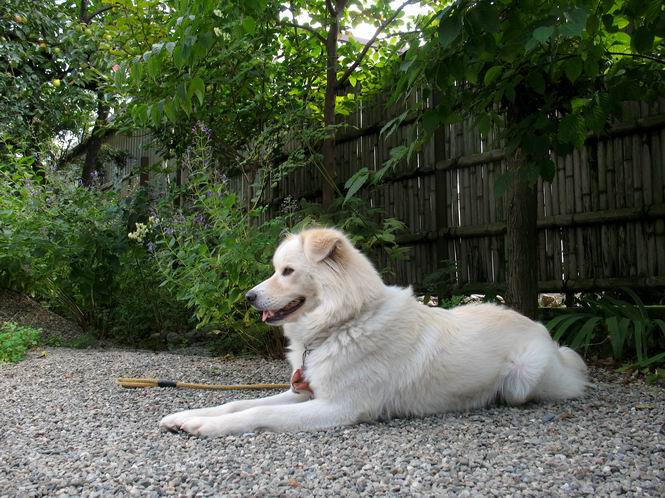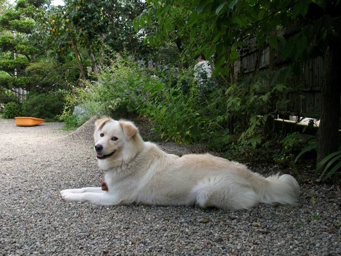 | 平成二十二年十月二日 Before 写真集目次へ Next この間足利の仙人ケ岳へ連れてってもらって、その時は気づかなかったのですが、ぼくがあまりかくものですから、一昨日、「忠治、ダニを見てやる」、となりました。なんと、目と耳の周り、前足の指の間、後ろ足の内腿、お腹、と全部で二十数匹、2mmほどの小さいダニがついていました。そして今朝、お腹に5mmほどあるのが1匹、目の縁に2匹、「まだいるぞ」って言うんですよ。 大分過ごしやすい陽気になりました。ここ数日食欲がでまして2割増しにしてもらいました。でも、もっと食べたいんです。こうしてひなたぼっこしているといい気持になって眠気がさしてきます。コッちゃんも小砂利の上で遊んでいます。 でも、暑くなっちゃったよ、木陰に行こう。 あれっ、コッちゃんもついて来る。 日向もちょっといいけれど、長くいると暑くなってしまいますね。コッちゃんも同じかな。 「後に誰か?」、そう、お母さんがお庭の掃除をしています。落ち葉をはいたり、雑草を取ったり、ぼくの走り回った跡をならしたり、しているんですよ。 あれあれ、コッちゃんがまた日向へ行っちゃった。ぼくとコッちゃん、どちらが暑がりなのかな? Before 写真集目次へ Next |