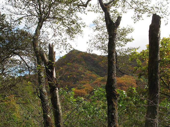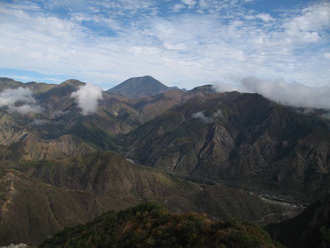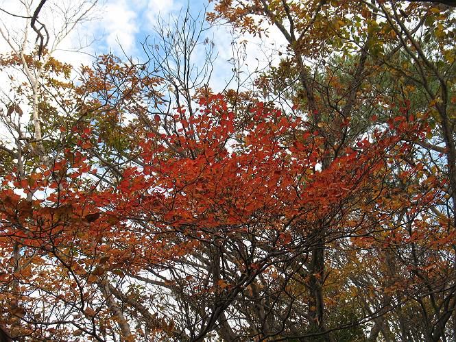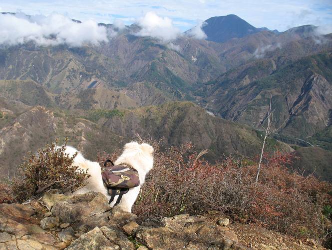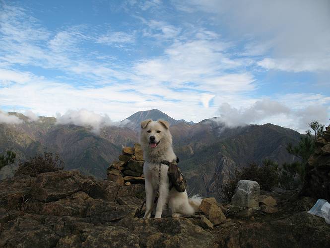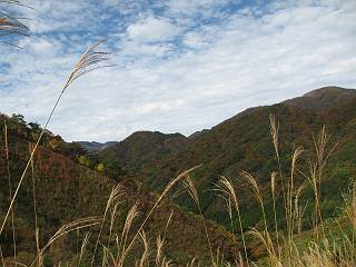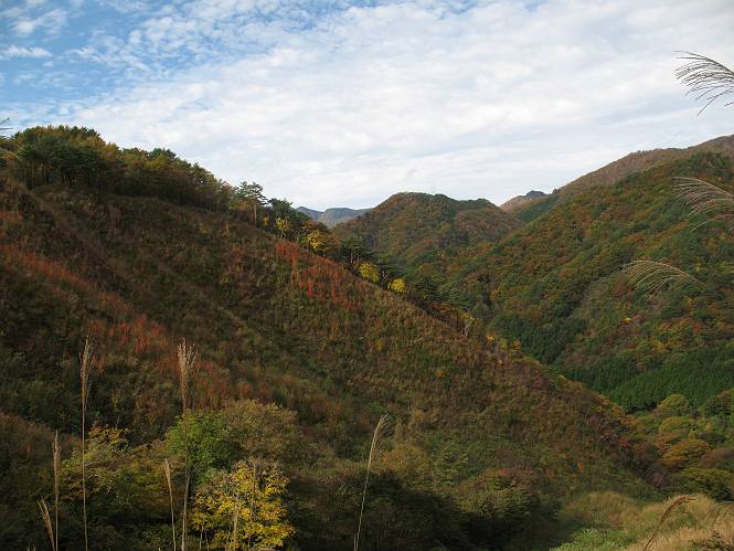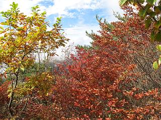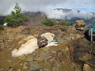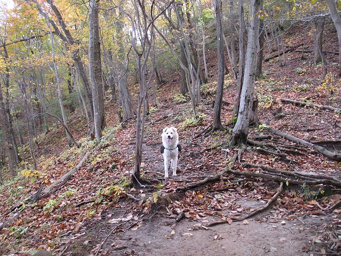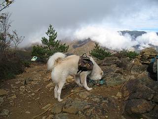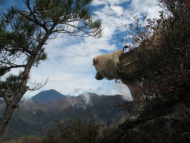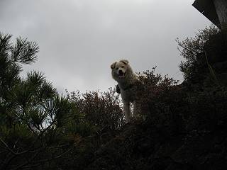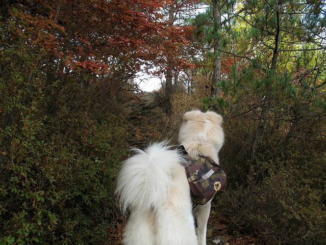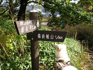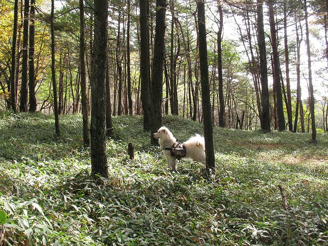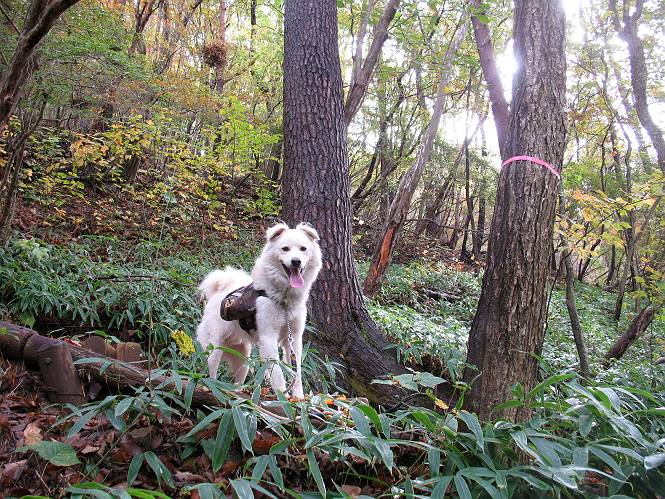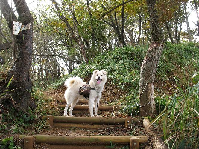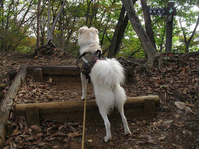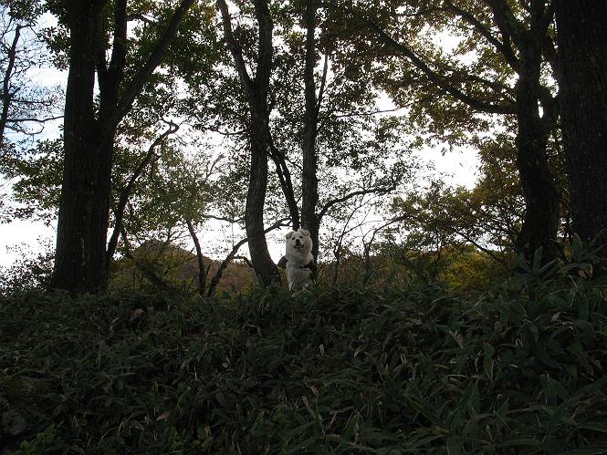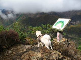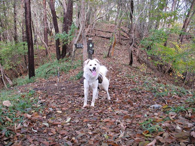 | 平成二十二年十月二十九日 Before 写真集目次へ Next 足尾の備前楯山へ紅葉を見に連れてってもらいました。出発した時は曇ってましたが、途中から晴れてきれいな紅葉が見られました。遠くの山並は雲が多く、男体山がやっとでした。 舟石峠の駐車場から男体山です。 舟石峠のちょっと先から山頂まで1.4kmです。 木段を上ると紅葉した近くの山並がきれいに見えました。 近くの山並の紅葉です、高いところは終わってしまったようです黄葉が素晴らしいようです。 小さい尾根を越えると、備前楯山が姿を現しました。 カラマツ林を抜けるとちょっと急坂になります。 尾根道を進むと、山頂まで0.7kmの道標の所で左に道が曲ります。 山頂まであと700mの所です、登山道には落ち葉が沢山積もってます。 この辺は葉が黄色くなってます。 山頂まであと0.3kmですって。 真っ赤なツツジの紅葉が点々と森の中に出てきます。 この先を左に曲れば山頂です。 備前楯山山頂に着きました。 北側から日光の男体山が見えます。 さっそくお水とオヤツを頂きました。 山頂周辺の紅葉です。 男体山は曇っているようです、社山と半月山には雲がかかってます。 この下は崖かな? お父さんは下りて行きました。 ここは降りられそうです、でも危ないかな。あっ、半月山が見えました。 男体山を入れて1枚撮ってもらい、下りにかかりました。 途中の透き通るような黄葉です。 もう半分位下りましたね。 カラマツ林に入りました、笹の緑がきれいですね。 後に備前楯山の山頂部が見えてます。 舟石峠のちょっと上からの山並です。 舟石峠の駐車場に戻りました。山頂でゆっくりしてましたので、あとから登った人と降りたら一緒でした、ワン。「紅葉は、まだ、5、6日早いかな」って、言ってました。 面白いことがありましたので、付け加えておきます。帰りに舟石林道をかじか荘方向に車で下ってきましたら、道路脇が土手状になっている場所で猿の群れに遇いました。10頭ほどいまして、土手に整列してました。お父さんが猿のところで車をとめて、「猿だ!」、と教えてくれましたが、兎に角はじめて変な格好をした動物に遇い、興奮してしまい「ワン、ワン・・・」連発してしまいました。間もなく、山の中へ逃げてしまいましたが、ぼくと1mぐらいの距離、今度会ったらお友達になれるかな。「忠治、やめとけ、襲われるぞ」、って言うんですよ。 Before 写真集目次へ Next |