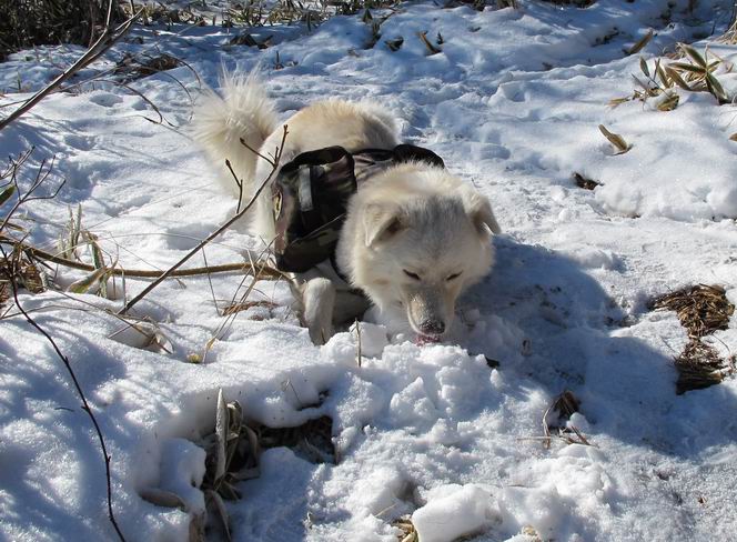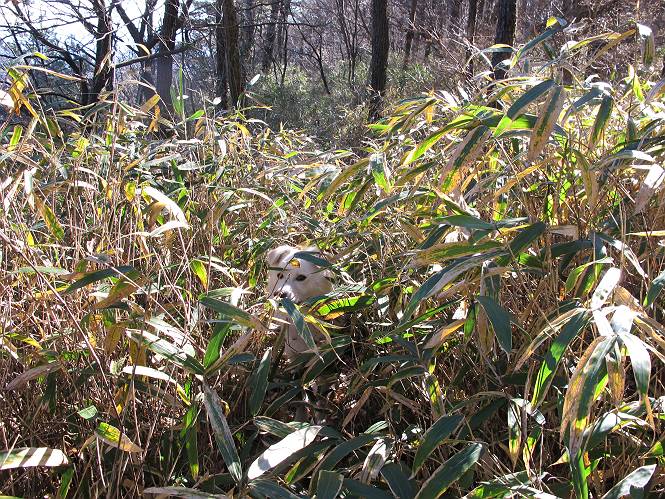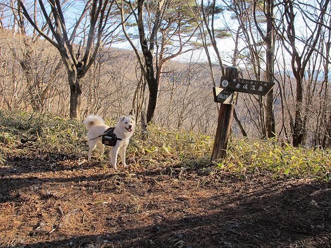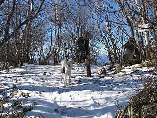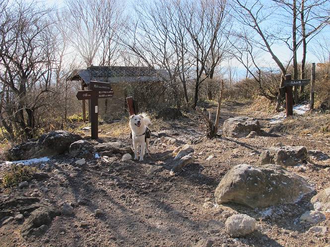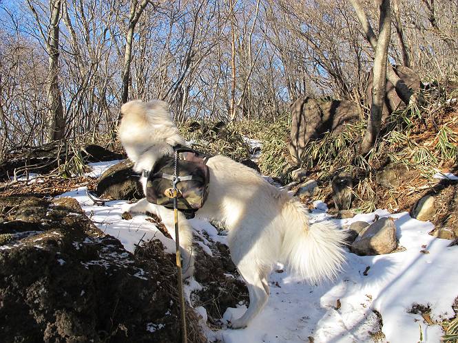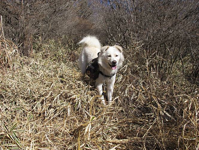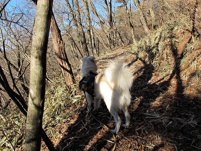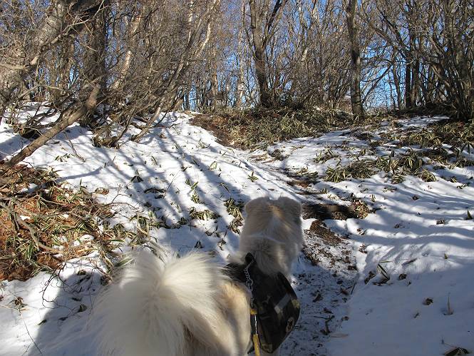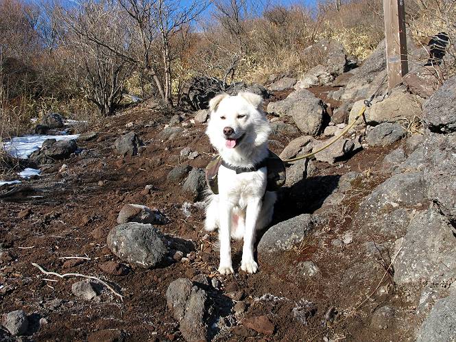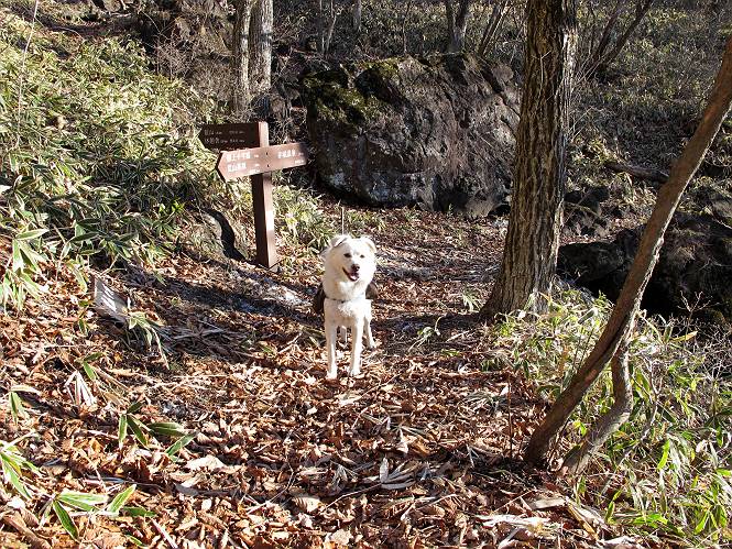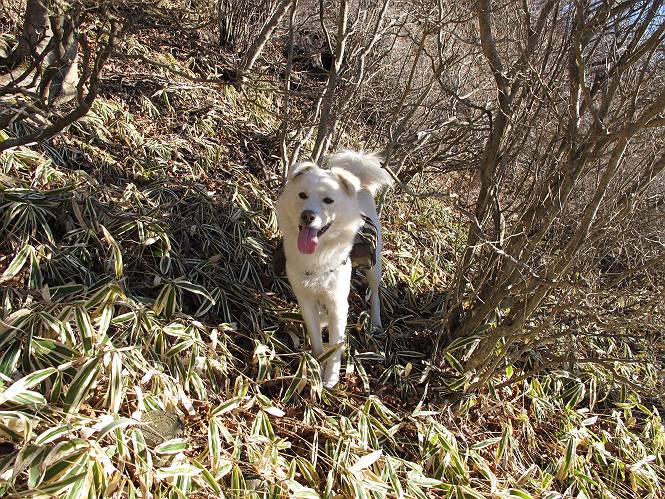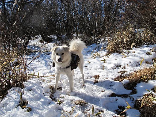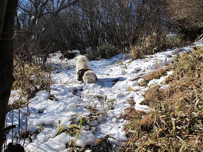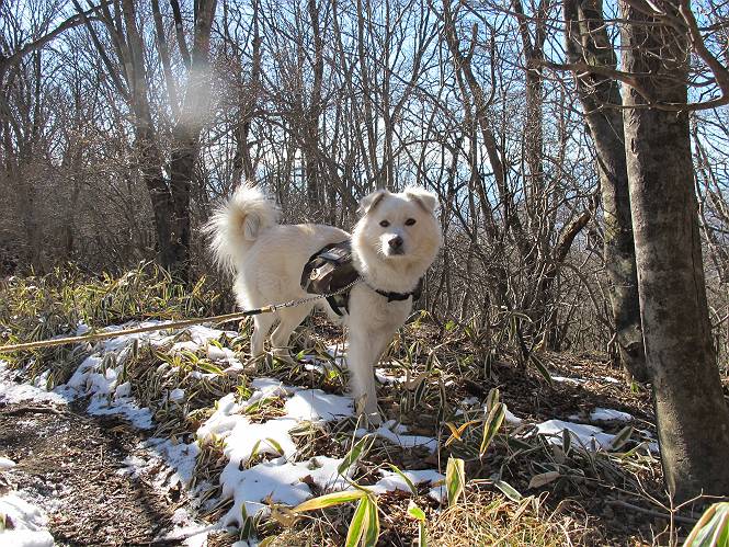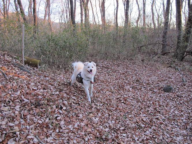| 平成二十二年十二月十七日 Before 写真集目次へ Next 荒山に雪の降るのを楽しみに待っていましたが、10日はお父さんは独りで大菩薩山へ行ってしまいました。やっと、昨日になって「もう日がないなあ、山頂には雪が少しぐらい残っているだろう、明日行くか」、ということで1年ぶりに三夜沢の赤城神社から荒山を往復してきました。 赤城神社の東側の櫃石へ行く登山道を歩き始めると直ぐに陽が昇りました。 道には落葉が沢山積もって、凸凹がわかりませんでした。 櫃石への分岐点です。左が櫃石、右は緩やかに荒山に通じる尾根へと入ります。 分岐点から急坂に入りました、森の中は朝日に染まってます。 櫃石に着きました、広々として気持ちの良い松林です。 フェンスで囲ってあります。左を回って尾根に入ります。 ここが三角点です、ここから先ほどの道に出合うまで藪漕ぎです。 踏み跡の薄い尾根を進んで行きますと、赤城温泉から来る道と出合います。赤城温泉1.5km、小沼7.5kmだそうです。ここからは道は整備されてます。 雑木と赤松の混生林のようです。 冬枯れの明るい林です。 緩やかな上りが続いてます。 ここから登山道が左に曲ってます。正面の斜面を西に巻いて進むようです。「どっち?」、って言うから登山道に沿って歩きます。 ちょっと進んだ所から富士山が見えました。 昨年歩いた時は、この斜面を真っ直ぐ藪を漕いで抜けました。 ぐるっと回り込んで、大きな岩石の沢のようなところに出ました。ここから上って行きます。 笹とツツジがビッシリ生えてます。丸太の階段が半分ぐらいあります。 ちょっと上ると富士山、南アルプス、八ヶ岳が南に見えました。 南アルプス 八ヶ岳 また少し進むと雪が残ってました。早速頂きました。 急坂を抜けると休憩所に出ました。 メギの木の実だそうです。 丸太の階段を上って“ひさし岩”にでました。周囲の山が良く見えました。 地蔵岳、黒檜山、駒ケ岳、小地蔵岳、長七郎山 ![]() 黒檜山、駒ケ岳は霧氷のようです。 東方向に筑波山が見えました。 岩陰に雪が残ってます。 雪の感触、いいなあ。 「どうですか、ぼくの顔」、「なんだ、その顔は」 荒山の山頂はひさし岩のちょっと先です。 山頂が見えました、到着です。 荒山山頂 山頂の記念写真です。 オヤツを食べて、お父さんからリンゴとビスケットをもらって、美味しかったです。 休憩です、雪に寝そべったり 食べたり どうですか、こんな格好、ぼくは全然冷たくないんですよ。 「なあに、もう帰るんですか、まだ来たばっかりじゃない」 そんなわけで下ることになりました。 休憩所から藪を漕いでしばらく歩くそうです。 雑木林ですが小さい木にリードが時々引っ掛かりまして、外してもらいながら下りました。 また休憩です、もう少しで登山道に出るようです。 登山道はしばらく1本道ですが、「ここどっちだったっけ」、「左だよ」 赤城温泉への道を分けると、道は道ですが、笹が被いかぶった道です。 笹の切れ目から荒山が見えました。 「あそこまで行ってきたんだ」、「忠治、良く歩いたなあ」 落葉の道を下って、赤城神社に戻りました、もっと雪遊びをしたかったのに。また連れてってね。 Before 写真集目次へ Next |