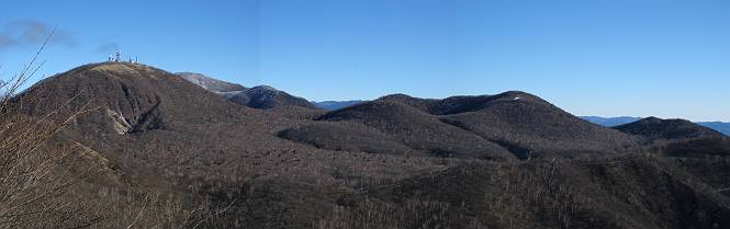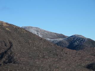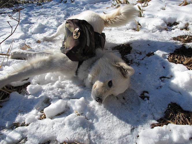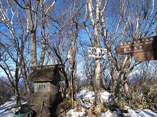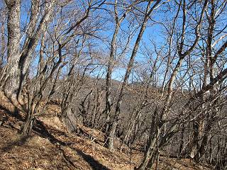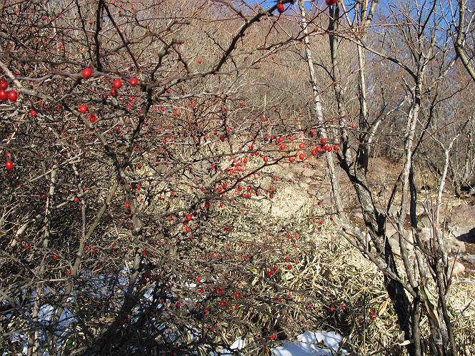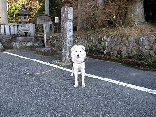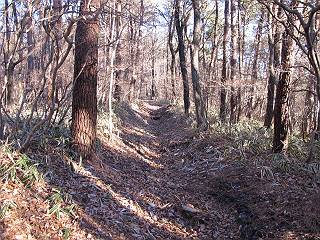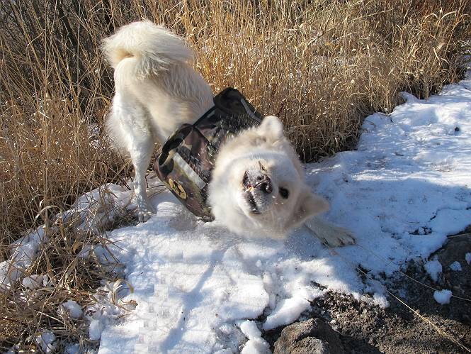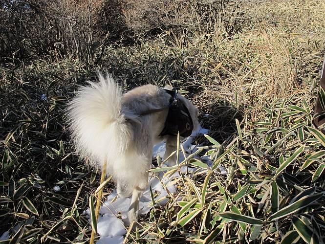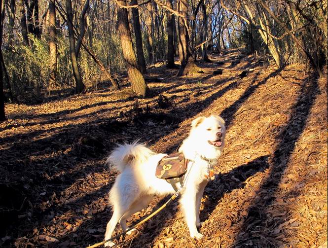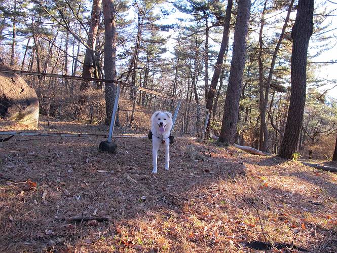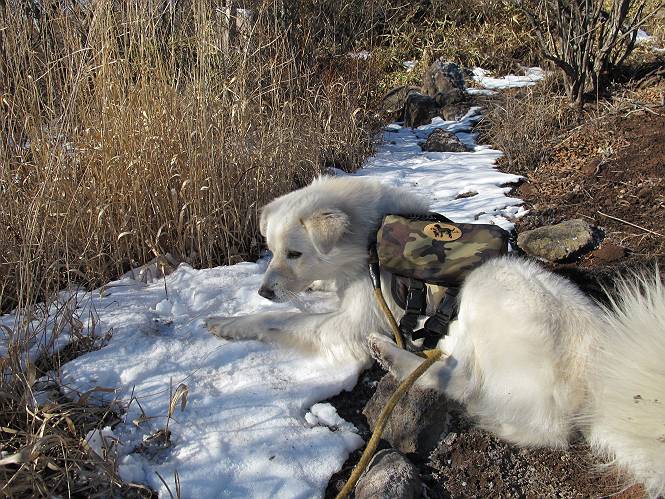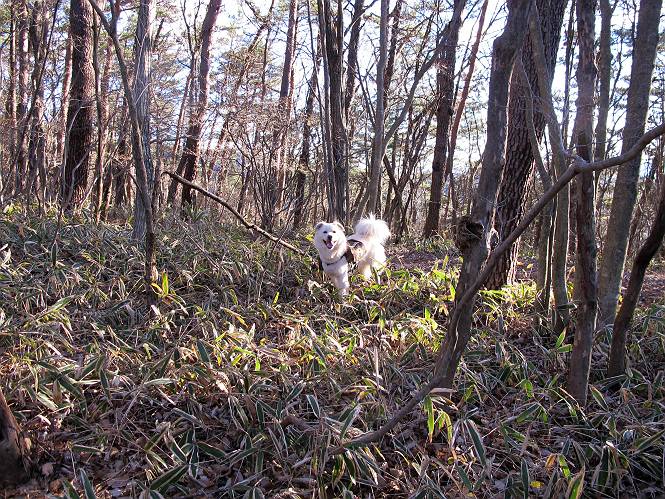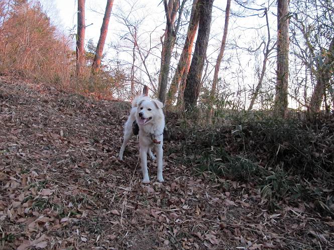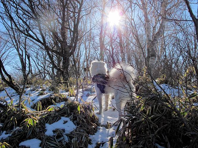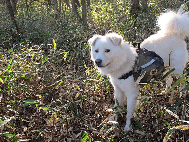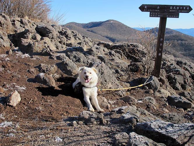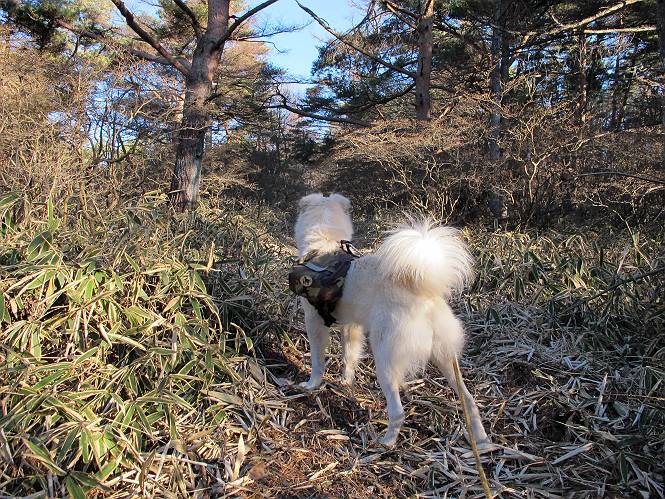 | 平成二十二年十二月十七日 Before 写真集目次へ Next 荒山に雪の降るのを楽しみに待っていましたが、10日はお父さんは独りで大菩薩山へ行ってしまいました。やっと、昨日になって「もう日がないなあ、山頂には雪が少しぐらい残っているだろう、明日行くか」、ということで1年ぶりに三夜沢の赤城神社から荒山を往復してきました。 赤城神社の東側の櫃石へ行く登山道を歩き始めると直ぐに陽が昇りました。 道には落葉が沢山積もって、凸凹がわかりませんでした。 櫃石への分岐点です。左が櫃石、右は緩やかに荒山に通じる尾根へと入ります。 分岐点から急坂に入りました、森の中は朝日に染まってます。 櫃石に着きました、広々として気持ちの良い松林です。 フェンスで囲ってあります。左を回って尾根に入ります。 ここが三角点です、ここから先ほどの道に出合うまで藪漕ぎです。 踏み跡の薄い尾根を進んで行きますと、赤城温泉から来る道と出合います。赤城温泉1.5km、小沼7.5kmだそうです。ここからは道は整備されてます。 雑木と赤松の混生林のようです。 冬枯れの明るい林です。 緩やかな上りが続いてます。 ここから登山道が左に曲ってます。正面の斜面を西に巻いて進むようです。「どっち?」、って言うから登山道に沿って歩きます。 ちょっと進んだ所から富士山が見えました。 昨年歩いた時は、この斜面を真っ直ぐ藪を漕いで抜けました。 ぐるっと回り込んで、大きな岩石の沢のようなところに出ました。ここから上って行きます。 笹とツツジがビッシリ生えてます。丸太の階段が半分ぐらいあります。 ちょっと上ると富士山、南アルプス、八ヶ岳が南に見えました。 南アルプス 八ヶ岳 また少し進むと雪が残ってました。早速頂きました。 急坂を抜けると休憩所に出ました。 メギの木の実だそうです。 丸太の階段を上って“ひさし岩”にでました。周囲の山が良く見えました。 地蔵岳、黒檜山、駒ケ岳、小地蔵岳、長七郎山 ![]() 黒檜山、駒ケ岳は霧氷のようです。 東方向に筑波山が見えました。 岩陰に雪が残ってます。 雪の感触、いいなあ。 「どうですか、ぼくの顔」、「なんだ、その顔は」 荒山の山頂はひさし岩のちょっと先です。 山頂が見えました、到着です。 荒山山頂 山頂の記念写真です。 オヤツを食べて、お父さんからリンゴとビスケットをもらって、美味しかったです。 休憩です、雪に寝そべったり 食べたり どうですか、こんな格好、ぼくは全然冷たくないんですよ。 「なあに、もう帰るんですか、まだ来たばっかりじゃない」 そんなわけで下ることになりました。 休憩所から藪を漕いでしばらく歩くそうです。 雑木林ですが小さい木にリードが時々引っ掛かりまして、外してもらいながら下りました。 また休憩です、もう少しで登山道に出るようです。 登山道はしばらく1本道ですが、「ここどっちだったっけ」、「左だよ」 赤城温泉への道を分けると、道は道ですが、笹が被いかぶった道です。 笹の切れ目から荒山が見えました。 「あそこまで行ってきたんだ」、「忠治、良く歩いたなあ」 落葉の道を下って、赤城神社に戻りました、もっと雪遊びをしたかったのに。また連れてってね。 Before 写真集目次へ Next |