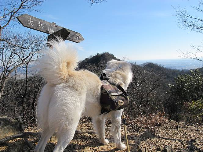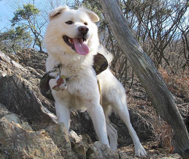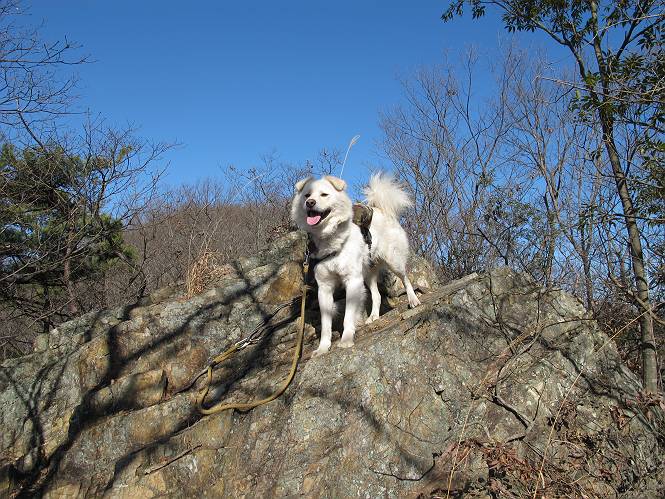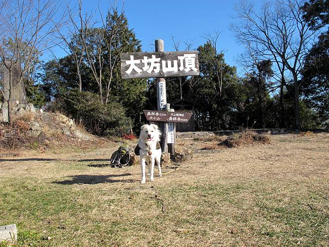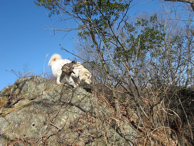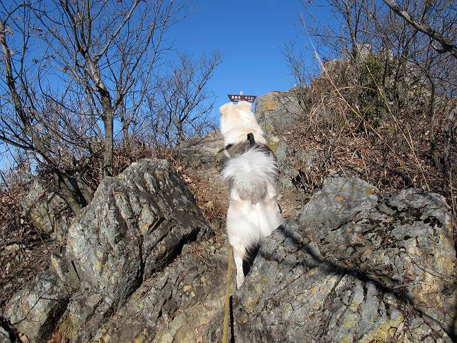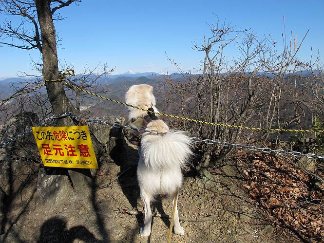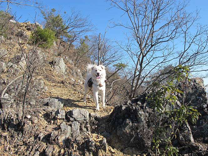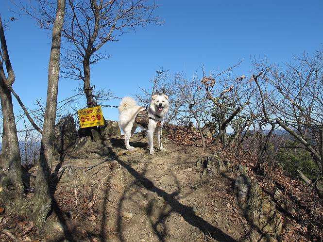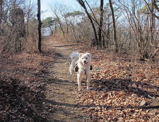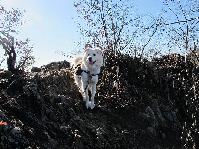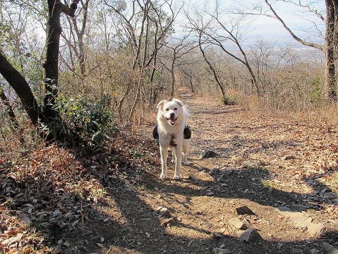 | 平成二十三年一月五日 Before 写真集目次へ Next 今日はぼくの初山です。足利の大小山をぐるっと回ります。大山祇神社前の駐車場を出発して、大坊山、越床峠、妙義山、大小山と歩き山百合学園脇に下って、路上を歩いて駐車場に戻るコースです。 大山祇神社にお参りをして出発です。 丸太の階段を上って、ジグザグした道をしばらく歩くと素晴しい展望が開けます。渡良瀬川をはさんで足利市と邑楽町付近が見えているようです。 遠く秩父の山の後に富士山が見えてます。 西側には浅間山が見えました。見えて街は足利市だそうです。 ここから少し上るとゆるやかになって、真っ直ぐ大坊山の山頂に向かいます。 前の石段を上ると山頂です。 お正月でしめ縄が飾ってあります。 大坊山の山頂です。ここで写真を撮ってもらっていたら、後から来た女の方が、「忠治くん・・」て、ぼくの名前を呼ぶんですよ、いつもHPを見ている方のようです。 小さいお社が奥にあります。 ここから尾根伝いに歩きます。岩が露出していて、登ったり下ったりしながらのコースで楽しいですよ。 長林寺の分岐点に出ました。 ここも眺めが良いですよ。雪を頂いた赤城山から足尾、日光方面の山々が見えます。 赤城山です。下の街は足利市の利保町周辺だそうです。 男体山と女峰山方面です。 通ってきた大坊山です。 ぐるっと回って向かう大小山です。 「こっちはどこ?」、「佐野市になるのかな」 「あまり前に出ると危ないぞ」、「ハーイ」 いくつか小さいピークを越えて、砕石場の上のピークに来ました。採石場は仕事をしてまして、ガラガラとうるさいですね。 このピークから越床峠に下るようです。 スゴイですね、この下、大きな崖になってます。 採石場を上から見るとコワイですね。 ここからトラロープに沿って急坂を下ります。 途中に休憩所がありましたので、寄りました。ここから見た男体山です。 葛生の山も良く見えました。 もう少し下ると越床峠に出ました。ここは十字路になっているそうです。 また上りにかかります、登りつめると 北西方向には、採石場と足利の山間の人家、と赤城山が見えてました。 続いて北方向に袈裟丸山、皇海山、日光白根山が見えました。 南西方向には歩いてきた大坊山 南東方向には大小山が見えてます。 また露岩の尾根が続いてます、上ったり下がったり、楽しいな。 「おっ!、そっちじゃないぞ」、「ハーイ」 ここは上に行くのかな そうらしいぞ 「バッチリだってさ」 「やったね」 妙義山(大小山)の西のピークに着きました。ここから山百合学園の方へ行けるそうです。 ここを下って次が妙義山です、もう少しだ。ちょっと下ったところに岩陰でお食事中のグループに会いました。ぼくを見てビックリして、コーヒーをこぼしてしまったようです、ゴメンナサイね。 妙義山到着です。まわりに10人ほどいますよ。まだ、次々とやって来るようです。オヤツとお水を頂いて南の大小山へ向かいます。 ここが大小山です。東側の崖に大きな“大小”の文字があります。 尾根伝いに下ると分岐点があちらこちらにあります。 大坊山が近づいた感じがしますね。左の中腹にある建物が大山祇神社です。 まだ2km以上あるらしいですよ。 山百合学園脇に下山しました。あとは道路をあるきます。 一周して駐車場の隣にある展望台に着きました。ここも素晴しい景色が見えますよ。オススメポイントだそうです。夜景もきれいですって。ああ、楽しかったなあ、今日は30人位会ったかな、犬の嫌いそうな人がいなくって良かった。そう、尾根でワンちゃんに会ったよ、ぼく、ワンワンって吠えちゃった、ゴメンネ。 Before 写真集目次へ Next |