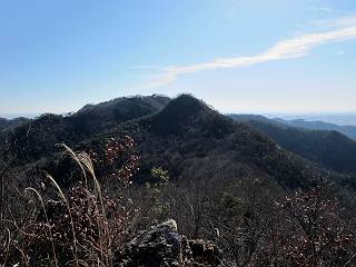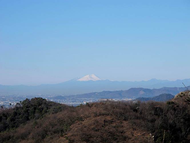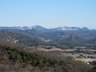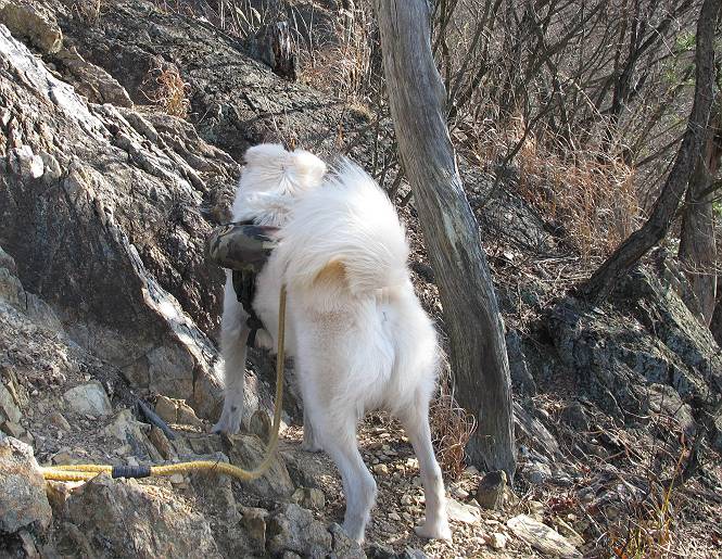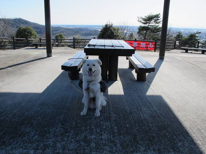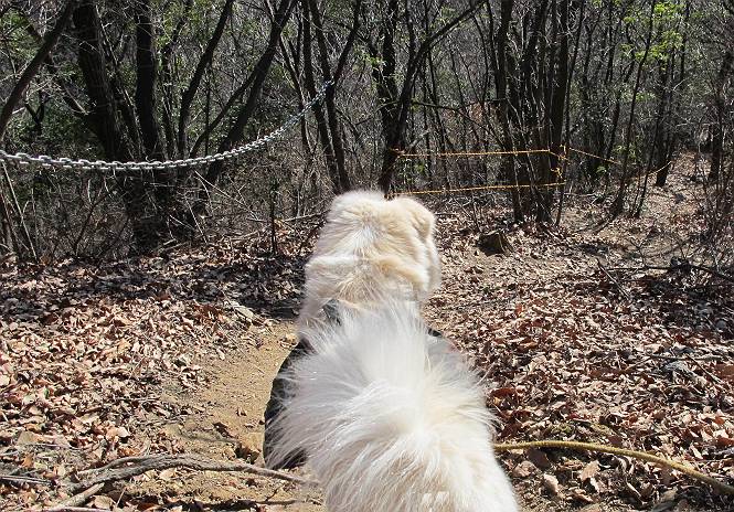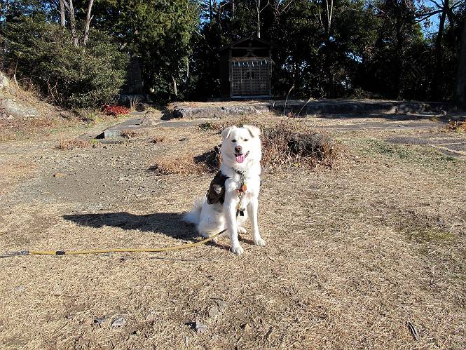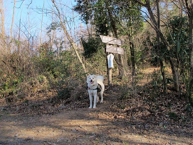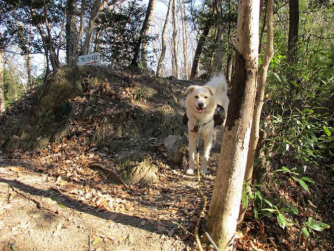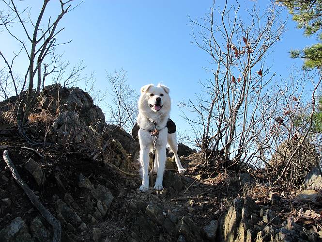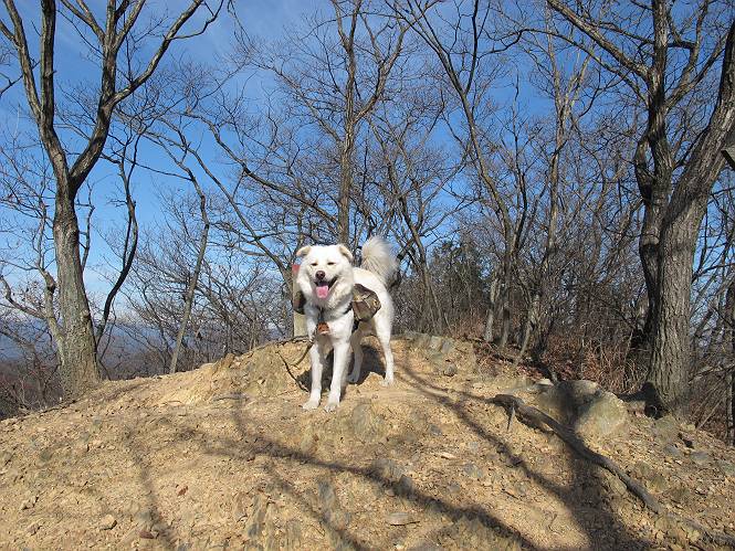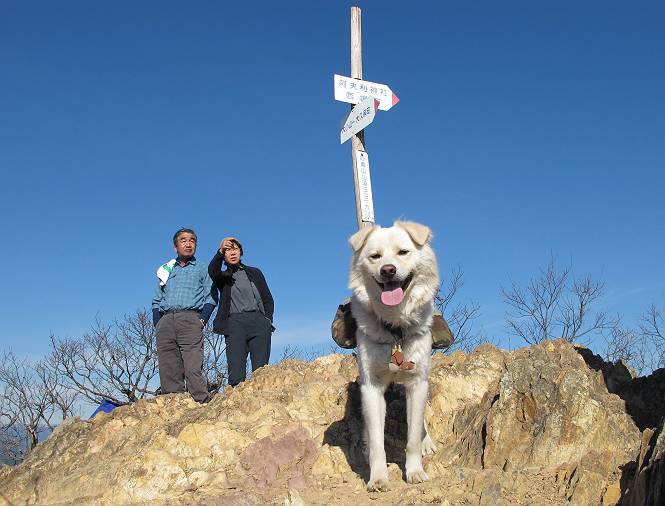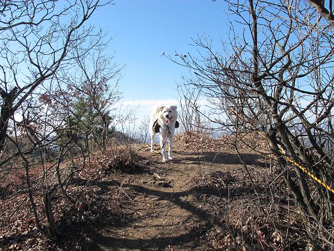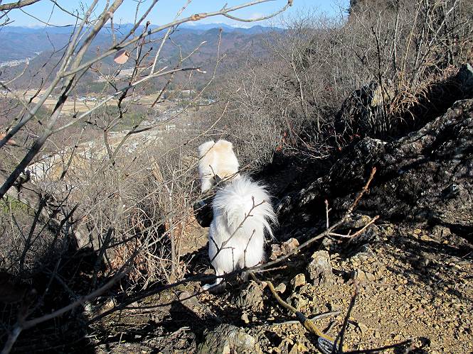 | 平成二十三年一月五日 Before 写真集目次へ Next 今日はぼくの初山です。足利の大小山をぐるっと回ります。大山祇神社前の駐車場を出発して、大坊山、越床峠、妙義山、大小山と歩き山百合学園脇に下って、路上を歩いて駐車場に戻るコースです。 大山祇神社にお参りをして出発です。 丸太の階段を上って、ジグザグした道をしばらく歩くと素晴しい展望が開けます。渡良瀬川をはさんで足利市と邑楽町付近が見えているようです。 遠く秩父の山の後に富士山が見えてます。 西側には浅間山が見えました。見えて街は足利市だそうです。 ここから少し上るとゆるやかになって、真っ直ぐ大坊山の山頂に向かいます。 前の石段を上ると山頂です。 お正月でしめ縄が飾ってあります。 大坊山の山頂です。ここで写真を撮ってもらっていたら、後から来た女の方が、「忠治くん・・」て、ぼくの名前を呼ぶんですよ、いつもHPを見ている方のようです。 小さいお社が奥にあります。 ここから尾根伝いに歩きます。岩が露出していて、登ったり下ったりしながらのコースで楽しいですよ。 長林寺の分岐点に出ました。 ここも眺めが良いですよ。雪を頂いた赤城山から足尾、日光方面の山々が見えます。 赤城山です。下の街は足利市の利保町周辺だそうです。 男体山と女峰山方面です。 通ってきた大坊山です。 ぐるっと回って向かう大小山です。 「こっちはどこ?」、「佐野市になるのかな」 「あまり前に出ると危ないぞ」、「ハーイ」 いくつか小さいピークを越えて、砕石場の上のピークに来ました。採石場は仕事をしてまして、ガラガラとうるさいですね。 このピークから越床峠に下るようです。 スゴイですね、この下、大きな崖になってます。 採石場を上から見るとコワイですね。 ここからトラロープに沿って急坂を下ります。 途中に休憩所がありましたので、寄りました。ここから見た男体山です。 葛生の山も良く見えました。 もう少し下ると越床峠に出ました。ここは十字路になっているそうです。 また上りにかかります、登りつめると 北西方向には、採石場と足利の山間の人家、と赤城山が見えてました。 続いて北方向に袈裟丸山、皇海山、日光白根山が見えました。 南西方向には歩いてきた大坊山 南東方向には大小山が見えてます。 また露岩の尾根が続いてます、上ったり下がったり、楽しいな。 「おっ!、そっちじゃないぞ」、「ハーイ」 ここは上に行くのかな そうらしいぞ 「バッチリだってさ」 「やったね」 妙義山(大小山)の西のピークに着きました。ここから山百合学園の方へ行けるそうです。 ここを下って次が妙義山です、もう少しだ。ちょっと下ったところに岩陰でお食事中のグループに会いました。ぼくを見てビックリして、コーヒーをこぼしてしまったようです、ゴメンナサイね。 妙義山到着です。まわりに10人ほどいますよ。まだ、次々とやって来るようです。オヤツとお水を頂いて南の大小山へ向かいます。 ここが大小山です。東側の崖に大きな“大小”の文字があります。 尾根伝いに下ると分岐点があちらこちらにあります。 大坊山が近づいた感じがしますね。左の中腹にある建物が大山祇神社です。 まだ2km以上あるらしいですよ。 山百合学園脇に下山しました。あとは道路をあるきます。 一周して駐車場の隣にある展望台に着きました。ここも素晴しい景色が見えますよ。オススメポイントだそうです。夜景もきれいですって。ああ、楽しかったなあ、今日は30人位会ったかな、犬の嫌いそうな人がいなくって良かった。そう、尾根でワンちゃんに会ったよ、ぼく、ワンワンって吠えちゃった、ゴメンネ。 Before 写真集目次へ Next |